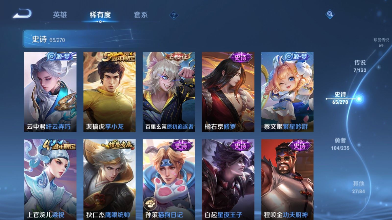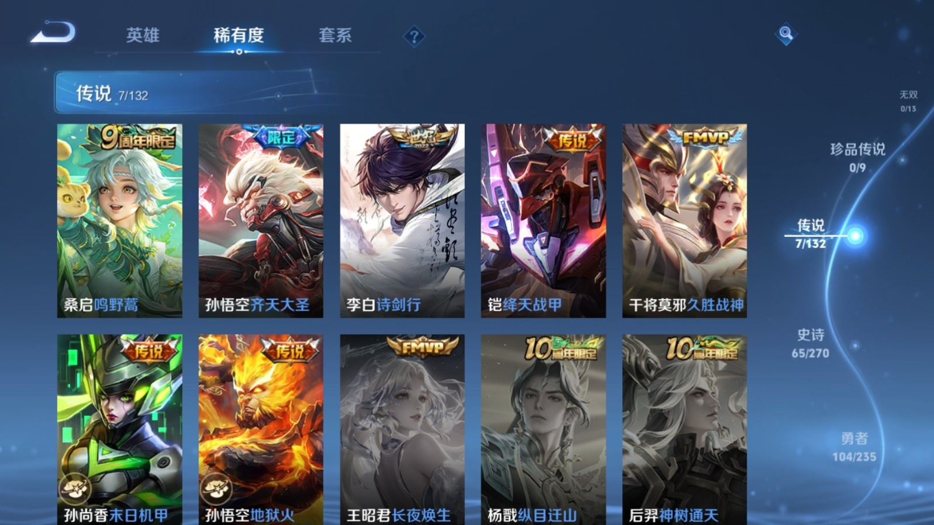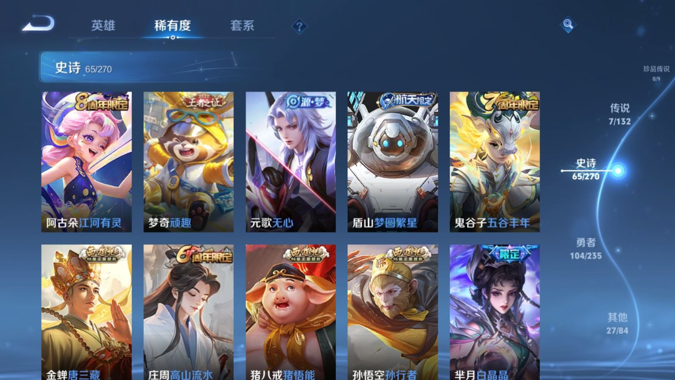 128英雄-204皮肤v7-1典藏7传说 2星传说 幽冥火 未来机甲【全皮英雄】 金蝉全皮 【典藏】 全息碎影 【传说】 鸣野蒿 齐天大圣 绛天战甲 诗剑行 地狱火 久胜战神 末日机甲女 【热门】至尊宝 白晶晶 热情桑巴 唐三藏 孙行者 猪悟能 冰冠公主 原初追逐者 梁祝 暗夜猫娘 电玩小子 黄