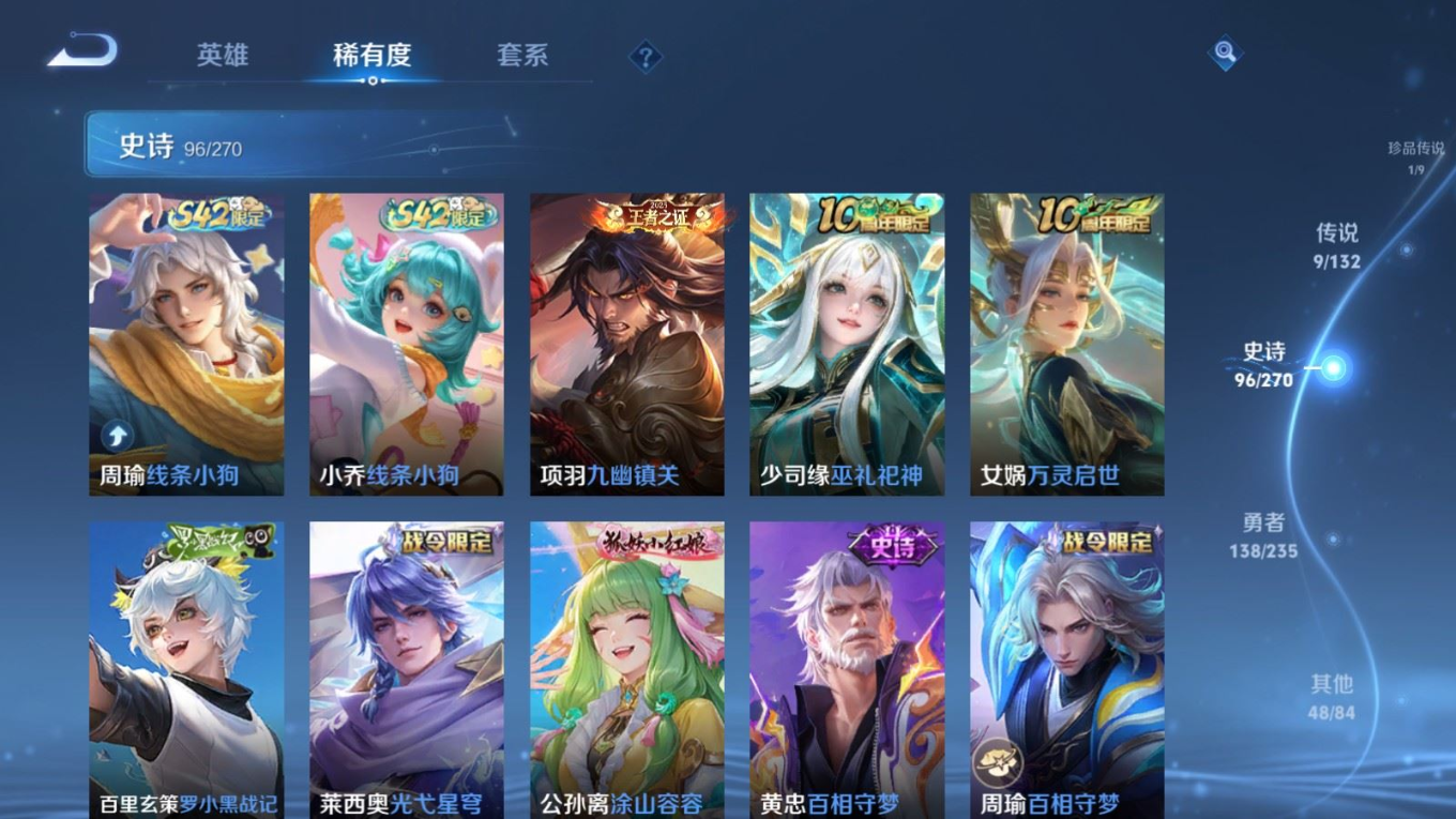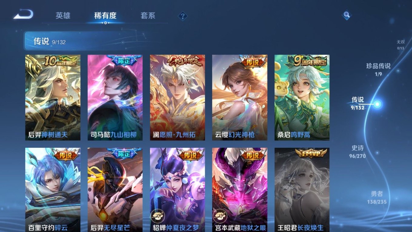 127英雄-293皮肤v7-1典藏1珍品传说9传说 3星传说 时之思念 幽冥之眼 金色仲夏夜【全皮英雄】 司马懿全皮 影全皮 【典藏】 星域神启 【珍品传说】 黑崎一护 【传说】 九山相柳 神树通天 幻光神呛 愿照九州拓 鸣野蒿 无尽星芒 碎云 仲夏夜之梦 地狱之眼 【热门】万灵启世 巫礼祀神