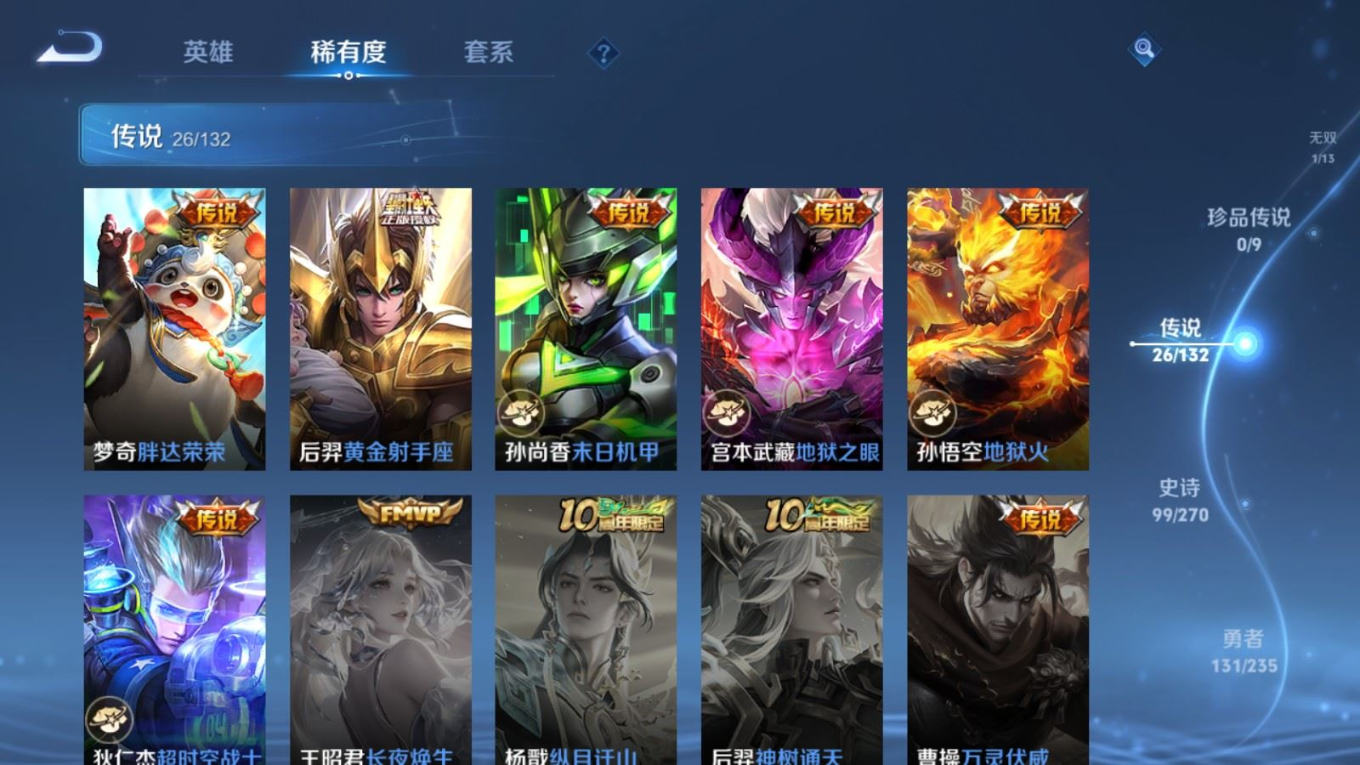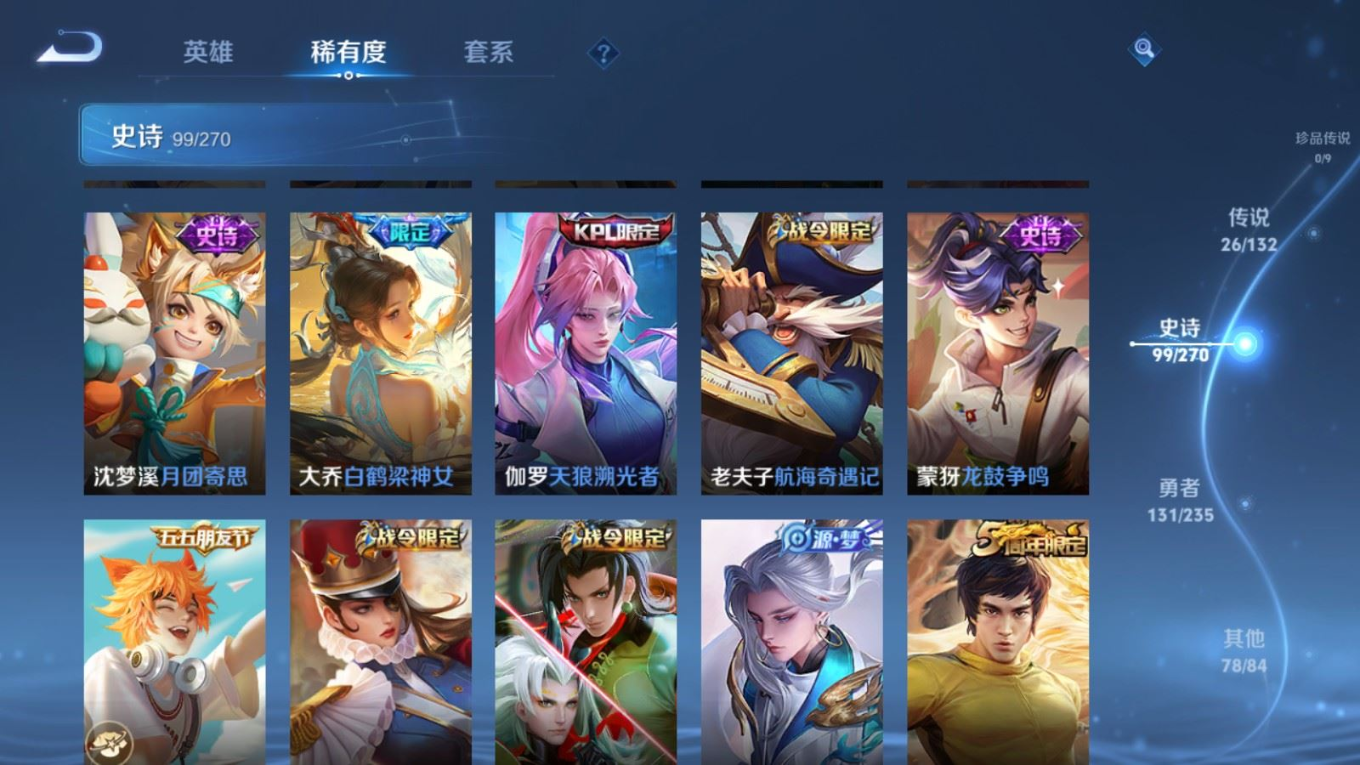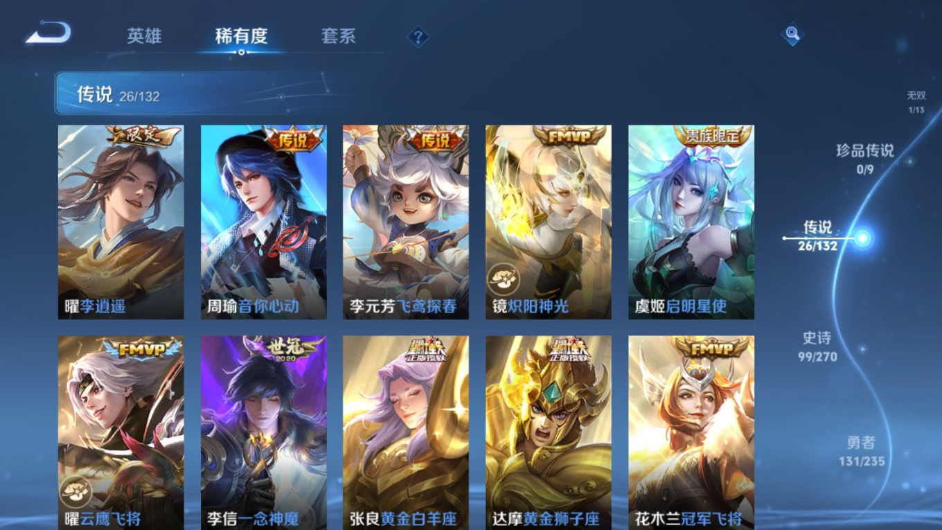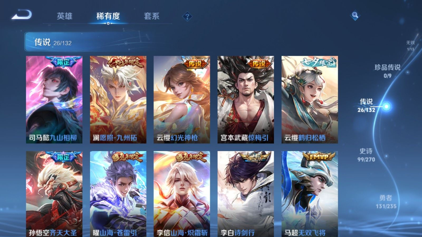 128英雄-336皮肤v9-1典藏1无双26传说 2星传说 幽冥火 未来机甲【全皮英雄】 云缨全皮 李信全皮 达摩全皮 影全皮 【典藏】 弑呛猎影 【无双】 时之魔女 【传说】 惊梅引 九山相柳 幻光神呛 愿照九州拓 启明星使 山海苍雷引 山海炽霜斩 李 齐天大圣 鹤归松栖女 音你心动男 无