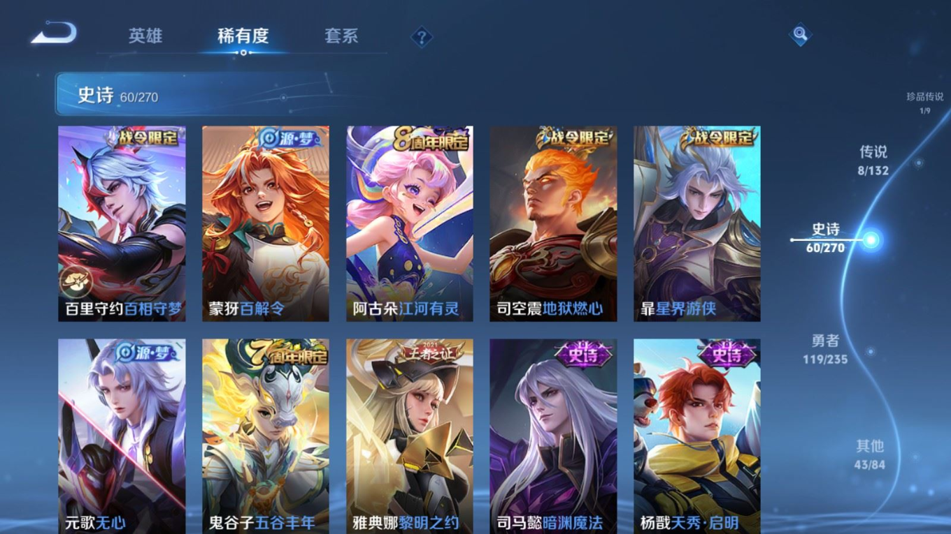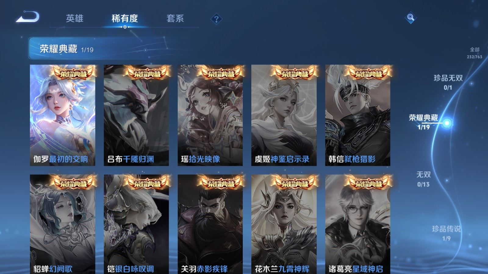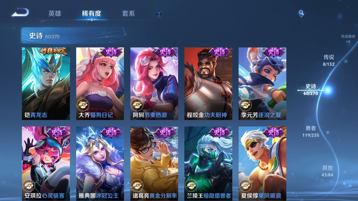 125英雄-232皮肤v7-1典藏1珍品传说8传说 【典藏】 最初的交响 【珍品传说】 酷洛米之心 【传说】 神树通天 愿照岁时盈 鸣野蒿 时之奇旅大乔 诗剑行 云鹰飞将 黄金射手座 胖达荣荣 【热门】万灵启世 涂山容容 青龙志 大圣娶亲 冰冠公主 暗影游猎 黎明之约 狂想玩偶喵 云间偶戏 暗夜