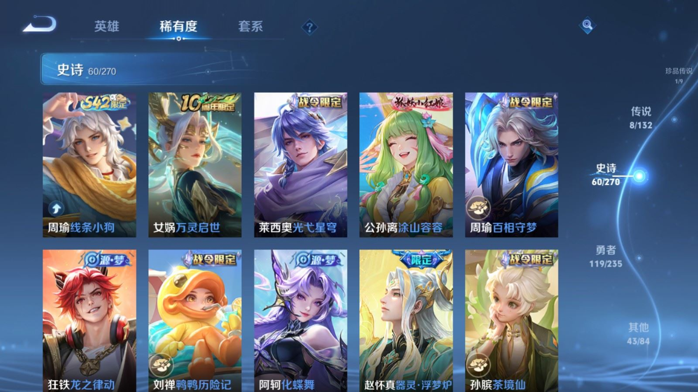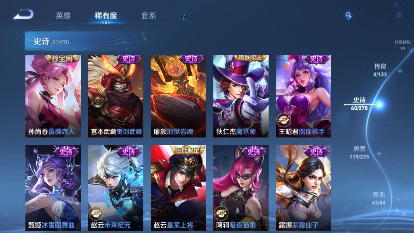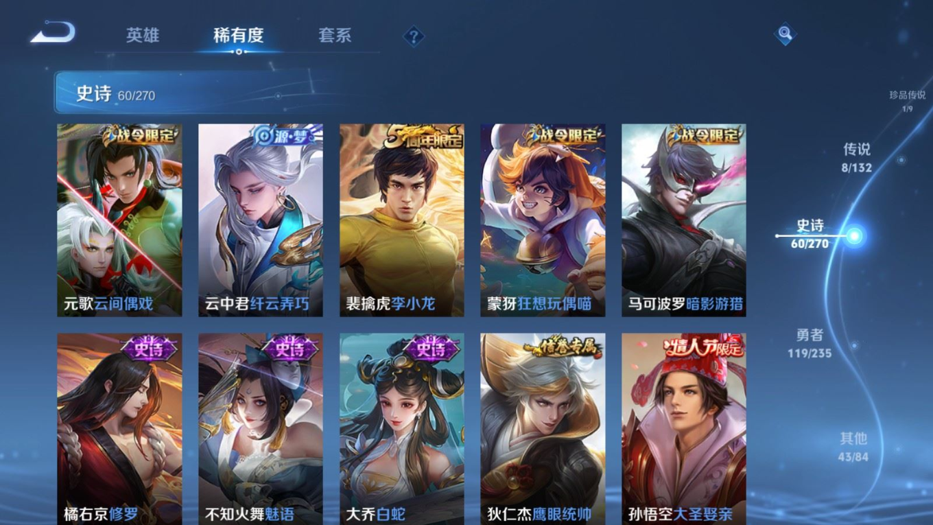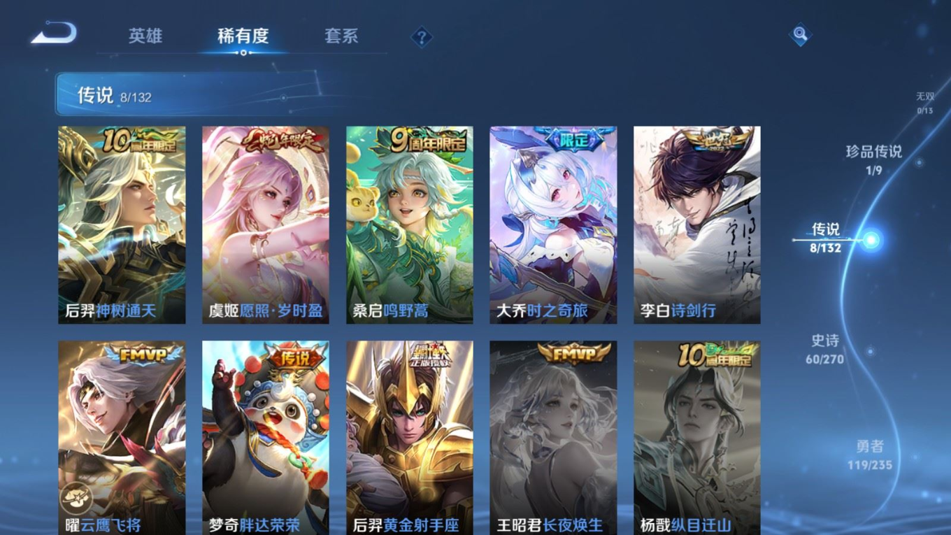 125英雄-232皮肤v7-1典藏1珍品传说8传说 【典藏】 最初的交响 【珍品传说】 酷洛米之心 【传说】 神树通天 愿照岁时盈 鸣野蒿 时之奇旅大乔 诗剑行 云鹰飞将 黄金射手座 胖达荣荣 【热门】万灵启世 涂山容容 青龙志 大圣娶亲 冰冠公主 暗影游猎 黎明之约 狂想玩偶喵 云间偶戏 暗夜