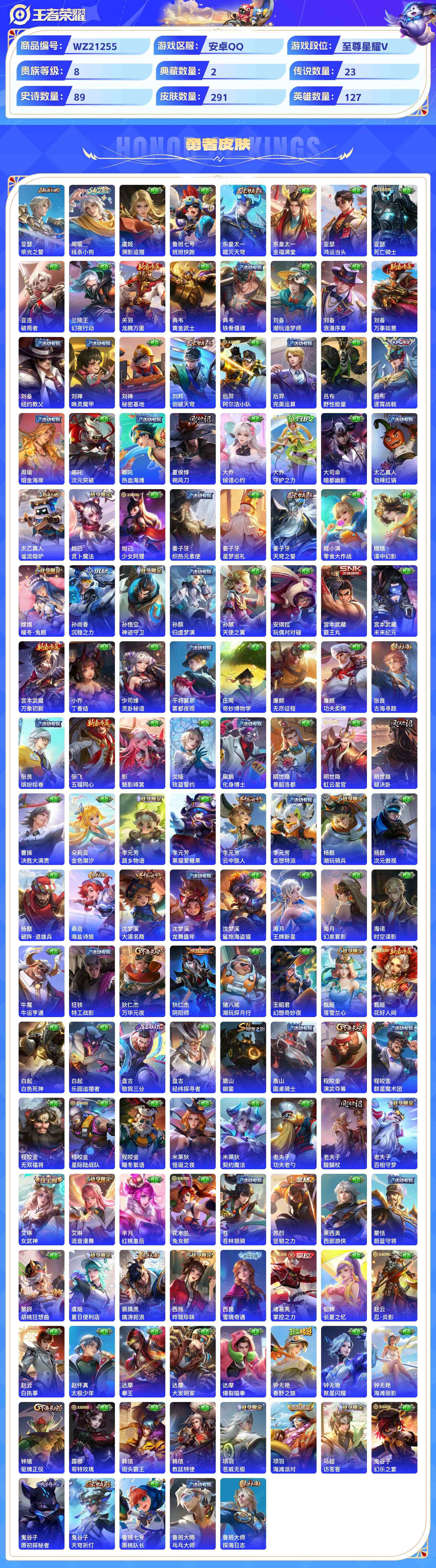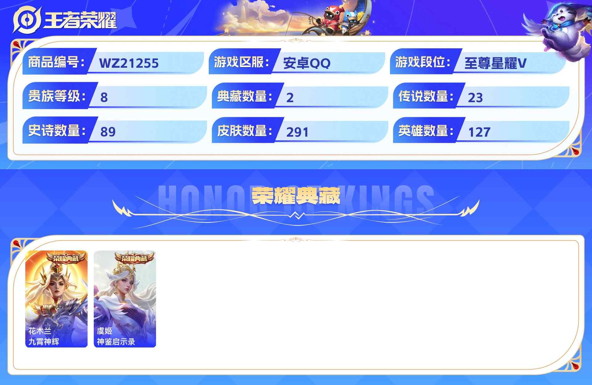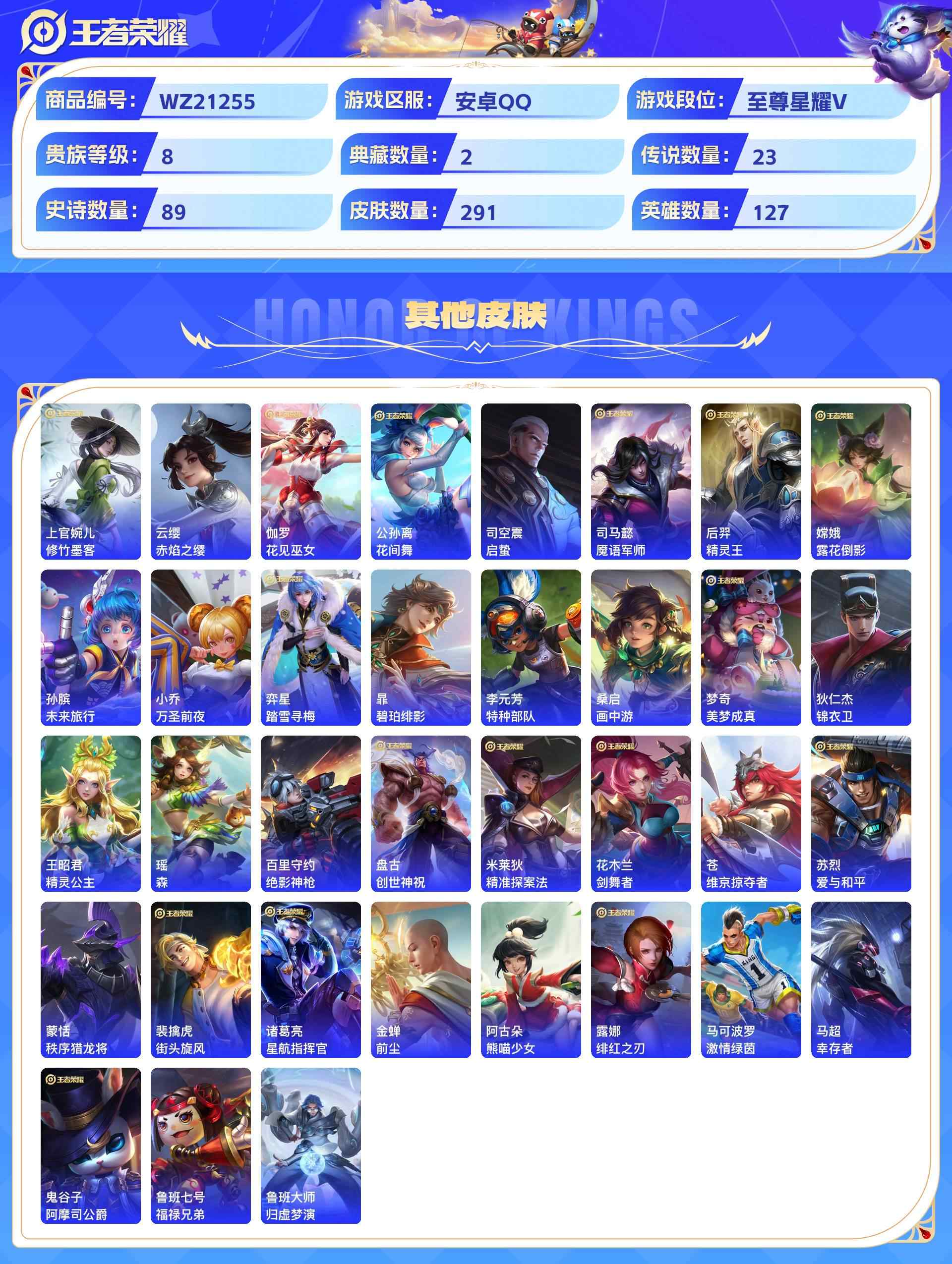 wz21255|典藏珍品小号低价出1星传说14个性按键安卓qq 291皮 贵族8级 2典藏 1珍品传说 23传说 89史诗【荣耀典藏】九霄神辉神鉴启示录【珍品传说】怪盗基德【传说皮肤】幻光神呛炽翼辉光愿照·山河定黄金射手座浮生妄愿照·千秋盛