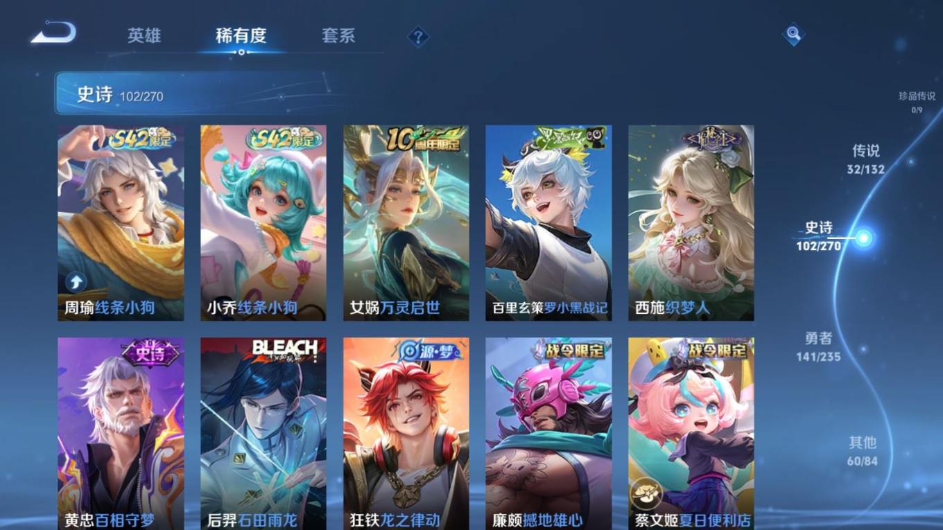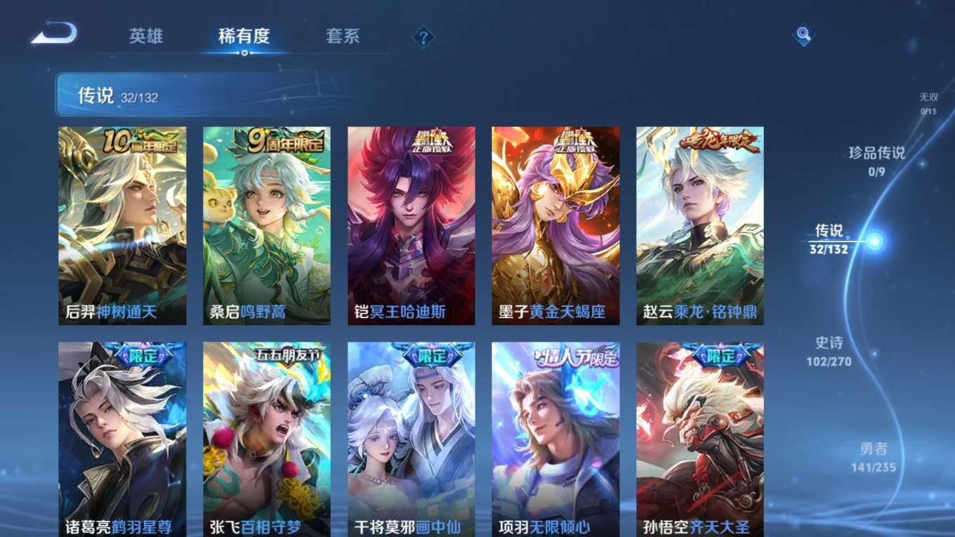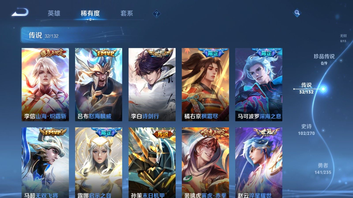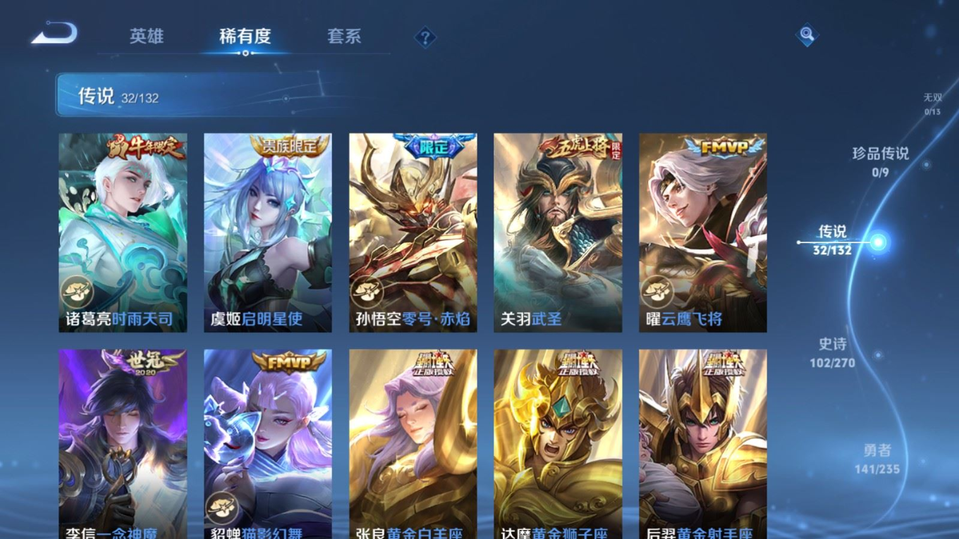 127英雄-337皮肤v9-2典藏32传说 1星传说 幽冥之眼【全皮英雄】 李信全皮 金蝉全皮 【典藏】 无限飓风号 银白咏叹调 【传说】 黄金天蝎座 乘龙铭钟鼎 神树通天 鸣野蒿 鹤羽星尊 启明星使 时雨天司 寅虎赤拳 山海炽霜斩 冥王哈迪斯 武圣 零号赤焰 枫霜尽 齐天大圣 画中仙 无限倾心