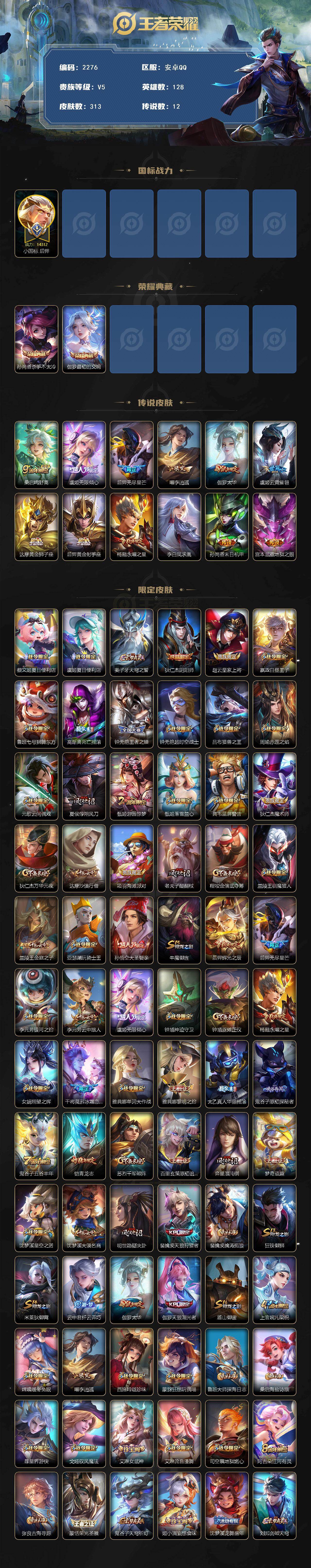 128英雄-313皮肤-【2276】67段发育路 小国后羿 6万战六金标 顶级射手号 连体和平三粉二特一车 安卓q-v5-至尊星耀iii段位-128英雄-313皮肤-2典藏皮肤-12传说-83史诗 【英雄全皮】:刘禅全皮,戈娅全皮 【荣耀典藏】:孙尚香杀手不太冷,伽罗最初的交响 【传说皮肤】:桑启鸣野蒿,虞姬无限倾心,后羿无尽星芒,曜李 ,伽罗太华,虞姬云霓雀翎,达摩黄金狮子座,后羿黄金射手座,杨戬永曜之星,李白