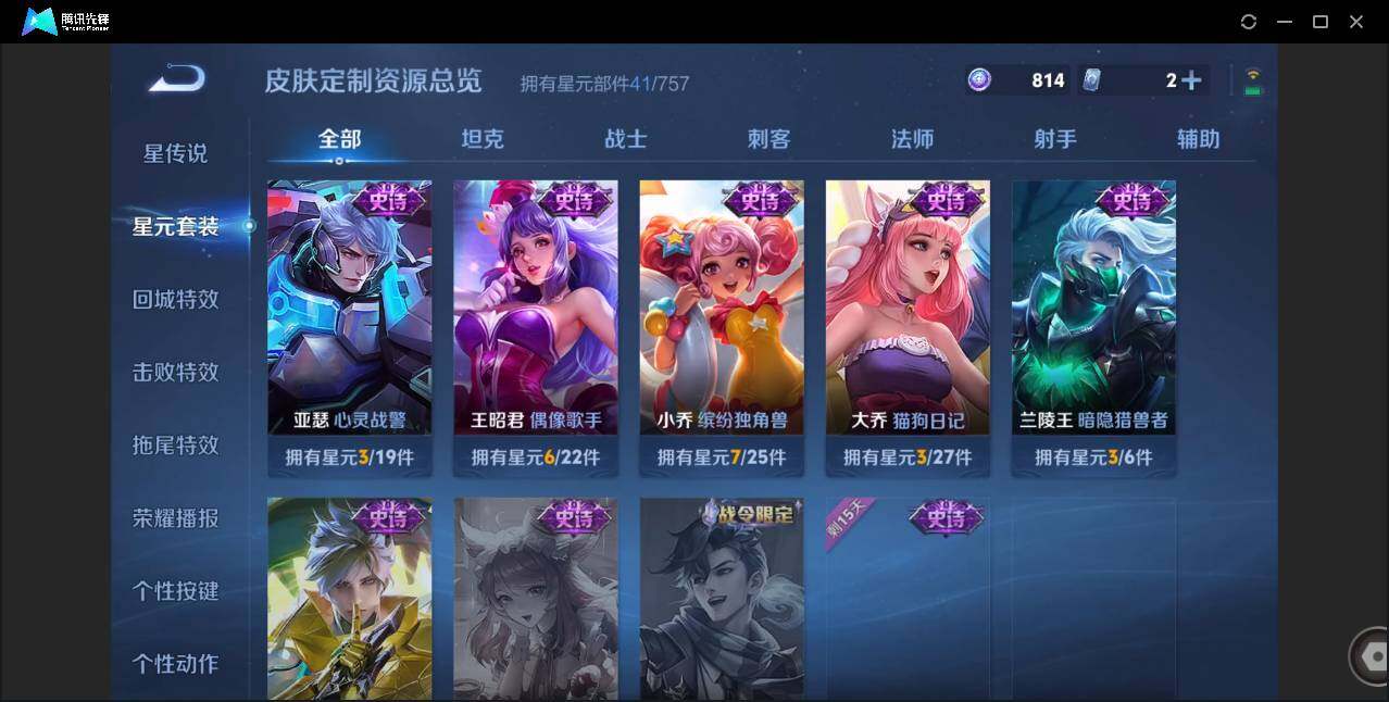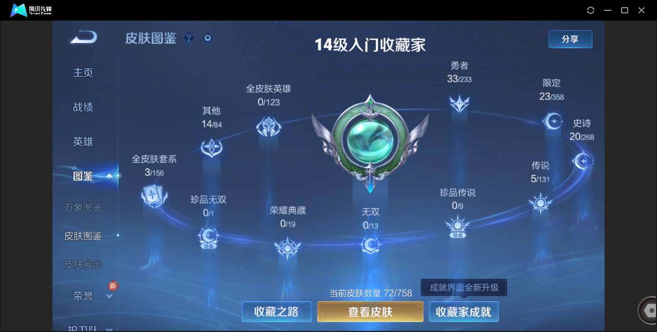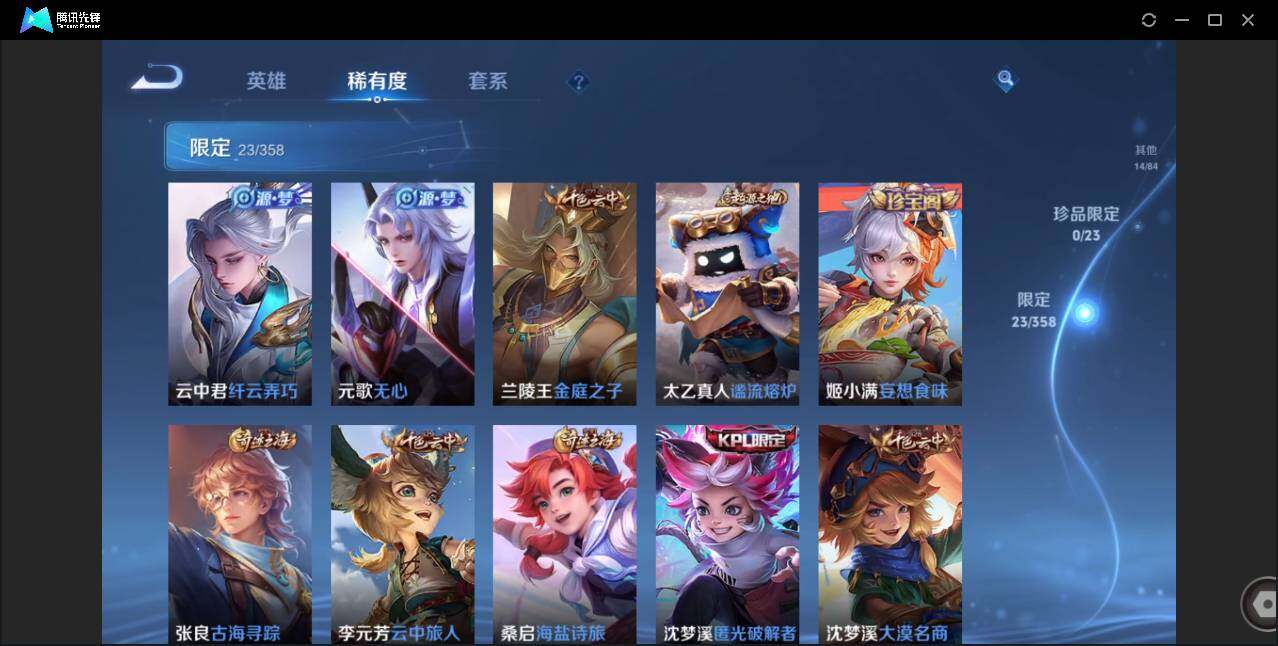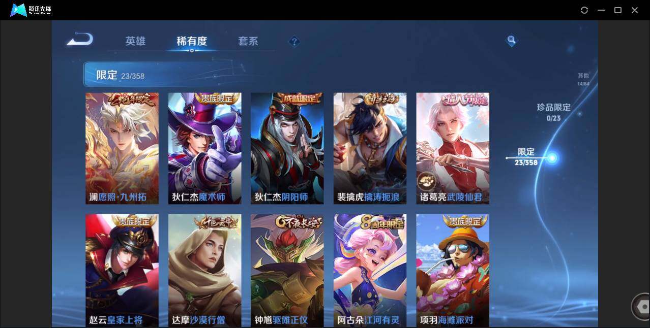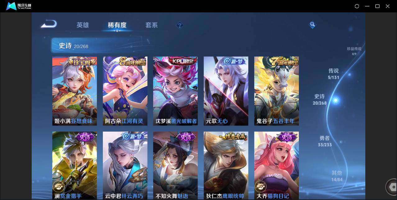 贵族0/皮肤72/传说5/史诗20/英雄85/澜愿照九州拓/云缨幻光神呛/东皇太一灼幽烈阳/曜云鹰飞将/诸葛亮武陵仙君/狄仁杰阴阳师/赵云皇家上将/元歌无心/狄仁杰魔术师/达摩沙漠行僧/项羽海滩派对/兰陵王金庭之子/李元芳云中旅人/钟馗驱傩正仪/鬼谷子五谷丰年/沈梦溪大漠名商/沈梦溪匿光破解者/裴擒虎擒涛扼浪/云中君纤云弄巧/鲁班大师探海日志/桑启海盐诗旅/阿古朵江河有灵/张良古海寻踪/鬼谷子天穹祈灯/姬小满妄想食味/周瑜熔金海岸/太乙真人谧流熔炉/王昭君偶像歌手/孙尚香水果甜心/墨子金属风暴/刘禅绅士熊喵/小乔缤纷独角兽/兰陵王暗隐猎兽者/亚瑟心灵战警/雅典娜冰冠公主/大乔猫狗日记/狄仁杰鹰眼统帅/不知火舞魅语/澜赏金猎手/韩信教廷特使/达摩大发明家/白起白色死神/典韦黄金武士/亚瑟死亡骑士/花木兰兔女郎/张飞五福同心/甄姬花好人间/宫本武藏万象初新/后羿阿尔法小队/狂铁命运角斗场/老夫子功夫老勺/吕布野性能量/张良缤纷绘卷/蒙犽胡桃狂想曲/蒙恬蔚蓝守将/李元芳妄想特派/曹操决胜大满贯/廉颇功夫炙烤/孙膑未来旅行/李白范海辛/马可波罗激情绿茵/苍维京掠夺者/大乔伊势巫女/干将莫邪第七人偶/公孙离花间舞/裴擒虎街头旋风/元歌午夜歌剧院/上官婉儿修竹墨客/瑶森/云中君荷鲁斯之眼/曜归虚梦演/澜孤猎
