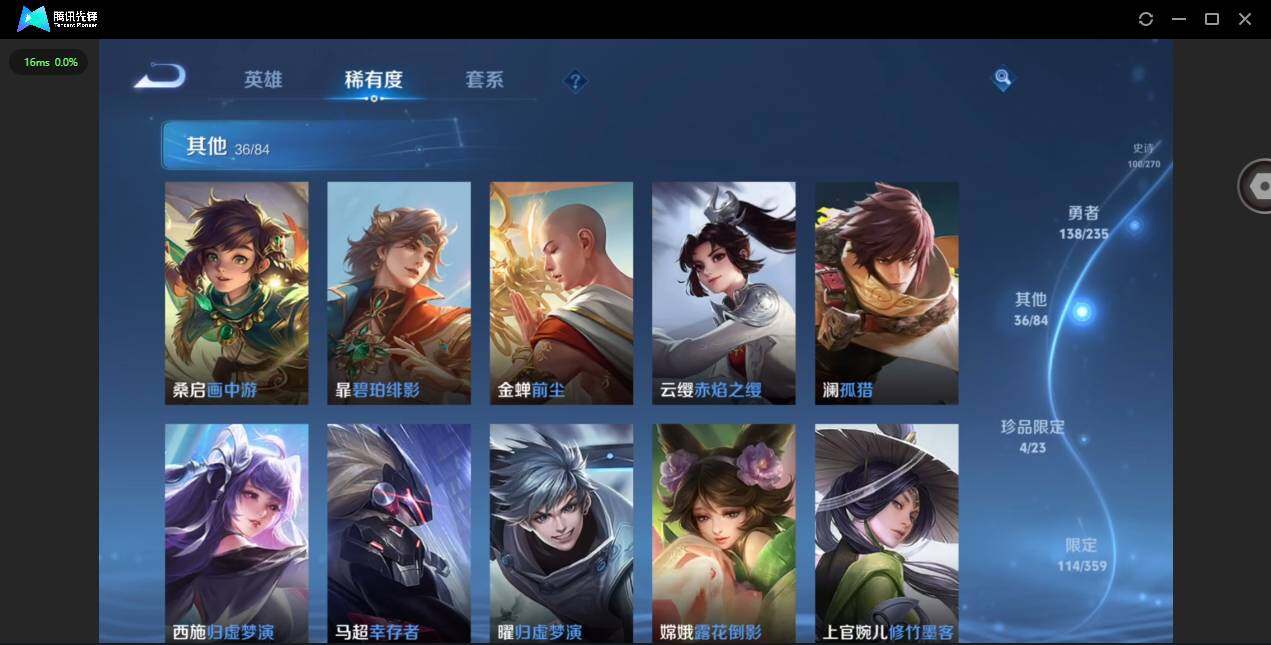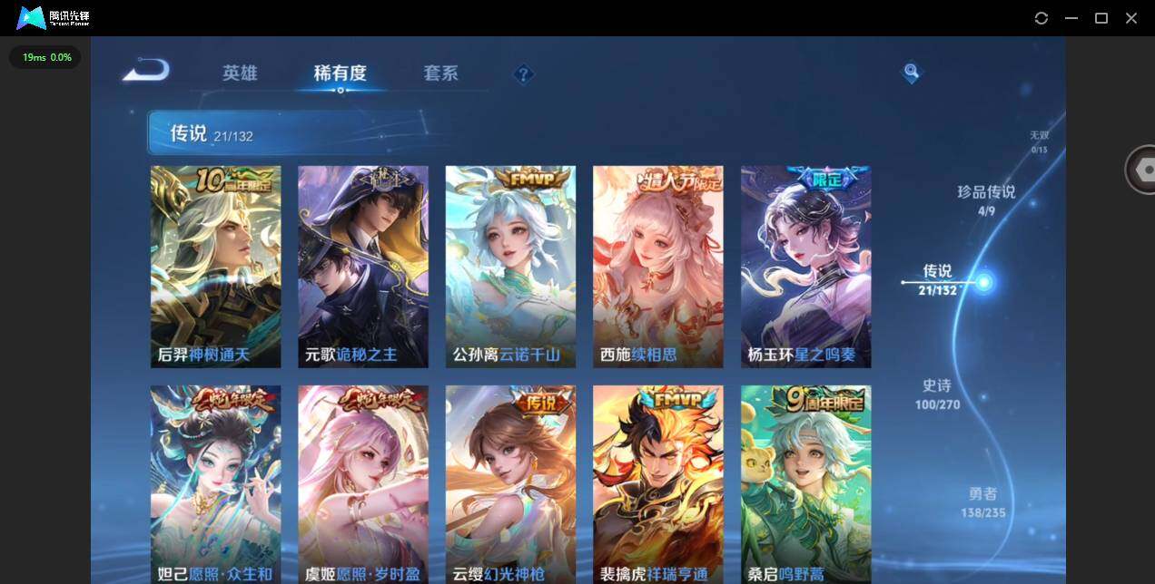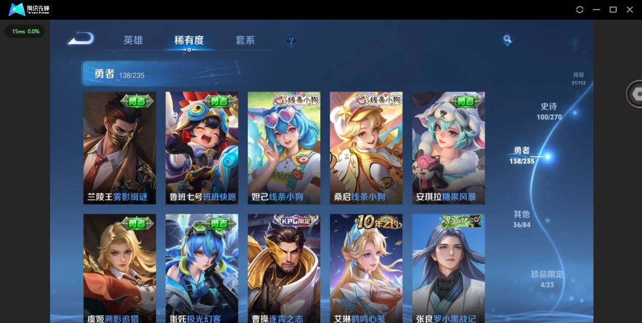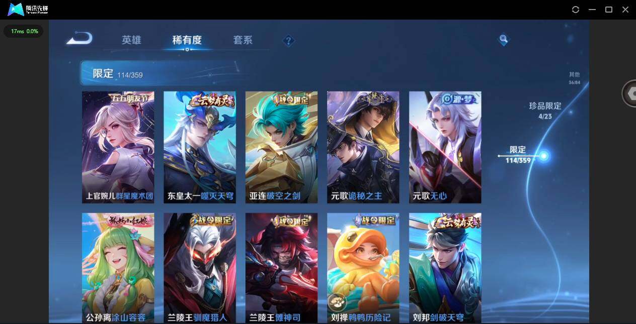 2447099-贵族等级: v8 英雄数: 128 皮肤数: 301 荣耀水晶: 天鹅之梦拾光映像 珍品传说: 怪盗基德器灵·落星盏酷洛米之心大耳狗之梦 星传说: 金色仲夏夜 传说皮: 黄金狮子座久胜战神仲夏夜之梦音你心动-小乔飞鸢探春山海·炽霜斩黄金天蝎座朵莉亚心动手记铠冥王哈迪斯牧神诗旅幻光神呛祥瑞亨通星之鸣奏续相思云诺千山诡秘之主神树通天 限定皮