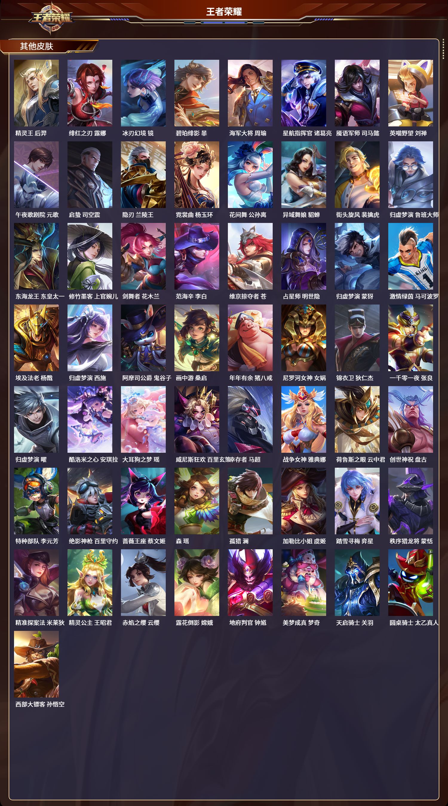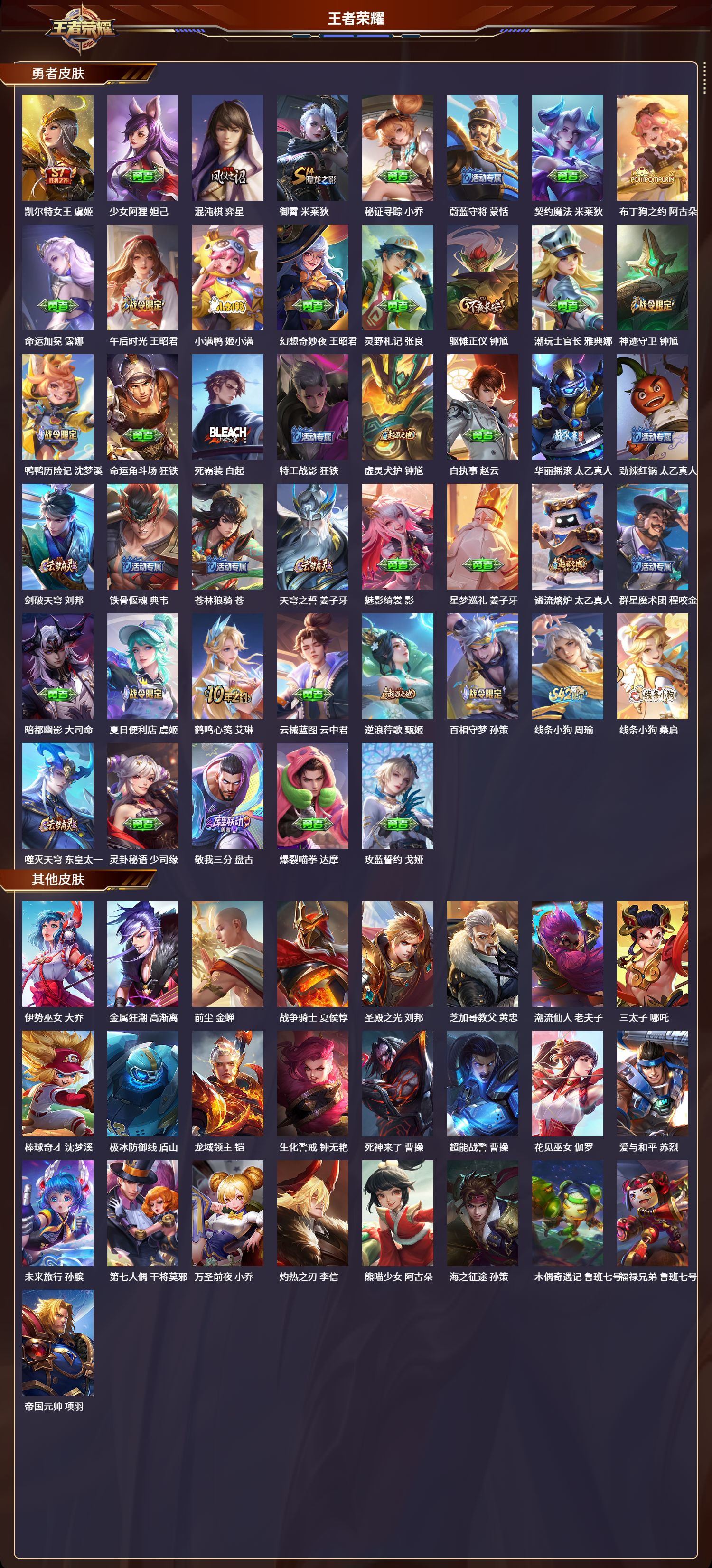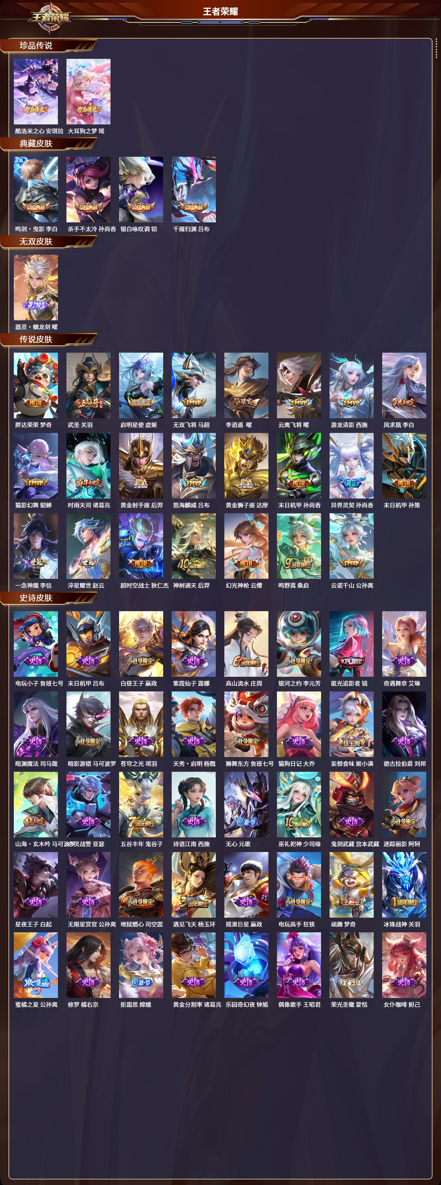 128英雄-404皮肤-苹果qq/最强王者/404皮肤/128英雄/4典藏/0珍品无双/1无双/2珍品传说/23传说/128史诗/9稀有英雄【2 珍品传说】酷洛米之心 安琪拉大耳狗之梦 瑶【4 典藏皮肤】鸣剑·曳影 李白杀手不太冷 孙尚香银白咏叹调 铠千魇归渊 吕布【1 无双皮肤】器灵·螭龙剑 曜【23 传说皮肤】胖达荣荣 梦奇武圣 关羽启明星使 虞姬无双飞将 马超李 曜云鹰飞将 曜游龙清