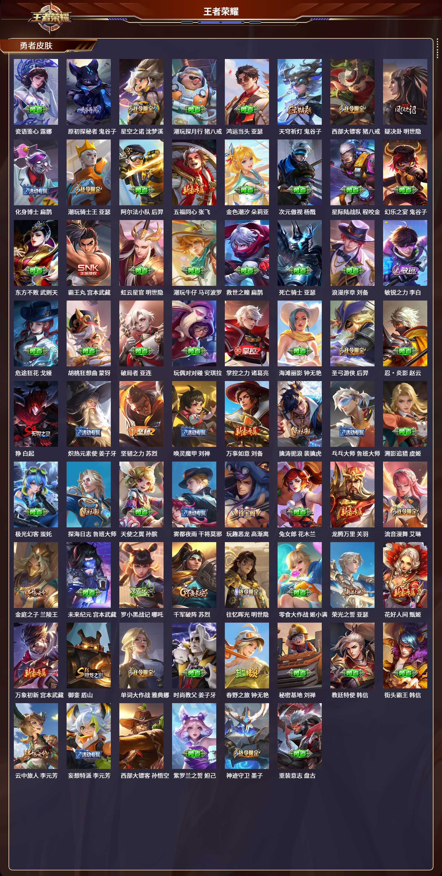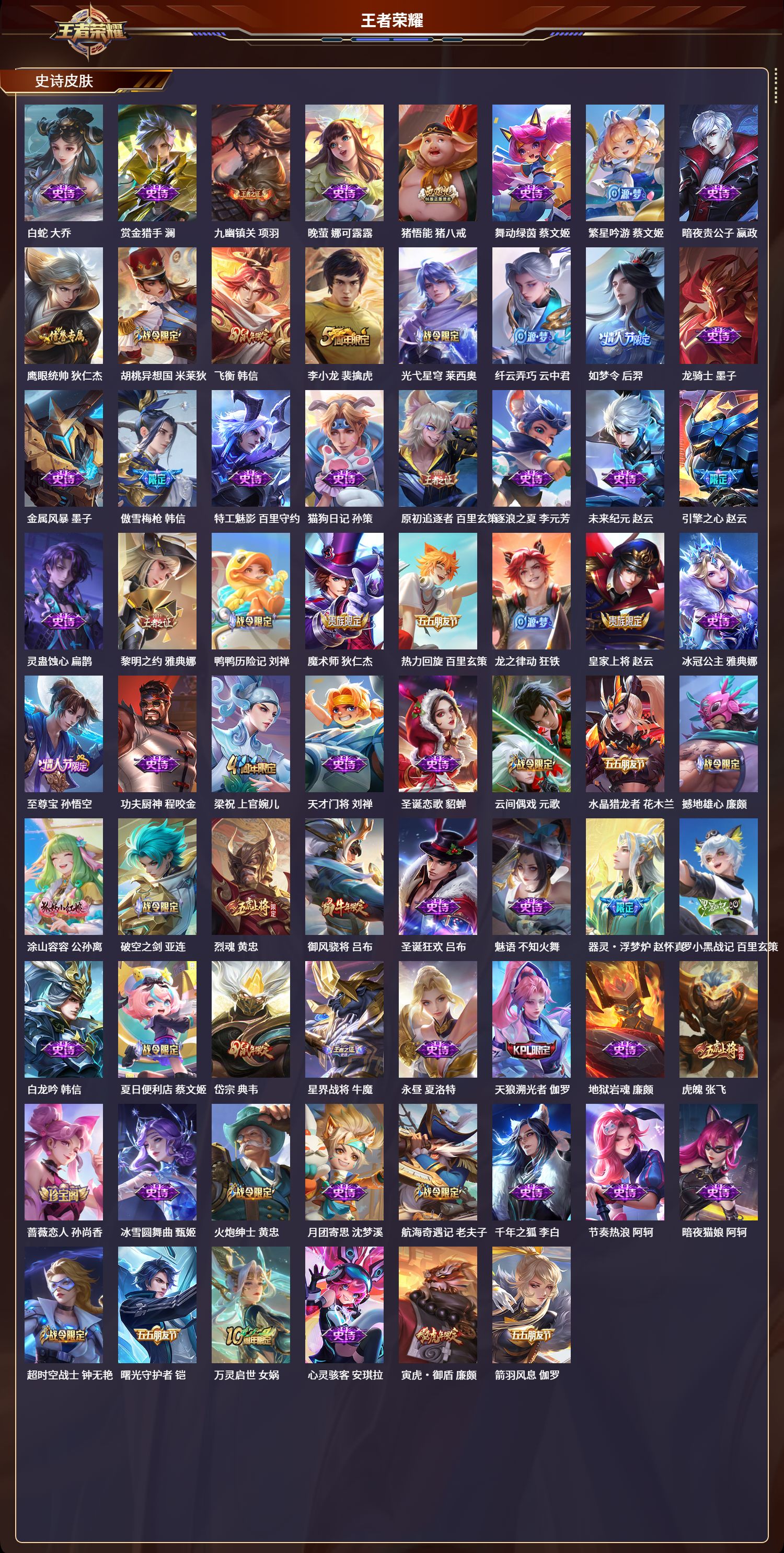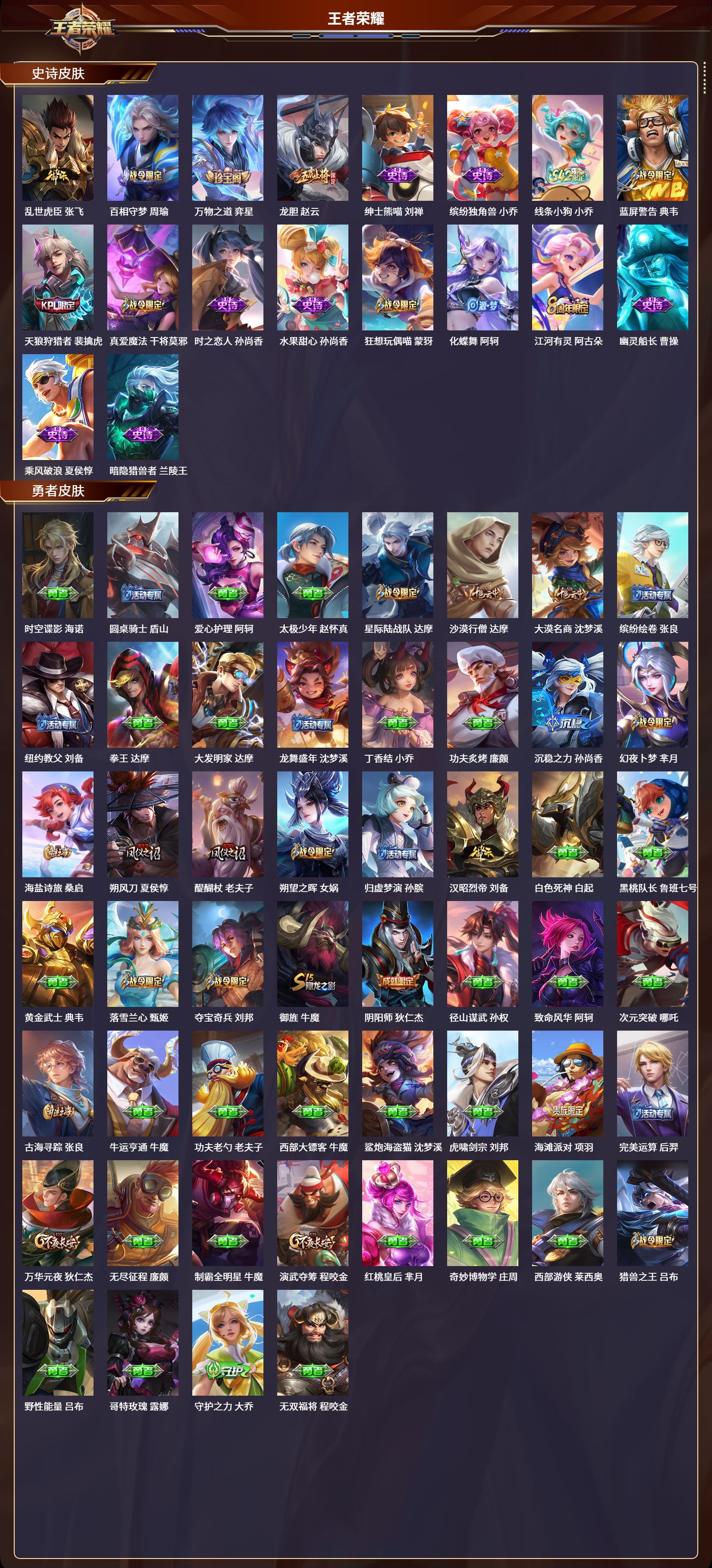 128英雄-404皮肤-苹果qq/最强王者/404皮肤/128英雄/4典藏/0珍品无双/1无双/2珍品传说/23传说/128史诗/9稀有英雄【2 珍品传说】酷洛米之心 安琪拉大耳狗之梦 瑶【4 典藏皮肤】鸣剑·曳影 李白杀手不太冷 孙尚香银白咏叹调 铠千魇归渊 吕布【1 无双皮肤】器灵·螭龙剑 曜【23 传说皮肤】胖达荣荣 梦奇武圣 关羽启明星使 虞姬无双飞将 马超李 曜云鹰飞将 曜游龙清