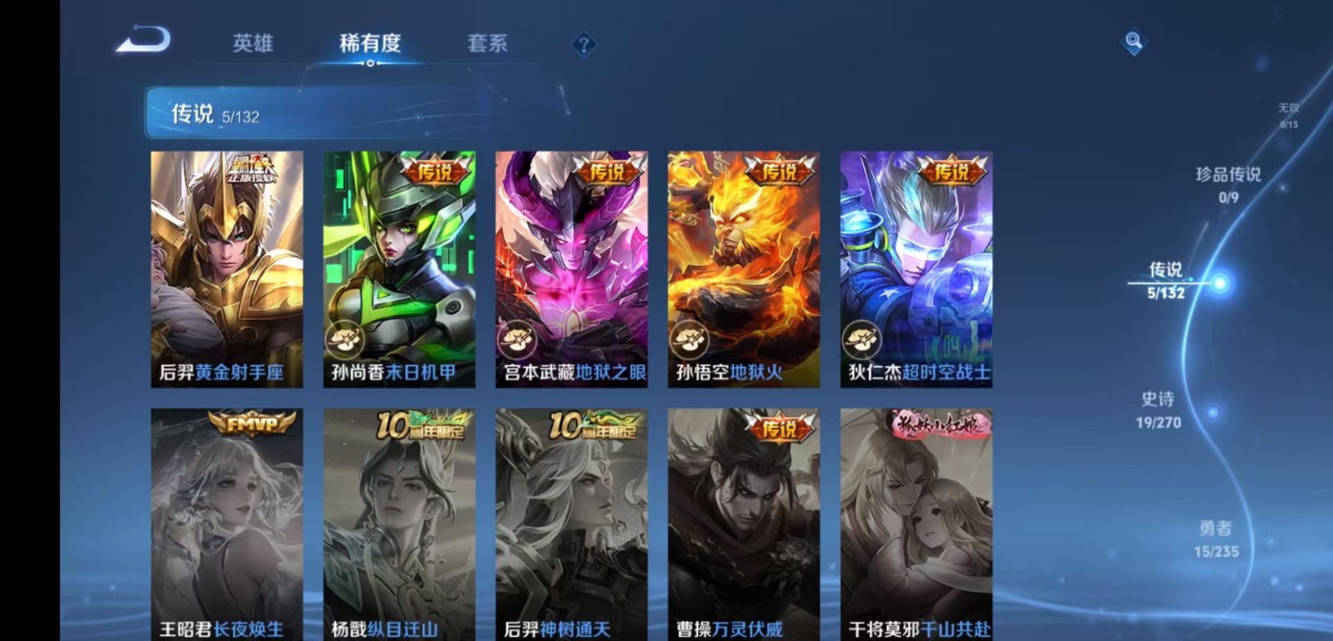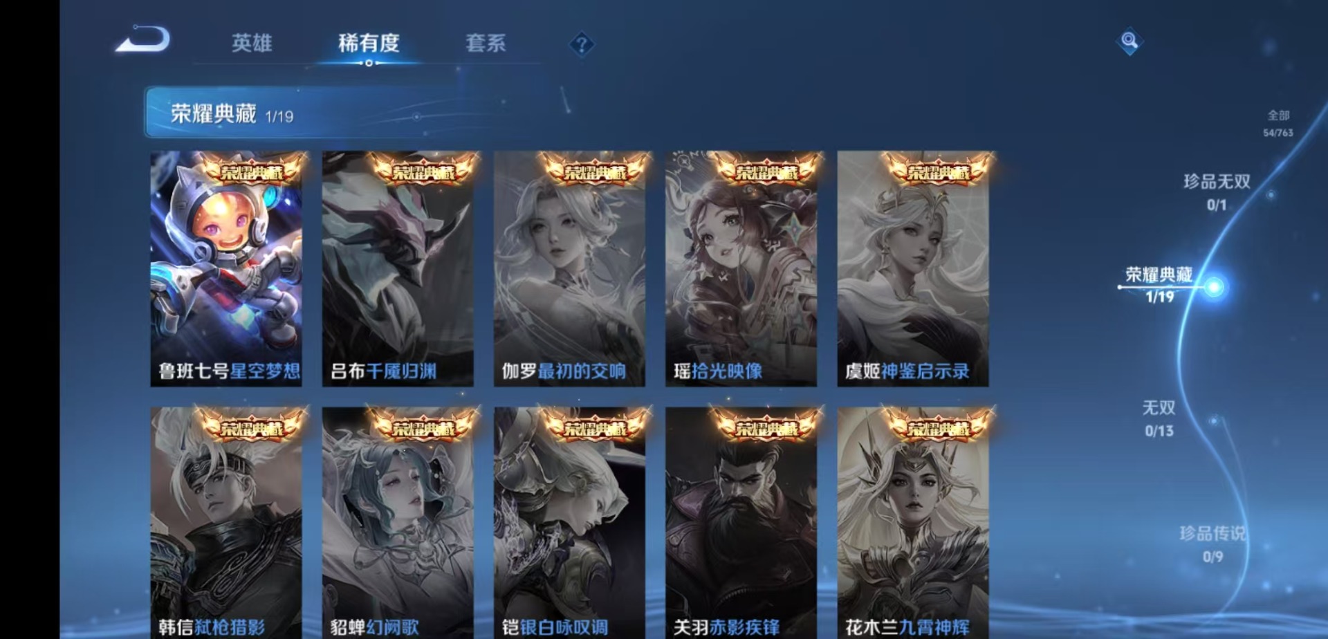 53英雄-54皮肤-[]v8 1典藏 5传说 53英雄 54皮肤 可修改实名 男号 【稀有英雄】韩信韩跳跳赵云 【荣耀水晶】星空梦想太空人 【传说皮】黄金射手座地狱火地狱之眼末日机甲-孙尚香绿蚂蚱超时空战士-狄仁杰 【赛季/战令皮】重明s11穷奇s12 【史诗皮】紫霞仙