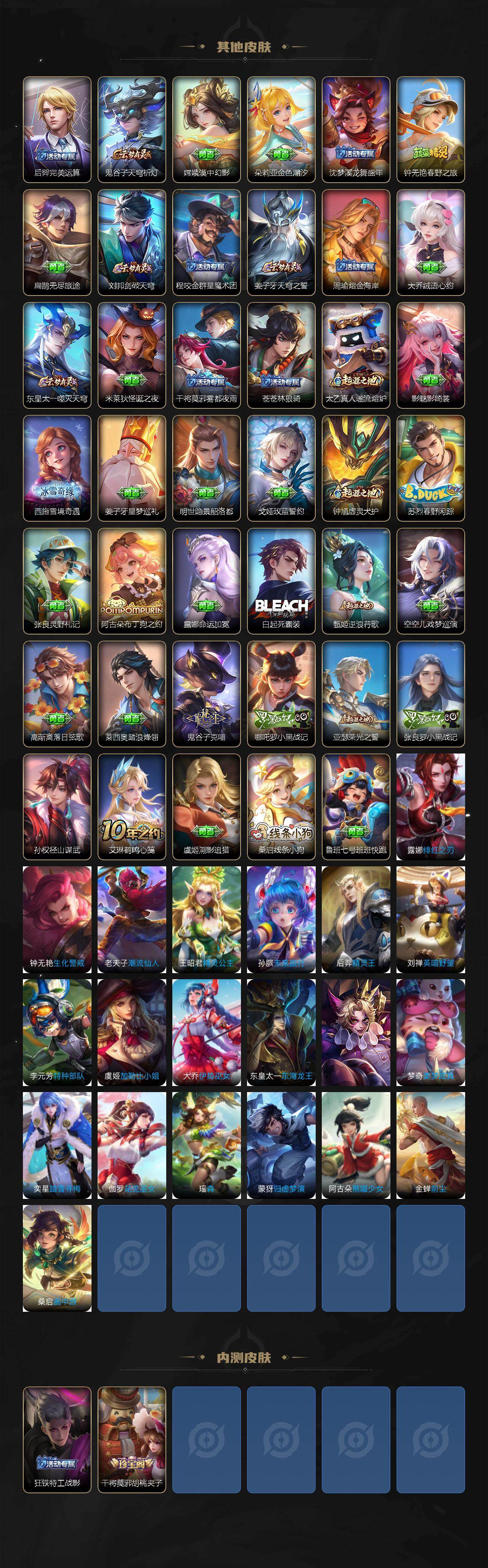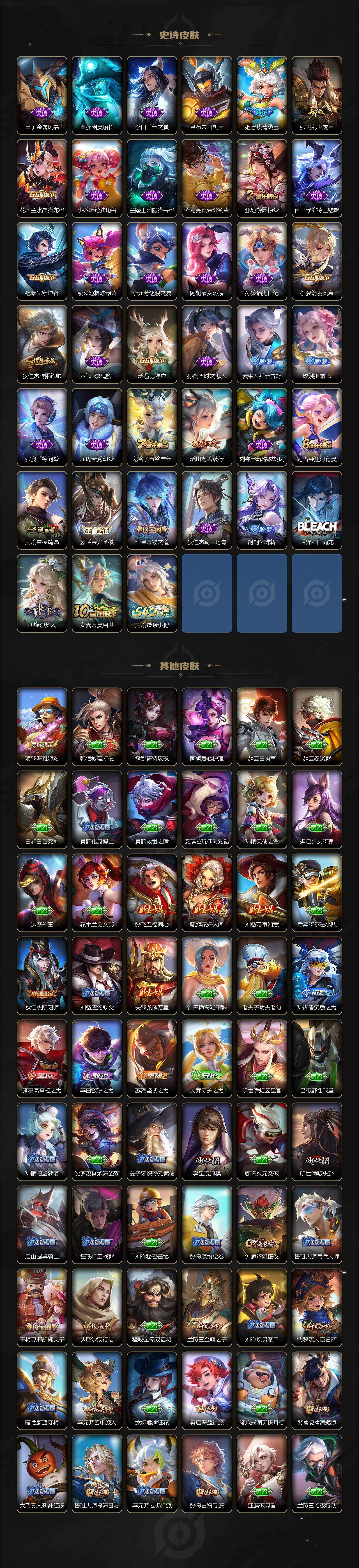 126英雄-180皮肤-贵族6/皮肤180/典藏1/传说6/史诗50/英雄126/孙权全皮/空空儿全皮/影全皮/拾光映像 瑶/孙悟空无相/神树通天 后羿/愿照·众生和 妲己/愿照·福禄聚 蔡文姬/鸣野蒿 桑启/碎云 百里守约/胖达荣荣 梦奇/绒语心约 大乔/天穹之誓 姜子牙/阴阳师 狄仁杰/皇家上将 赵云/热情桑巴 妲己/游园惊梦 甄姬/魔术师 狄仁杰/沙漠行僧 达摩/海滩派对 项羽/金庭之子 兰陵王/云中旅人 李元