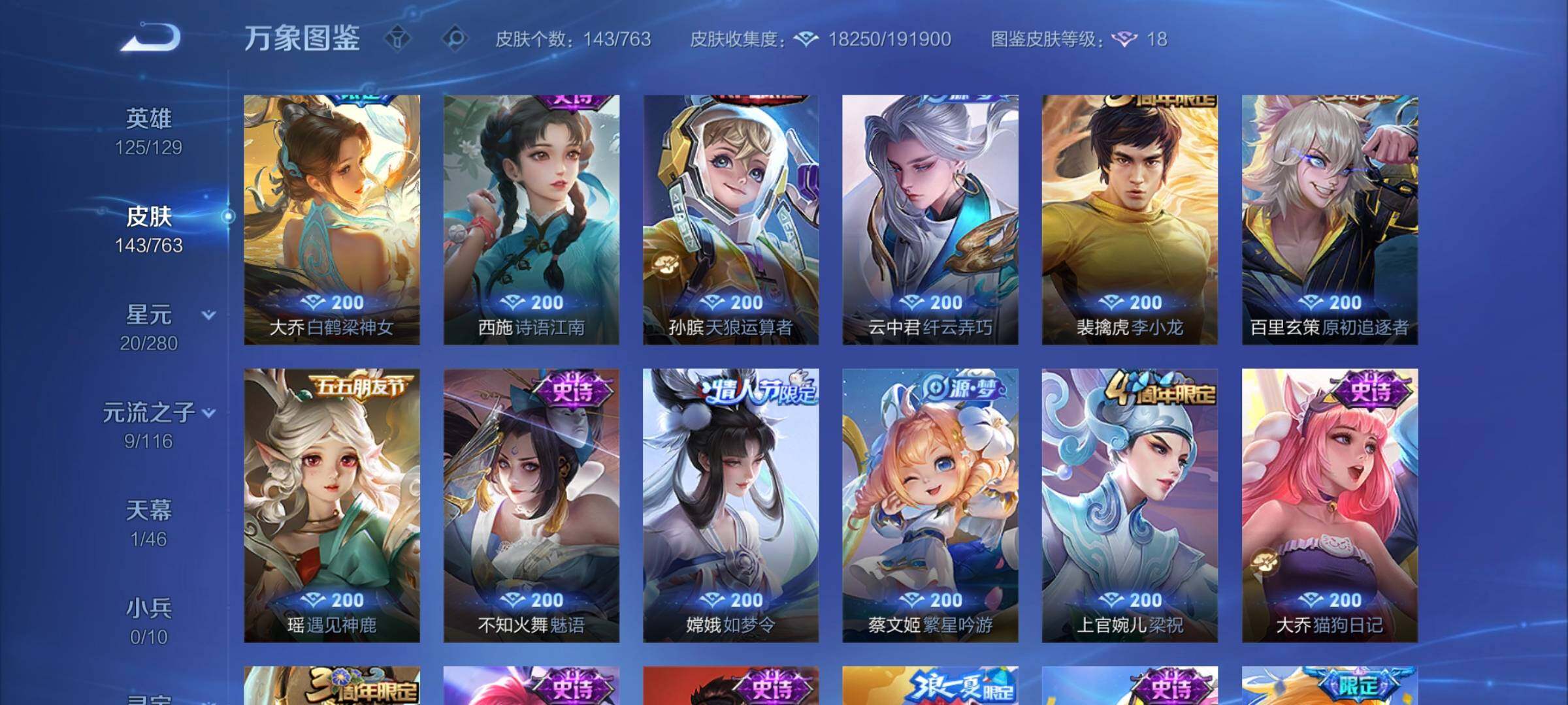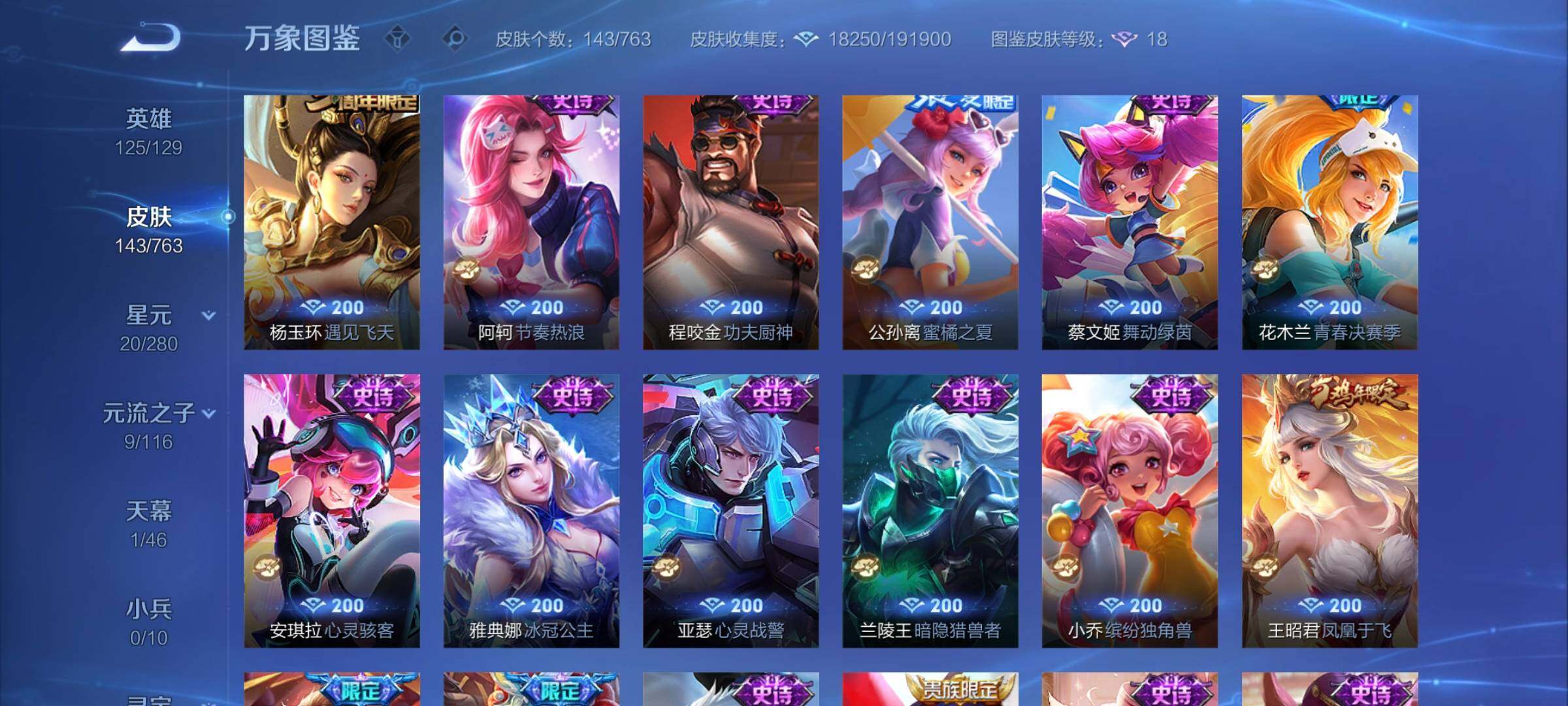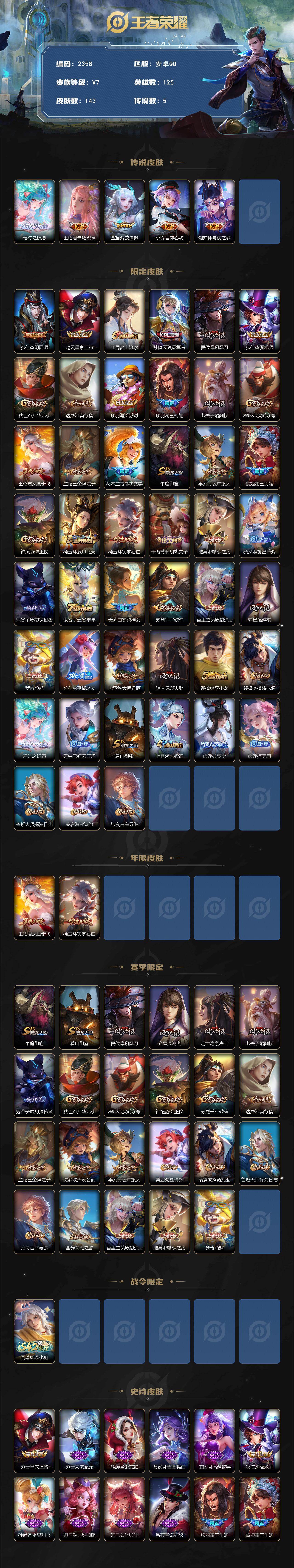 125英雄-143皮肤-【2358】【极品公主号·金标瑶时之祈愿·金标王昭君·游龙清影】安卓q-v7-永恒钻石ii段位-125英雄-143皮肤-5传说-43史诗 【传说皮肤】:瑶时之祈愿,王昭君乞巧织情,西施游龙清影,小乔音你心动,貂蝉仲夏夜之梦 【限定皮肤】:狄仁杰阴阳师,赵云皇家上将,庄周高山流水,孙膑天狼运算者,夏侯惇朔风刀,狄仁杰魔术师,狄仁杰万华元夜,达摩沙漠行僧,项羽海滩派对,项羽霸王别姬,老夫子醍醐杖,