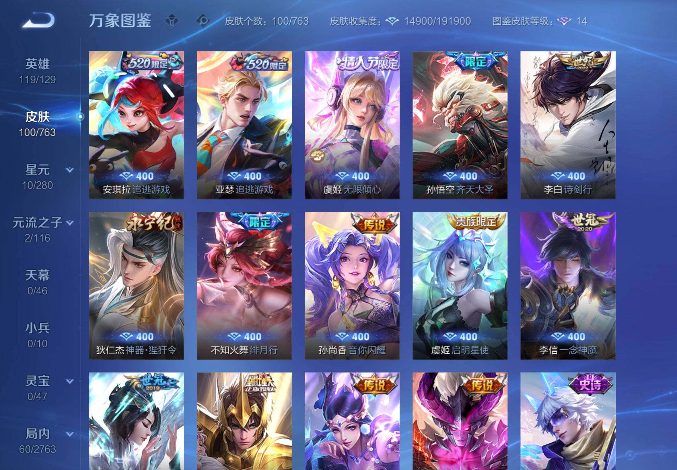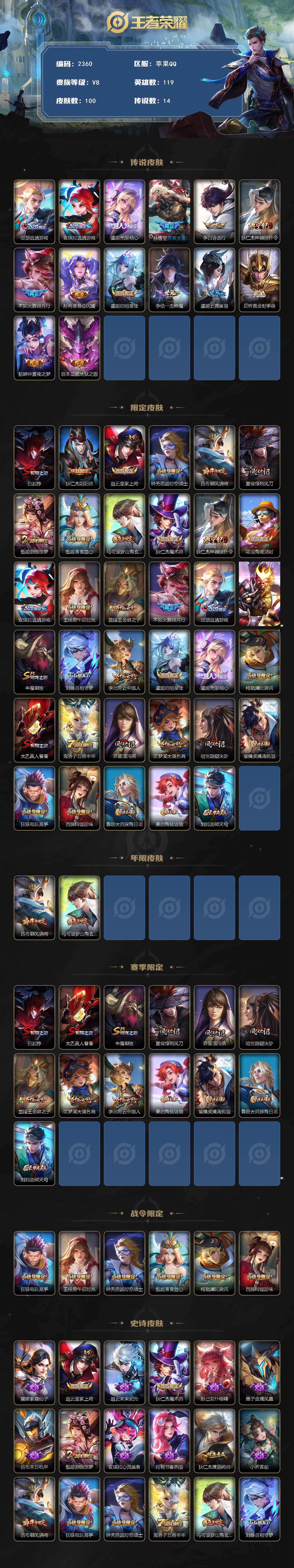 【2360】【v8·14质量传说·神器狴犴令·绯月行·追逃游戏·齐天大圣·皇冠q】苹果q-v8-荣耀黄金i段位-119英雄-100皮肤-14传说-19史诗 【传说皮肤】:亚瑟追逃游戏,安琪拉追逃游戏,虞姬无限倾心,孙悟空齐天大圣,李白诗剑行,狄仁杰神器狴犴令,不知火舞绯月行,孙尚香音你闪耀,虞姬启明星使,李信一念神魔,虞姬云霓雀翎,后羿黄金射手座,貂蝉仲夏夜之梦,宫本武藏地狱之眼 【限定皮肤】:白起狰,狄仁杰阴阳师,赵云皇家上将,钟无艳超时空战士,吕布御风骁将,夏侯惇朔风刀,甄姬游园惊梦,甄姬落雪兰心,马可波罗山海玄木吟,狄仁杰魔术师,狄仁杰神器狴犴令,项羽海滩派对,安琪拉追逃游戏,王昭君午后时光,兰陵王金庭之子,不知火舞绯月行,亚瑟追逃游戏,孙悟空齐天大圣,牛魔御旌,刘备百相守梦,李元芳云中旅人,虞姬启明星使,虞姬无限倾心,杨戬潮玩骑兵,太乙真人饕餮,鬼谷子五谷丰年,弈星混沌棋,沈梦溪大漠名商,明世隐疑决卦,裴擒虎擒涛扼浪,狂铁电玩高手,西施玲珑珍味,鲁班大师探海日志,桑启海盐诗旅,刘邦剑破天穹 【年限皮肤】:吕布御风骁将,马可波罗山海玄木吟 【赛季限定】:白起狰,太乙真人饕餮,牛魔御旌,夏侯惇朔风刀,弈星混沌棋,明世隐疑决卦,兰陵王金庭之子,沈梦溪大漠名商,李元芳云中旅人,桑启海盐诗旅,裴擒虎擒涛扼浪,鲁班大师探海日志,刘邦剑破天穹 【战令限定】:狂铁电玩高手,王昭君午后时光,钟无艳超时空战士,甄姬落雪兰心,杨戬潮玩骑兵,西施玲珑珍味 【史诗皮肤】:露娜紫霞仙子,赵云皇家上将,赵云未来纪元,狄仁杰魔术师,妲己女仆咖啡,墨子金属风暴,吕布末日机甲,甄姬游园惊梦,安琪拉心灵骇客,阿轲节奏热浪,狄仁杰鹰眼统帅,小乔青蛇,吕布御风骁将,狂铁电玩高手,钟无艳超时空战士,鬼谷子五谷丰年,马可波罗山海玄木吟,刘备百相守梦,百里守约真我赫兹 【其他皮肤】:项羽海滩派对,韩信教廷特使,阿轲致命风华,达摩大发明家,扁鹊化身博士,安琪拉玩偶对对碰,妲己少女阿狸,典韦黄金武士,亚瑟死亡骑士,花木兰兔女郎,张飞五福同心,宫本武藏万象初新,狄仁杰阴阳师,刘备纽约教父,刘备汉昭烈帝,关羽龙腾万里,白起狰,太乙真人饕餮,宫本武藏霸王丸,狂铁命运角斗场,老夫子功夫老勺,孙尚香沉稳之力,苏烈坚韧之力,牛魔御旌,吕布野性能量,孙膑归虚梦演,夏侯惇朔风刀,弈星混沌棋,明世隐疑决卦,狂铁特工战影,兰陵王金庭之子,王昭君午后时光,沈梦溪大漠名商,甄姬落雪兰心,李元芳云中旅人,刘备潮玩造梦师,桑启海盐诗旅,海月幻泉雾影,牛魔牛运亨通,裴擒虎擒涛扼浪,杨戬潮玩骑兵,莱西奥西部游侠,鲁班大师探海日志,西施玲珑珍味,李元芳妄想特派,后羿完美运算,刘邦剑破天穹,鲁班七号福禄兄弟,钟无艳生化警戒,老夫子潮流仙人,曹操超能战警,小乔万圣前夜,后羿精灵王,兰陵王隐刃,钟馗地府判官,李元芳特种部队,夏侯惇战争骑士,马可波罗激情绿茵,黄忠芝加哥教父,铠龙域领主,百里守约绝影神呛,百里玄策威尼斯狂欢,女娲尼罗河女神,米莱狄精准探案法,孙策海之征途,伽罗花见巫女,蒙犽归虚梦演 【内测皮肤】:狂铁特工战影 【