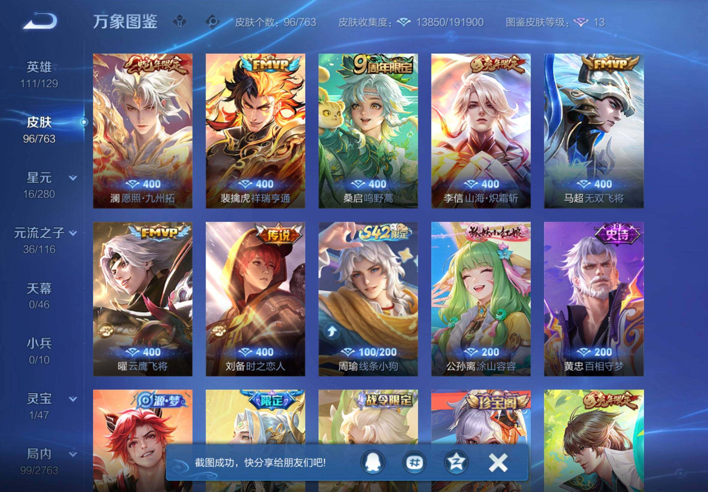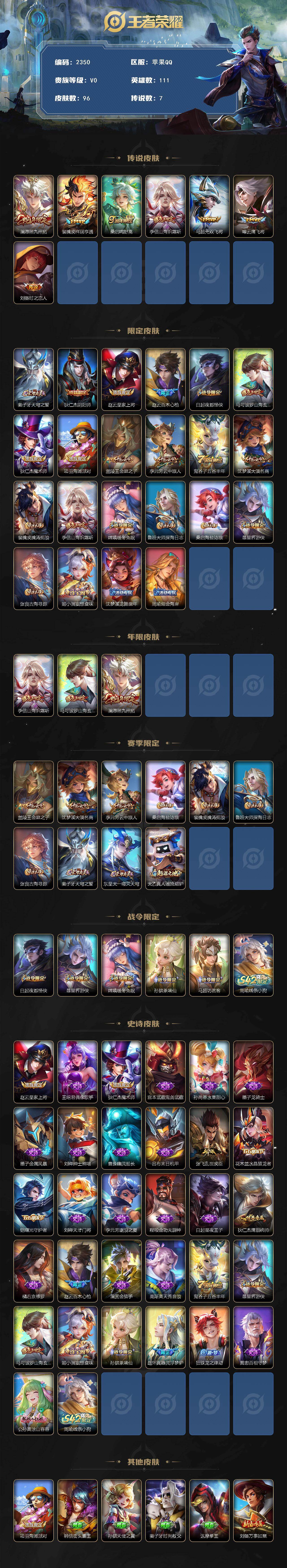 【2350】【7质量传说·九州拓·祥瑞亨通·炽霜斩】苹果q-v0-尊贵铂金ii段位-111英雄-96皮肤-7传说-31史诗 【传说皮肤】:澜愿照九州拓,裴擒虎祥瑞亨通,桑启鸣野蒿,李信山海炽霜斩,马超无双飞将,曜云鹰飞将,刘备时之恋人 【限定皮肤】:姜子牙天穹之誓,狄仁杰阴阳师,赵云皇家上将,赵云百木心呛,白起夜都怪侠,马可波罗山海玄木吟,狄仁杰魔术师,项羽海滩派对,兰陵王金庭之子,李元芳云中旅人,鬼谷子五谷丰年,沈梦溪大漠名商,裴擒虎擒涛扼浪,李信山海炽霜斩,嫦娥暖冬兔眠,鲁班大师探海日志,桑启海盐诗旅,暃星界游侠,张良古海寻踪,姬小满妄想食味,沈梦溪龙舞盛年,周瑜熔金海岸 【年限皮肤】:李信山海炽霜斩,马可波罗山海玄木吟,澜愿照九州拓 【赛季限定】:兰陵王金庭之子,沈梦溪大漠名商,李元芳云中旅人,桑启海盐诗旅,裴擒虎擒涛扼浪,鲁班大师探海日志,张良古海寻踪,姜子牙天穹之誓,东皇太一噬灭天穹,太乙真人谧流熔炉 【战令限定】:白起夜都怪侠,暃星界游侠,嫦娥暖冬兔眠,孙膑茶境仙,马超访茗客,周瑜线条小狗 【史诗皮肤】:赵云皇家上将,王昭君偶像歌手,狄仁杰魔术师,宫本武藏鬼剑武藏,孙尚香水果甜心,墨子龙骑士,墨子金属风暴,刘禅绅士熊喵,曹操幽灵船长,吕布末日机甲,张飞乱世虎臣,花木兰水晶猎龙者,铠曙光守护者,刘禅天才门将,李元芳逐浪之夏,程咬金功夫厨神,白起星夜王子,狄仁杰鹰眼统帅,橘右京修罗,赵云百木心呛,澜赏金猎手,高渐离天秀音浪,鬼谷子五谷丰年,暃星界游侠,马可波罗山海玄木吟,姬小满妄想食味,孙膑茶境仙,赵怀真器灵浮梦炉,狂铁龙之律动,黄忠百相守梦,公孙离涂山容容,周瑜线条小狗 【其他皮肤】:项羽海滩派对,韩信街头霸王,孙膑天使之翼,姜子牙时尚教父,达摩拳王,刘备万事如意,狄仁杰阴阳师,刘备纽约教父,李元芳黑猫爱糖果,关羽龙腾万里,钟无艳海滩丽影,李白敏锐之力,苏烈坚韧之力,吕布野性能量,沈梦溪鲨炮海盗猫,哪吒次元突破,鲁班大师乓乓大师,程咬金无双福将,白起夜都怪侠,兰陵王金庭之子,米莱狄契约魔法,沈梦溪大漠名商,蒙恬蔚蓝守将,李元芳云中旅人,桑启海盐诗旅,嫦娥暖冬兔眠,海月幻泉雾影,猪八戒潮玩探月行,裴擒虎擒涛扼浪,鲁班大师探海日志,李元芳妄想特派,张良古海寻踪,沈梦溪龙舞盛年,姜子牙天穹之誓,周瑜熔金海岸,东皇太一噬灭天穹,吕布逐霄战戟,苍苍林狼骑,太乙真人谧流熔炉,典韦铁骨偃魂,马超访茗客,刘备浪漫序章,鲁班七号木偶奇遇记,高渐离金属狂潮,王昭君精灵公主,马可波罗激情绿茵,杨戬埃及法老,哪吒三太子,李信灼热之刃,嫦娥露花倒影,盘古创世神祝,曜归虚梦演,马超幸存者,蒙恬秩序猎龙将,澜孤猎,司空震启蛰,云缨赤焰之缨 【