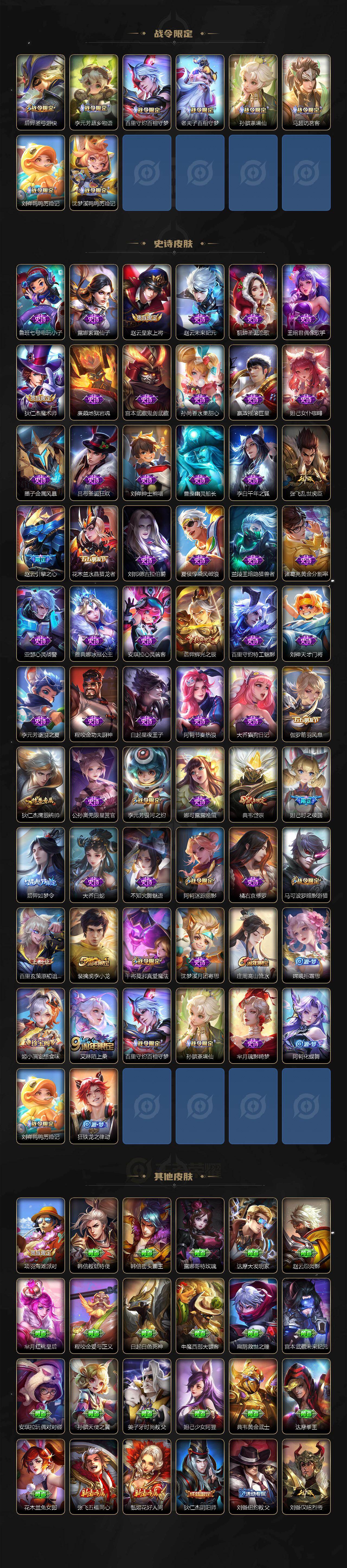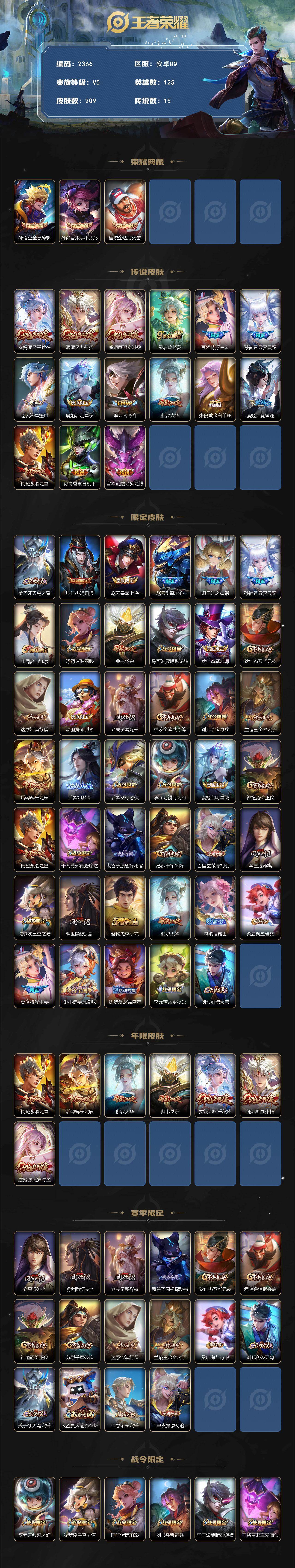 125英雄-209皮肤-【2366】安卓q-v5-最强王者段位-125英雄-209皮肤-3典藏皮肤-15传说-62史诗 【荣耀典藏】:孙悟空全息碎影,孙尚香杀手不太冷,程咬金活力突击 【传说皮肤】:女娲愿照千秋盛,澜愿照九州拓,虞姬愿照岁时盈,桑启鸣野蒿,夏洛特浮生妄,孙尚香异界灵契,赵云淬星耀世,虞姬启明星使,曜云鹰飞将,伽罗太华,张良黄金白羊座,虞姬云霓雀翎,杨戬永曜之星,孙尚香末日机甲,宫本武藏地狱之眼 【限定