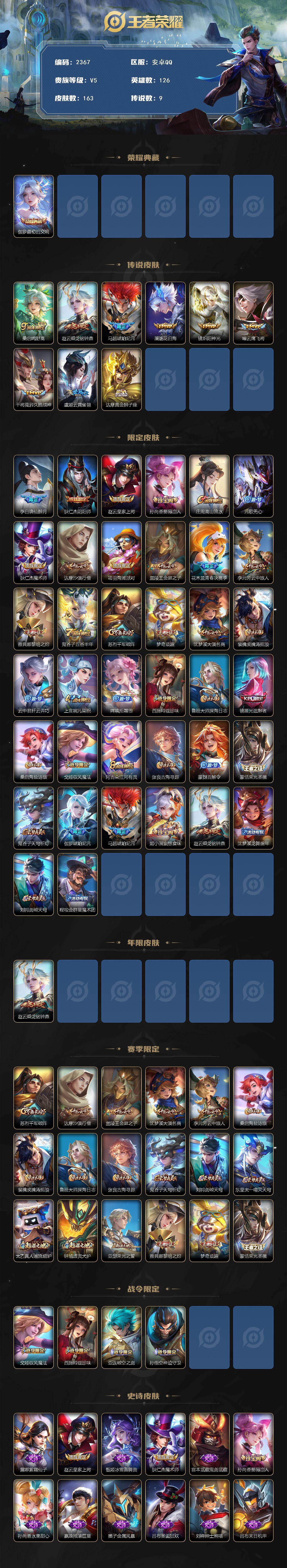 126英雄-163皮肤-【2367】安卓q-v5-最强王者段位-126英雄-163皮肤-1典藏皮肤-9传说-53史诗 【荣耀典藏】:伽罗最初的交响 【传说皮肤】:桑启鸣野蒿,赵云乘龙铭钟鼎,马超琥珀纪元,澜逐花归海,镜炽阳神光,曜云鹰飞将,干将莫邪久胜战神,虞姬云霓雀翎,达摩黄金狮子座 【限定皮肤】:李白谪仙醉月,狄仁杰阴阳师,赵云皇家上将,孙尚香蔷薇恋人,庄周高山流水,元歌无心,狄仁杰魔术师,达摩沙漠行僧,项羽海滩