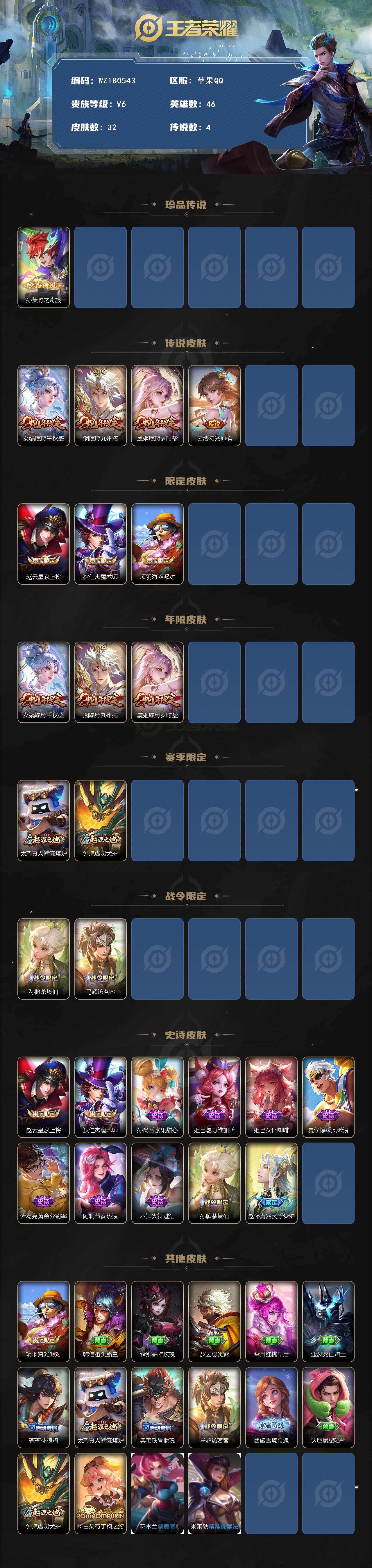 【wz180543】苹果q-最强王者段位-46英雄-32皮肤-1珍品传说-4传说-11史诗 【珍品传说】:孙策时之奇旅 【传说皮肤】:女娲愿照千秋盛,澜愿照九州拓,虞姬愿照岁时盈,云缨幻光神呛 【限定皮肤】:赵云皇家上将,狄仁杰魔术师,项羽海滩派对 【年限皮肤】:女娲愿照千秋盛,澜愿照九州拓,虞姬愿照岁时盈 【赛季限定】:太乙真人谧流熔炉,钟馗虚灵犬护 【战令限定】:孙膑茶境仙,马超访茗客 【史诗皮肤】:赵云皇家上将,狄仁杰魔术师,孙尚香水果甜心,妲己魅力维加斯,妲己女仆咖啡,夏侯惇乘风破浪,诸葛亮黄金分割率,阿轲节奏热浪,不知火舞魅语,孙膑茶境仙,赵怀真器灵浮梦炉 【其他皮肤】:项羽海滩派对,韩信街头霸王,露娜哥特玫瑰,赵云忍炎影,芈月红桃皇后,亚瑟死亡骑士,苍苍林狼骑,太乙真人谧流熔炉,典韦铁骨偃魂,马超访茗客,西施雪境奇遇,达摩爆裂喵拳,钟馗虚灵犬护,阿古朵布丁狗之约,花木兰剑舞者,米莱狄精准探案法 【
