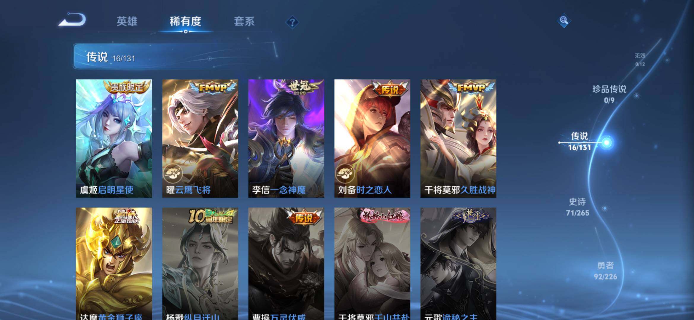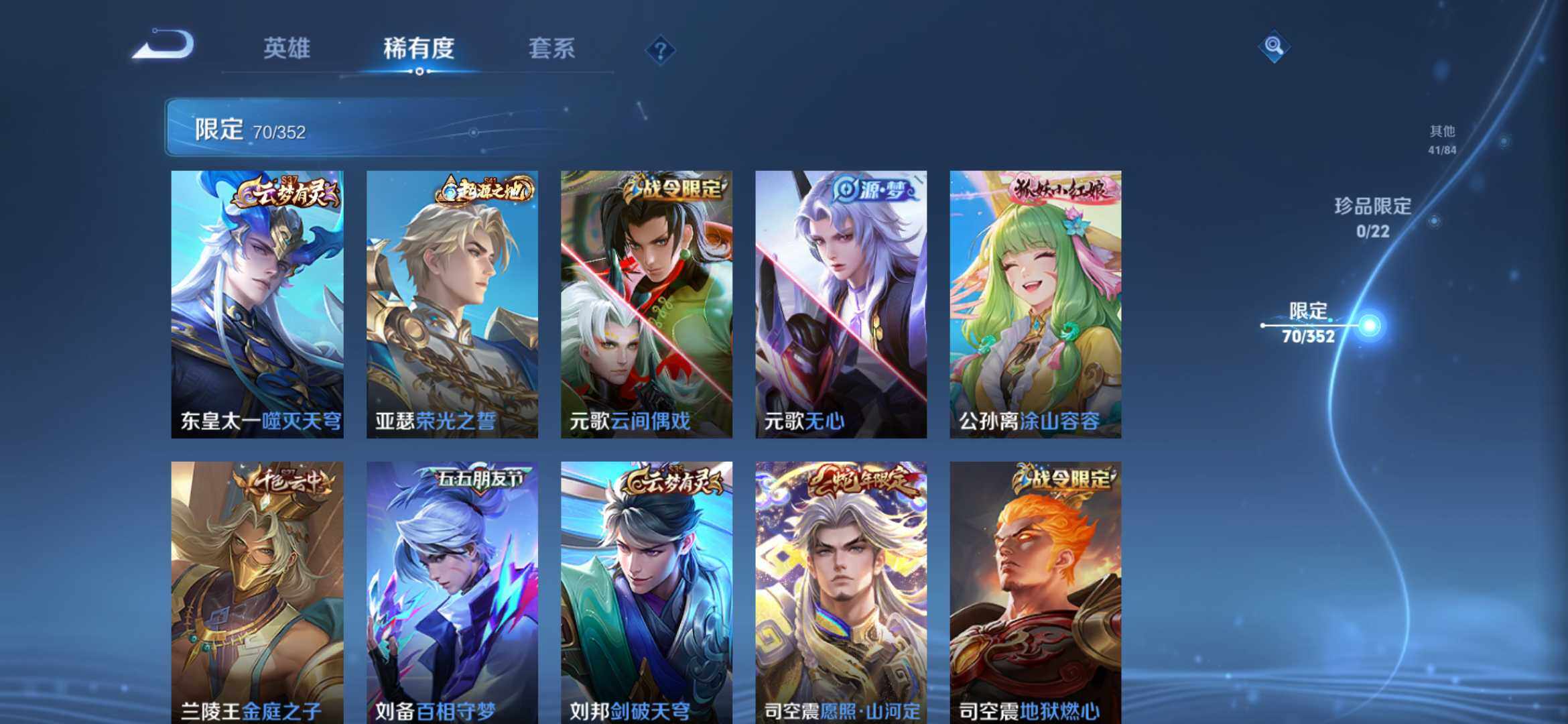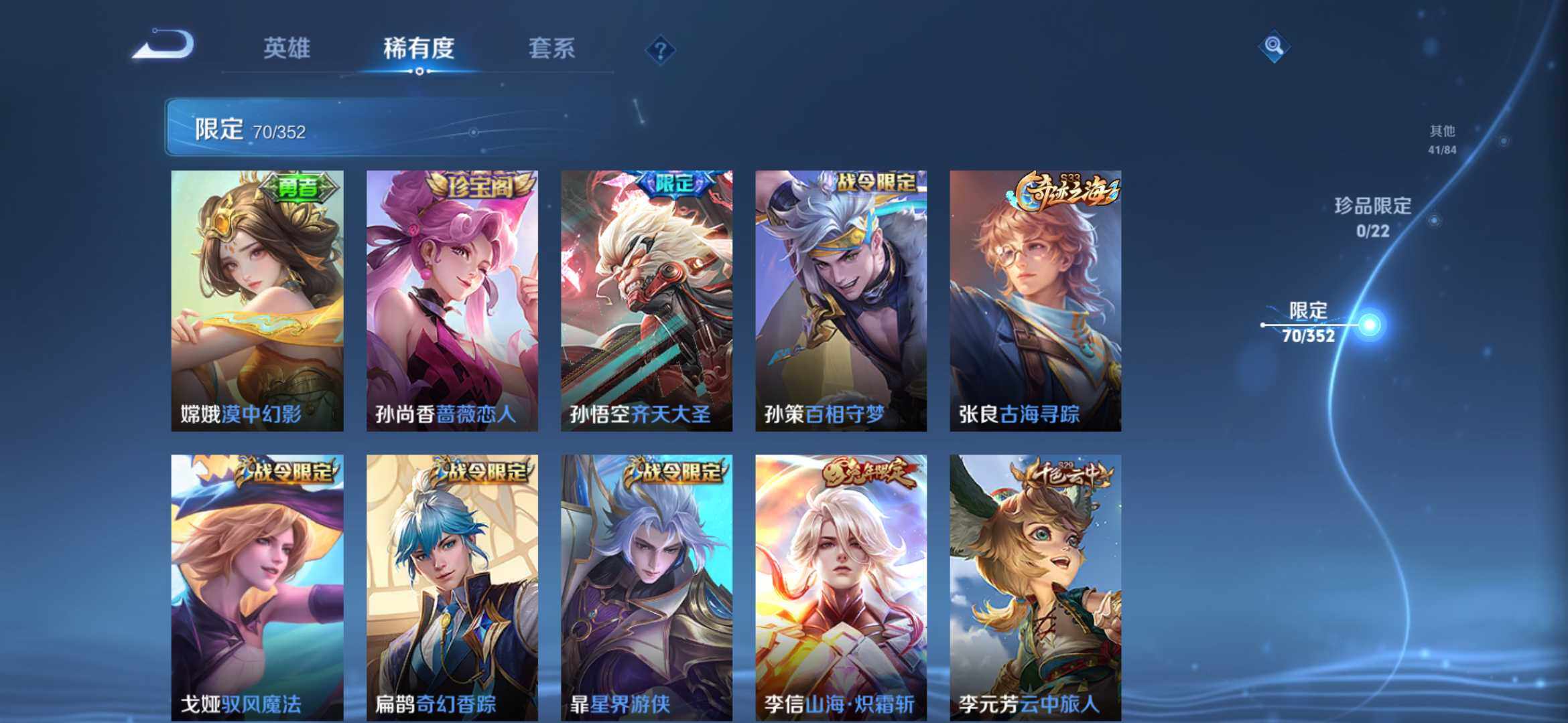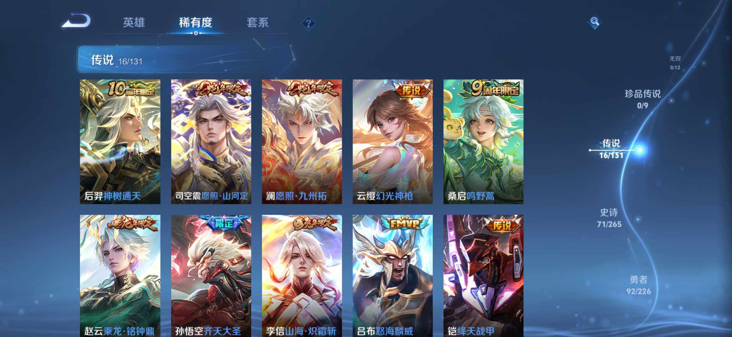 2274277-【时之思念 鸣剑 齐天大圣 16传说1典藏221皮精品号】安卓q-v8-125英雄-221皮肤-1典藏-0珍品无双-0无双-0珍品传说-16传说-71史诗 【英雄全皮】:孙权全皮,苍全皮,李信全皮,蒙恬全皮,司空震全皮,影全皮 【荣耀典藏】:李白鸣剑曳影 【传说皮肤】:后羿神树通天,司空震愿照山河定,澜愿照九州拓,云缨幻光神呛,桑启鸣野蒿,赵云乘龙铭钟鼎,孙悟空齐天大圣,李