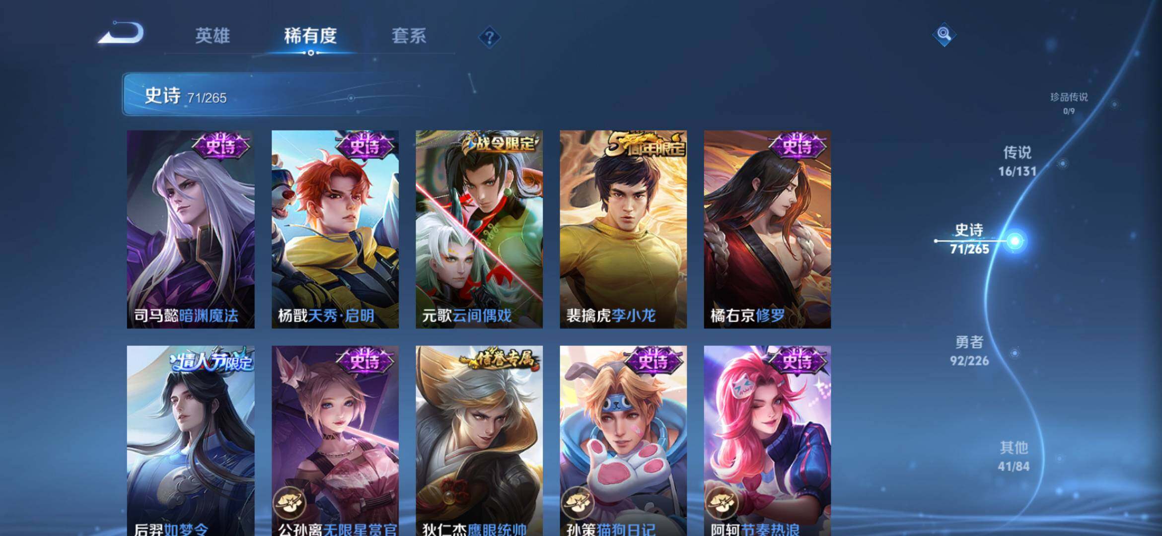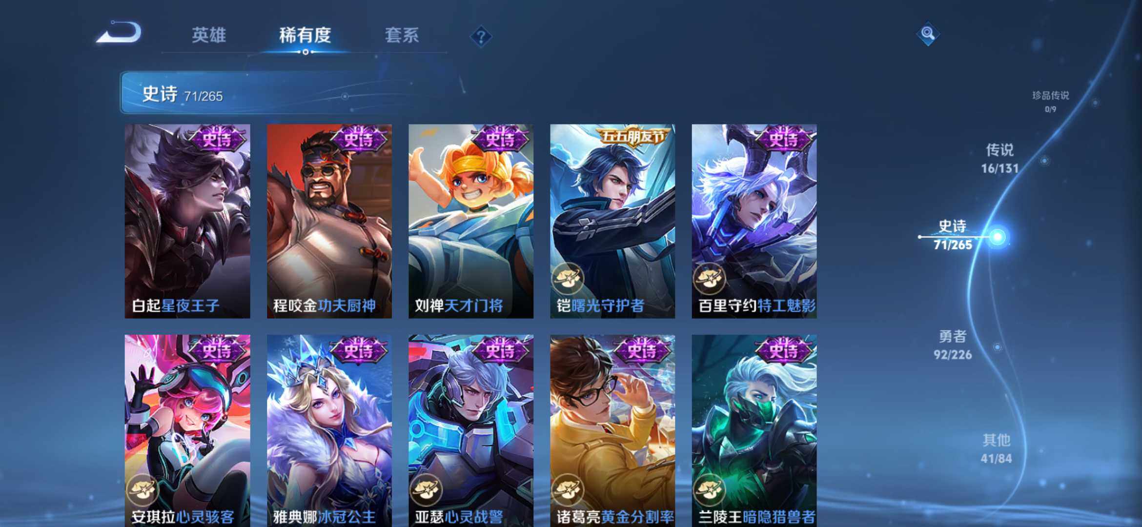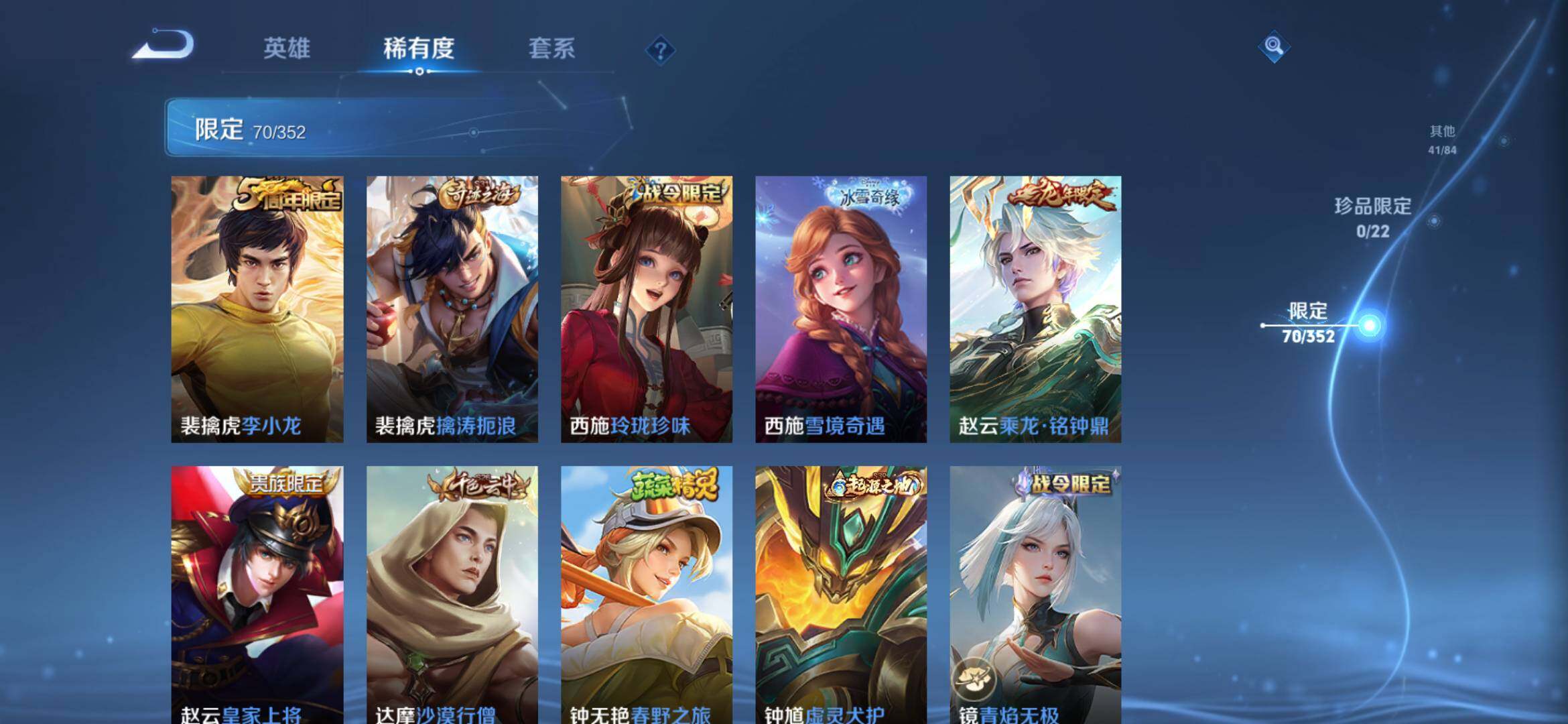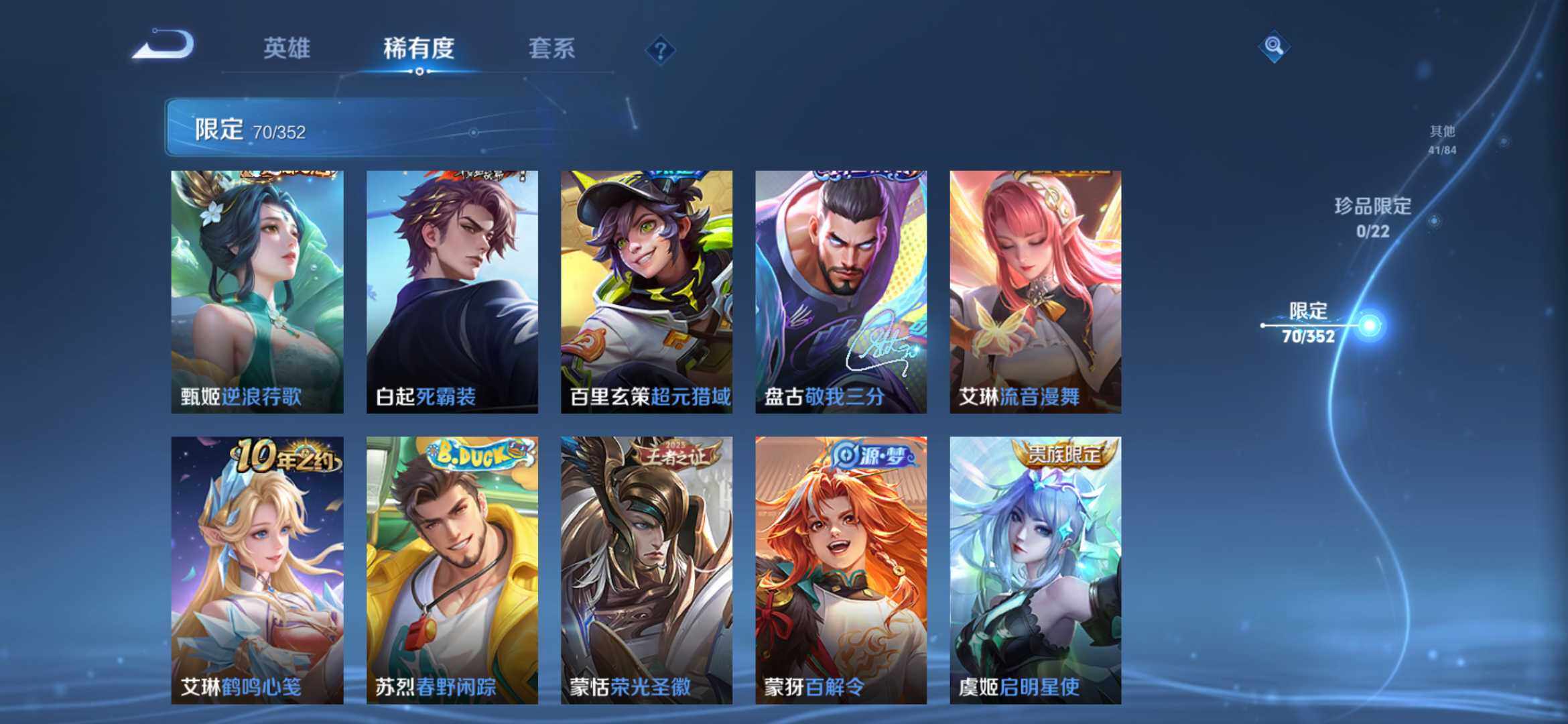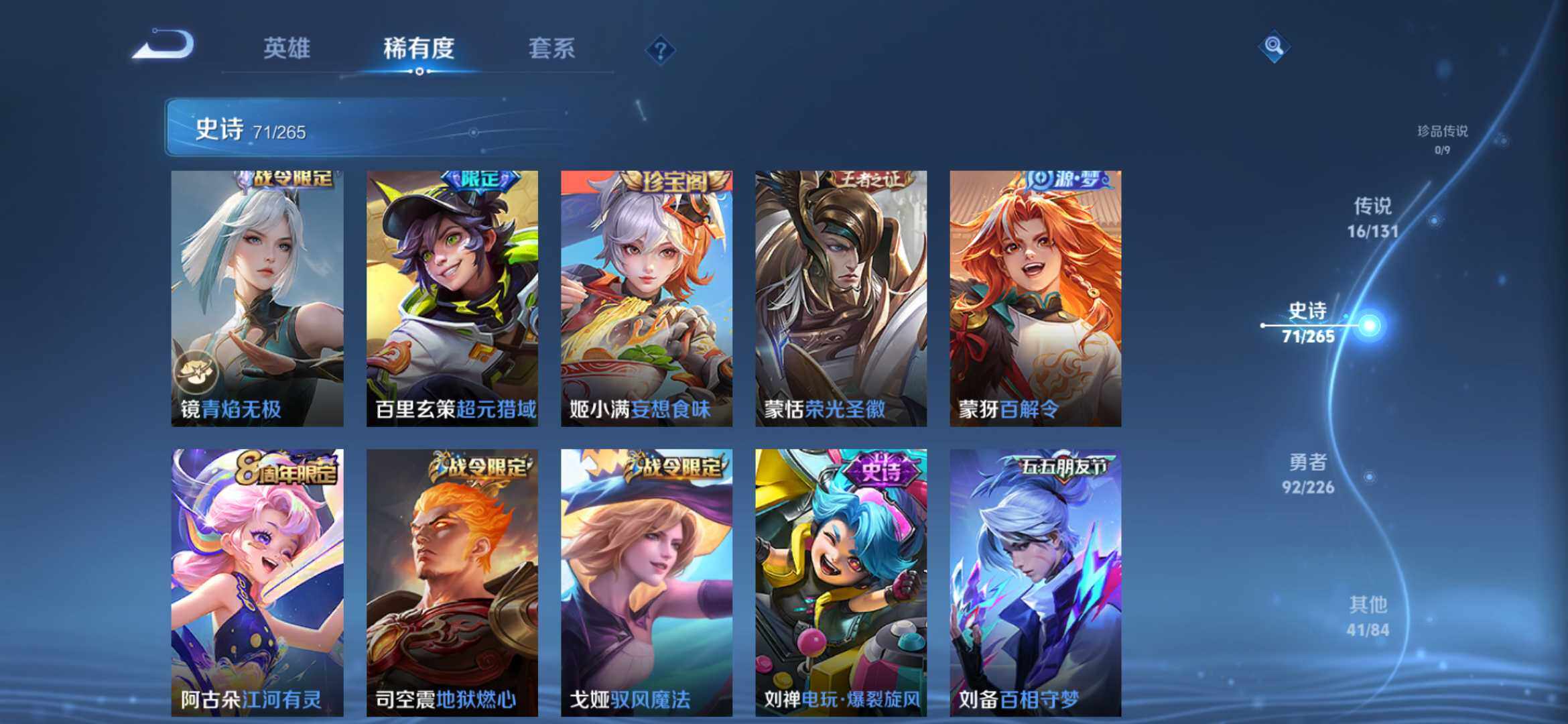 2274277-【时之思念 鸣剑 齐天大圣 16传说1典藏221皮精品号】安卓q-v8-125英雄-221皮肤-1典藏-0珍品无双-0无双-0珍品传说-16传说-71史诗 【英雄全皮】:孙权全皮,苍全皮,李信全皮,蒙恬全皮,司空震全皮,影全皮 【荣耀典藏】:李白鸣剑曳影 【传说皮肤】:后羿神树通天,司空震愿照山河定,澜愿照九州拓,云缨幻光神呛,桑启鸣野蒿,赵云乘龙铭钟鼎,孙悟空齐天大圣,李