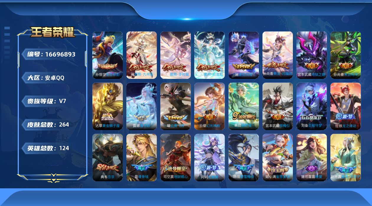 [16696893]v7-263皮肤-1典藏-13传说-67史诗 孙悟空荣耀典藏 sa1020 【荣耀典藏】:孙悟空全息碎影 【内测皮肤】:孙尚香蔷薇恋人,狂铁特工战影 【传说皮肤】:宫本武藏地狱之眼,孙尚香末日机甲,达摩黄金狮子座,曜云鹰飞将,宫本武藏惊梅引,露娜霜月吟,澜逐花归海,孙尚香乘龙问璇玑,桑启鸣野蒿,云缨幻光神呛,虞姬愿照岁时盈,澜愿照九州拓,妲己愿照众生和 【限定皮肤】:暃埋骨钱,大乔绒语心约,姜子牙天穹之誓,狄仁杰阴阳师,赵云皇家上将,孙尚香蔷薇恋人,元歌无心,典韦岱宗,狄仁杰魔术师,狄仁杰万华元夜,达摩沙漠行僧,项羽海滩派对,老夫子醍醐杖,程咬金演武夺筹,韩信傲雪梅呛,刘备百相守梦,李元芳匿光侦查者,钟馗驱傩正仪,鬼谷子原初探秘者,弈星混沌棋,明世隐疑决卦,裴擒虎李小龙,裴擒虎擒涛扼浪,云中君纤云弄巧,上官婉儿梁祝,嫦娥拒霜思,西施玲珑珍味,鲁班大师探海日志,戈娅驭风魔法,艾琳流音漫舞,司空震地狱燃心,阿古朵江河有灵,张良古海寻踪,蒙犽百解令,高渐离燃音魔法,妲己灵卜魔法,鬼谷子天穹祈灯,姬小满妄想食味,孙尚香乘龙问璇玑,沈梦溪龙舞盛年,鲁班七号蔬乡物语,李元芳蔬乡物语,刘邦剑破天穹,程咬金群星魔术团,镜青焰无极,项羽苍威无极,刘备异域游侠,周瑜熔金海岸 【年限皮肤】:典韦岱宗,孙尚香乘龙问璇玑 【赛季限定】:狄仁杰万华元夜,达摩沙漠行僧,老夫子醍醐杖,程咬金演武夺筹,张良古海寻踪,钟馗驱傩正仪,鬼谷子原初探秘者,弈星混沌棋,明世隐疑决卦,裴擒虎擒涛扼浪,鲁班大师探海日志,鬼谷子天穹祈灯,刘邦剑破天穹,姜子牙天穹之誓 【战令限定】:艾琳流音漫舞,西施玲珑珍味,司空震地狱燃心,戈娅驭风魔法,高渐离燃音魔法,妲己灵卜魔法,鲁班七号蔬乡物语,李元芳蔬乡物语,镜青焰无极,项羽苍威无极 【史诗皮肤】:项羽苍穹之光,露娜紫霞仙子,阿轲暗夜猫娘,赵云皇家上将,赵云未来纪元,貂蝉圣诞恋歌,甄姬冰雪圆舞曲,狄仁杰魔术师,宫本武藏鬼剑武藏,孙尚香蔷薇恋人,孙尚香水果甜心,妲己魅力维加斯,妲己女仆咖啡,墨子龙骑士,墨子金属风暴,吕布圣诞狂欢,曹操幽灵船长,李白千年之狐,花木兰水晶猎龙者,刘邦德古拉伯爵,夏侯惇乘风破浪,小乔缤纷独角兽,兰陵王暗隐猎兽者,亚瑟心灵战警,雅典娜冰冠公主,安琪拉心灵骇客,铠曙光守护者,李元芳逐浪之夏,阿轲节奏热浪,狄仁杰鹰眼统帅,公孙离无限星赏官,上官婉儿梁