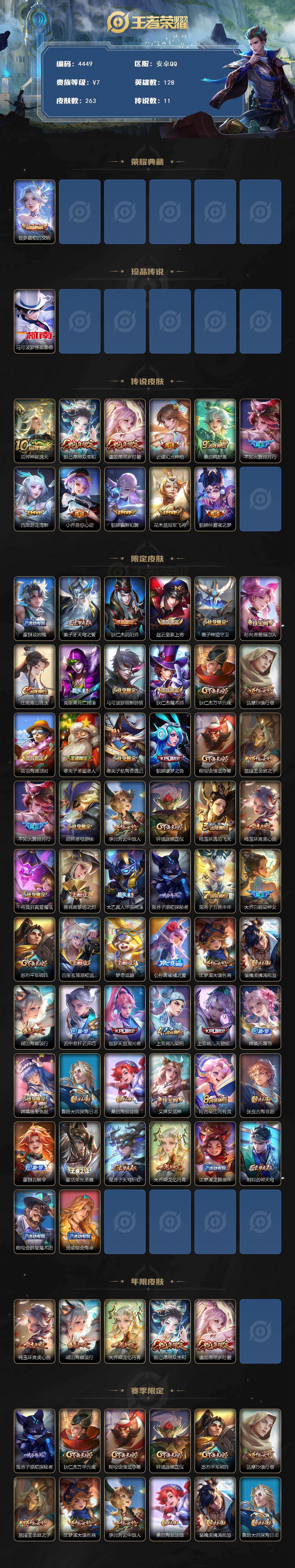 安卓q-v7-永恒钻石ii段位-128英雄-263皮肤-1典藏皮肤-1珍品传说-11传说-79史诗 【英雄全皮】:影全皮 【荣耀典藏】:伽罗最初的交响 【珍品传说】:马可波罗怪盗基德 【传说皮肤】:后羿神树通天,妲己愿照众生和,虞姬愿照岁时盈,云缨幻光神呛,桑启鸣野蒿,不知火舞绯月行,西施游龙清影,小乔音你心动,貂蝉猫影幻舞,花木兰冠军飞将,貂蝉仲夏夜之梦 【限定皮肤】:蒙犽顽岩魄,姜子牙天穹之誓,狄仁杰阴阳师,赵云皇家上将,墨子神迹守卫,孙尚香蔷薇恋人,庄周高山流水,高渐离死亡摇滚,马可波罗暗影游猎,狄仁杰魔术师,狄仁杰万华元夜,达摩沙漠行僧,项羽海滩派对,老夫子圣诞老人,老夫子航海奇遇记,貂蝉逐梦之音,程咬金演武夺筹,兰陵王金庭之子,不知火舞绯月行,后羿圣弓游侠,李元芳云中旅人,钟馗驱傩正仪,杨玉环遇见飞天,杨玉环寅虎心曲,干将莫邪真爱魔法,雅典娜黎明之约,太乙真人华丽摇滚,鬼谷子原初探秘者,鬼谷子五谷丰年,大乔白鹤梁神女,苏烈千军破阵,百里玄策原初追逐者,梦奇顽趣,公孙离蜜橘之夏,沈梦溪大漠名商,裴擒虎擒涛扼浪,瑶山海碧波行,云中君纤云弄巧,伽罗天狼溯光者,上官婉儿梁祝,上官婉儿天狼绘梦者,嫦娥拒霜思,嫦娥暖冬兔眠,鲁班大师探海日志,桑启海盐诗旅,艾琳女武神,阿古朵江河有灵,张良古海寻踪,蒙犽百解令,蒙恬荣光圣徽,鬼谷子天穹祈灯,大乔乘龙忆丹青,沈梦溪龙舞盛年,刘邦剑破天穹,程咬金群星魔术团,周瑜熔金海岸 【年限皮肤】:杨玉环寅虎心曲,瑶山海碧波行,大乔乘龙忆丹青,妲己愿照众生和,虞姬愿照岁时盈 【赛季限定】:鬼谷子原初探秘者,狄仁杰万华元夜,程咬金演武夺筹,钟馗驱傩正仪,苏烈千军破阵,达摩沙漠行僧,兰陵王金庭之子,沈梦溪大漠名商,李元芳云中旅人,桑启海盐诗旅,裴擒虎擒涛扼浪,鲁班大师探海日志,张良古海寻踪,鬼谷子天穹祈灯,刘邦剑破天穹,姜子牙天穹之誓,东皇太一噬灭天穹,太乙真人谧流熔炉,钟馗虚灵犬护,甄姬逆浪荇歌,亚瑟荣光之誓,百里玄策原初追逐者,雅典娜黎明之约,梦奇顽趣,蒙恬荣光圣徽,牛魔星界战将,项羽九幽镇关 【战令限定】:马可波罗暗影游猎,老夫子航海奇遇记,墨子神迹守卫,干将莫邪真爱魔法,后羿圣弓游侠,嫦娥暖冬兔眠,百里守约百相守梦,老夫子百相守梦,孙膑茶境仙,马超访茗客,周瑜线条小狗 【史诗皮肤】:露娜紫霞仙子,赵云皇家上将,赵云未来纪元,貂蝉圣诞恋歌,老夫子圣诞老人,甄姬冰雪圆舞曲,王昭君偶像歌手,狄仁杰魔术师,廉颇地狱岩魂,宫本武藏鬼剑武藏,孙尚香蔷薇恋人,孙尚香水果甜心,嬴政摇滚巨星,妲己魅力维加斯,妲己女仆咖啡,墨子金属风暴,吕布圣诞狂欢,刘禅绅士熊喵,曹操幽灵船长,张飞乱世虎臣,貂蝉逐梦之音,花木兰水晶猎龙者,夏侯惇乘风破浪,小乔缤纷独角兽,兰陵王暗隐猎兽者,雅典娜冰冠公主,安琪拉心灵骇客,百里守约特工魅影,蔡文姬舞动绿茵,公孙离蜜橘之夏,李元芳逐浪之夏,白起星夜王子,阿轲节奏热浪,杨玉环遇见飞天,孙策猫狗日记,伽罗箭羽风息,狄仁杰鹰眼统帅,公孙离无限星赏官,上官婉儿梁祝,娜可露露晚萤,不知火舞魅语,瑶遇见神鹿,孙尚香时之恋人,上官婉儿天狼绘梦者,马可波罗暗影游猎,百里玄策原初追逐者,云中君纤云弄巧,西施诗语江南,老夫子航海奇遇记,伽罗天狼溯光者,大乔白鹤梁神女,干将莫邪真爱魔法,沈梦溪月团寄思,庄周高山流水,嫦娥拒霜思,雅典娜黎明之约,杨玉环寅虎心曲,貂蝉唤灵魅影,鬼谷子五谷丰年,梦奇顽趣,瑶山海碧波行,阿古朵江河有灵,蒙犽百解令,蒙恬荣光圣徽,大乔乘龙忆丹青,蒙犽顽岩魄,弈星炽弈燎原,百里守约百相守梦,牛魔星界战将,孙膑茶境仙,弈星万物之道,阿轲化蝶舞,狂铁龙之律动,扁鹊灵蛊蚀心,黄忠百相守梦,西施织梦人,公孙离涂山容容,女娲万灵启世,项羽九幽镇关,周瑜线条小狗 【其他皮肤】:项羽海滩派对,韩信教廷特使,韩信街头霸王,露娜哥特玫瑰,阿轲爱心护理,赵云忍炎影,艾琳女武神,白起白色死神,武则天东方不败,扁鹊化身博士,扁鹊救世之瞳,宫本武藏未来纪元,安琪拉玩偶对对碰,姜子牙时尚教父,妲己少女阿狸,典韦黄金武士,亚瑟死亡骑士,达摩拳王,花木兰兔女郎,张飞五福同心,甄姬花好人间,刘备万事如意,后羿阿尔法小队,狄仁杰阴阳师,刘备纽约教父,高渐离死亡摇滚,刘备汉昭烈帝,关羽龙腾万里,墨子进击墨子号,钟无艳海滩丽影,老夫子功夫老勺,孙尚香沉稳之力,诸葛亮掌控之力,李白敏锐之力,鬼谷子幻乐之宴,太乙真人华丽摇滚,苏烈坚韧之力,大乔守护之力,明世隐虹云星官,吕布野性能量,孙膑归虚梦演,沈梦溪鲨炮海盗猫,姜子牙炽热元素使,哪吒次元突破,鲁班七号黑桃队长,盾山圆桌骑士,鬼谷子原初探秘者,狄仁杰万华元夜,刘禅秘密基地,露娜瓷语鉴心,程咬金演武夺筹,张良缤纷绘卷,钟馗驱傩正仪,墨子神迹守卫,鲁班大师乓乓大师,苏烈千军破阵,后羿圣弓游侠,典韦铁甲之心,达摩沙漠行僧,程咬金无双福将,兰陵王金庭之子,刘禅唤灵魔甲,沈梦溪大漠名商,蒙恬蔚蓝守将,李元芳云中旅人,戈娅危途狂花,桑启海盐诗旅,嫦娥暖冬兔眠,海月幻泉雾影,猪八戒潮玩探月行,白起乐园追猎者,裴擒虎擒涛扼浪,太乙真人劲辣红锅,莱西奥西部游侠,鲁班大师探海日志,李元芳妄想特派,哪吒热血海滩,张良古海寻踪,钟无艳聚星闪耀,后羿完美运算,鬼谷子天穹祈灯,海诺时空谍影,嫦娥漠中幻影,朵莉亚金