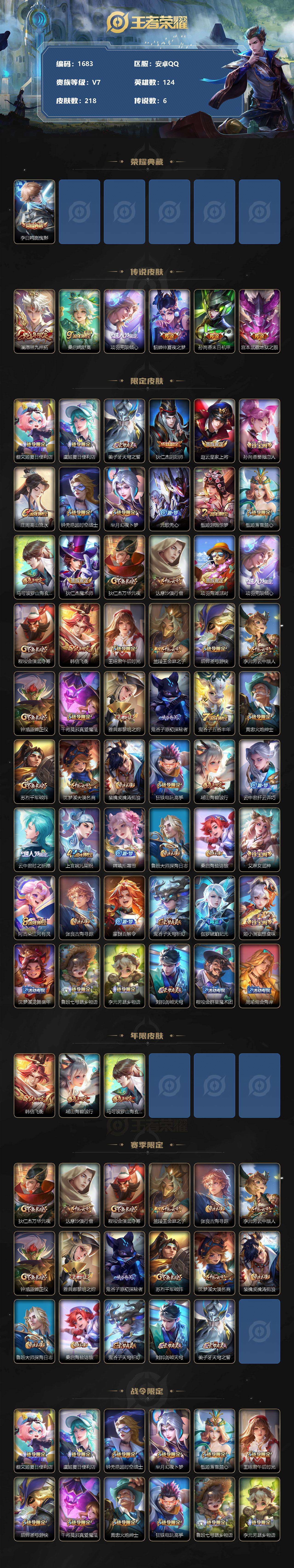 2405528-jtwz-048 可二次 v7 218皮肤 1典藏 6传说 鸣剑·曳影 愿照·九州拓 项羽-无限倾心 器灵·浮梦炉 时之祈愿男 飞衡 山海·碧波行 地狱之眼 仲夏夜之梦 孙尚香-末日机甲 鸣野蒿 逐浪之夏 妄想食味 女武神 无心 蔷薇恋人 街头霸王 特工魅影 水晶猎龙者