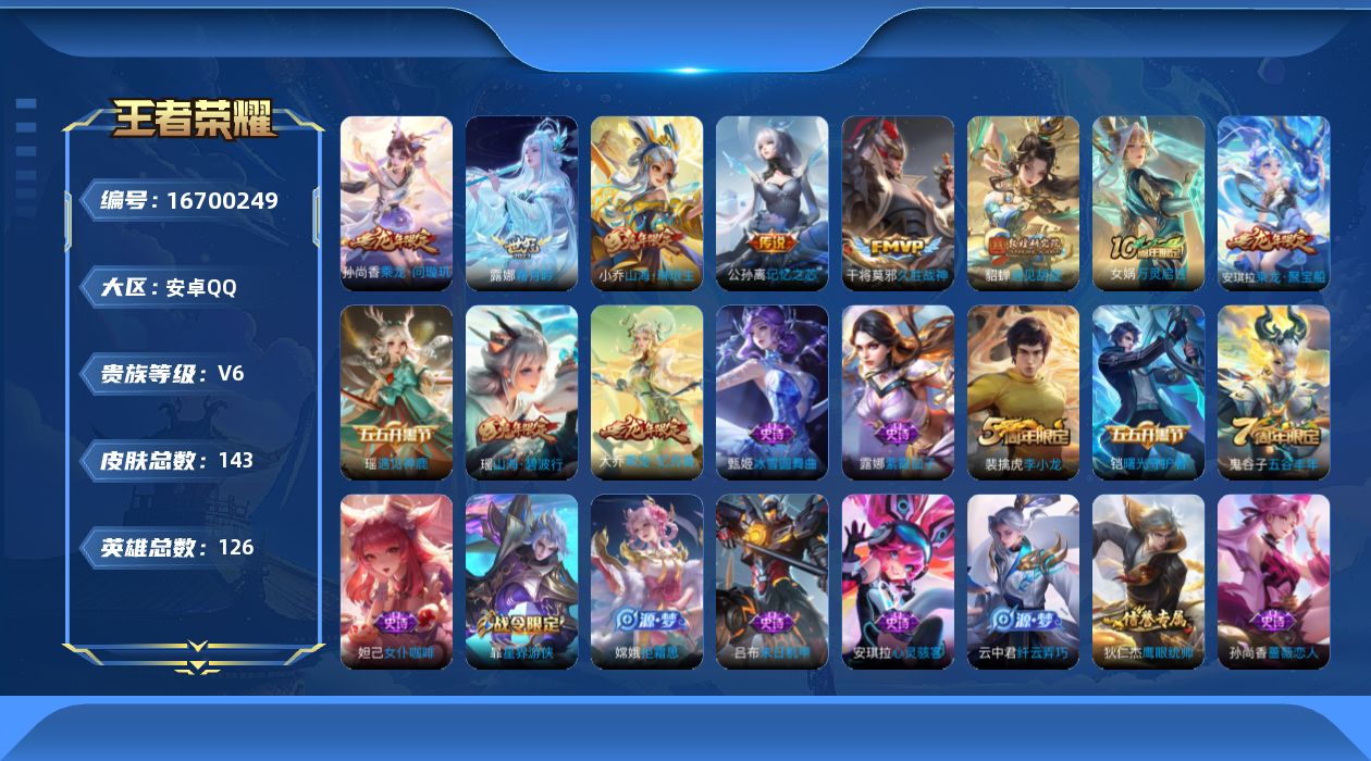 [16700249]v6 6传说 126英雄 143皮肤 可修改实名 女号 【英雄全皮】大禹全皮 【稀有英雄】大司命韩信韩跳跳夏洛特夏师傅艾琳橘右京橘子娜可露露鸟人不知火舞赵云金蝉唐僧戈娅 【传说皮】乘龙·问璇玑孙尚香年限遇见胡旋山海·琳琅生小乔年限久胜战神记忆之芯机甲兔霜月吟 【珍宝阁皮】蔷薇恋人女武神 【赛季/战令皮】古海寻踪s33星界游侠海盐诗旅s30擒涛扼浪s31探海日志s32剑破天穹s35天穹祈灯s34暖冬·兔眠原初探秘者s21万华元夜s22演武夺筹s23驱傩正仪s24千军破阵s25沙漠行僧s26金庭之子s27大漠名商s28云中旅人s29 【史诗皮】乘龙·聚宝船安琪拉年限乘龙·忆丹青大乔年限万灵启世遇见神鹿紫霞仙子偶像歌手江河有灵末日机甲-吕布女仆咖啡水果甜心心灵骇客功夫厨神鬼剑武藏心灵战警舞动绿茵纤云弄巧繁星吟游呼啦呼啦拒霜思缤纷独角兽曙光守护者唤灵魅影圣诞恋歌鹰眼统帅魅力维加斯未来纪元-赵云 【限定皮】山海·碧波行瑶年限高山流水五谷丰年梁祝李小龙 【普通皮】谧流熔炉刘邦虎啸剑宗劲辣红锅春野之旅街头霸王漠中幻影朵莉亚金色潮汐龙舞盛年熔金海岸鹤鸣心笺荣光之誓罗小黑战记-张良溯影追猎糖果风暴线条小狗-桑启潮玩士官长聚星闪耀妄想特派鬼谷子天穹祈灯s34威尼斯狂欢尼罗河女神完美运算万事如意归虚梦演-孙膑归虚梦演-曜归虚梦演-西施海滩丽影海滩派对皇家上将魔术师沉稳之力守护之力化身博士缤纷绘卷乓乓大师天使之翼哥特玫瑰鲨炮海盗猫红桃皇后教廷特使阴阳师死亡骑士少女阿狸忍·炎影秘密基地白色死神冰雪圆舞曲未来纪元-宫本武藏玩偶对对碰幻乐之宴虹云星官孤猎露花倒影修竹墨客幸存者冰刃幻境伊势巫女花见巫女踏雪寻梅未来旅行金属狂潮福禄兄弟万圣前夜异域舞娘东海龙王星航指挥官激情绿茵加勒比小姐熊喵少女赤焰之缨美梦成真森棒球奇才精准探案法街头旋风霓裳曲花间舞绝影神呛阿摩司公爵特种部队范海辛绯红之刃木偶奇遇记精灵公主英