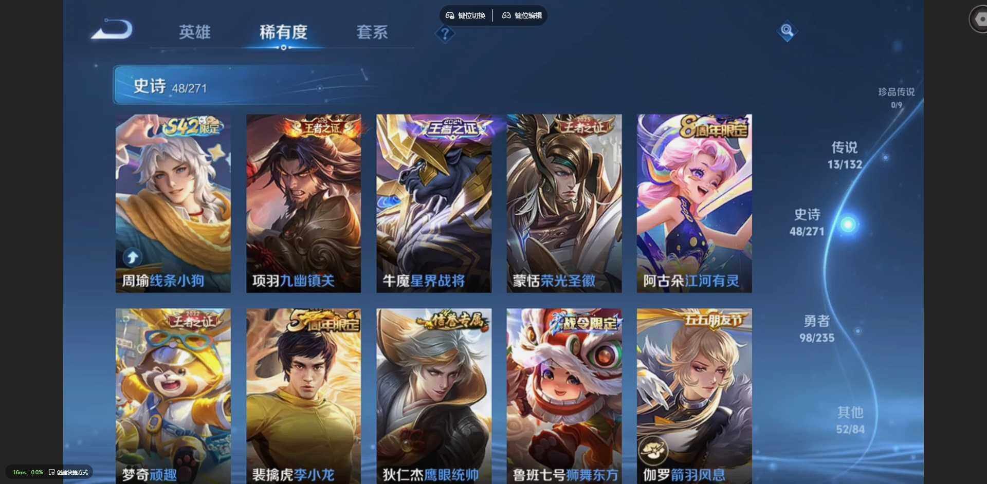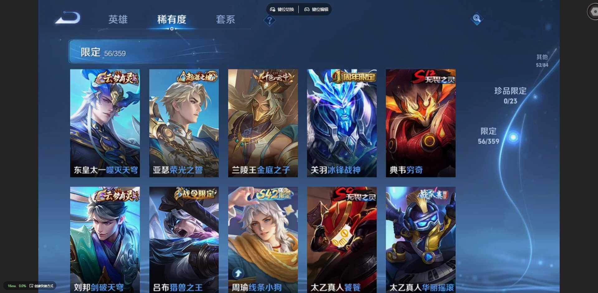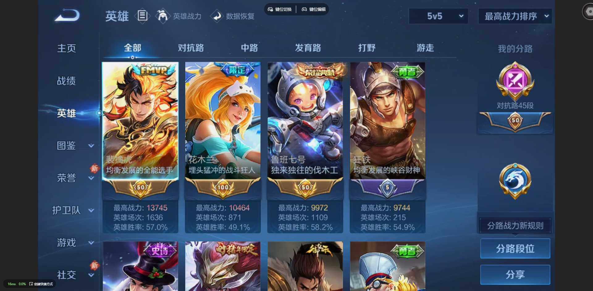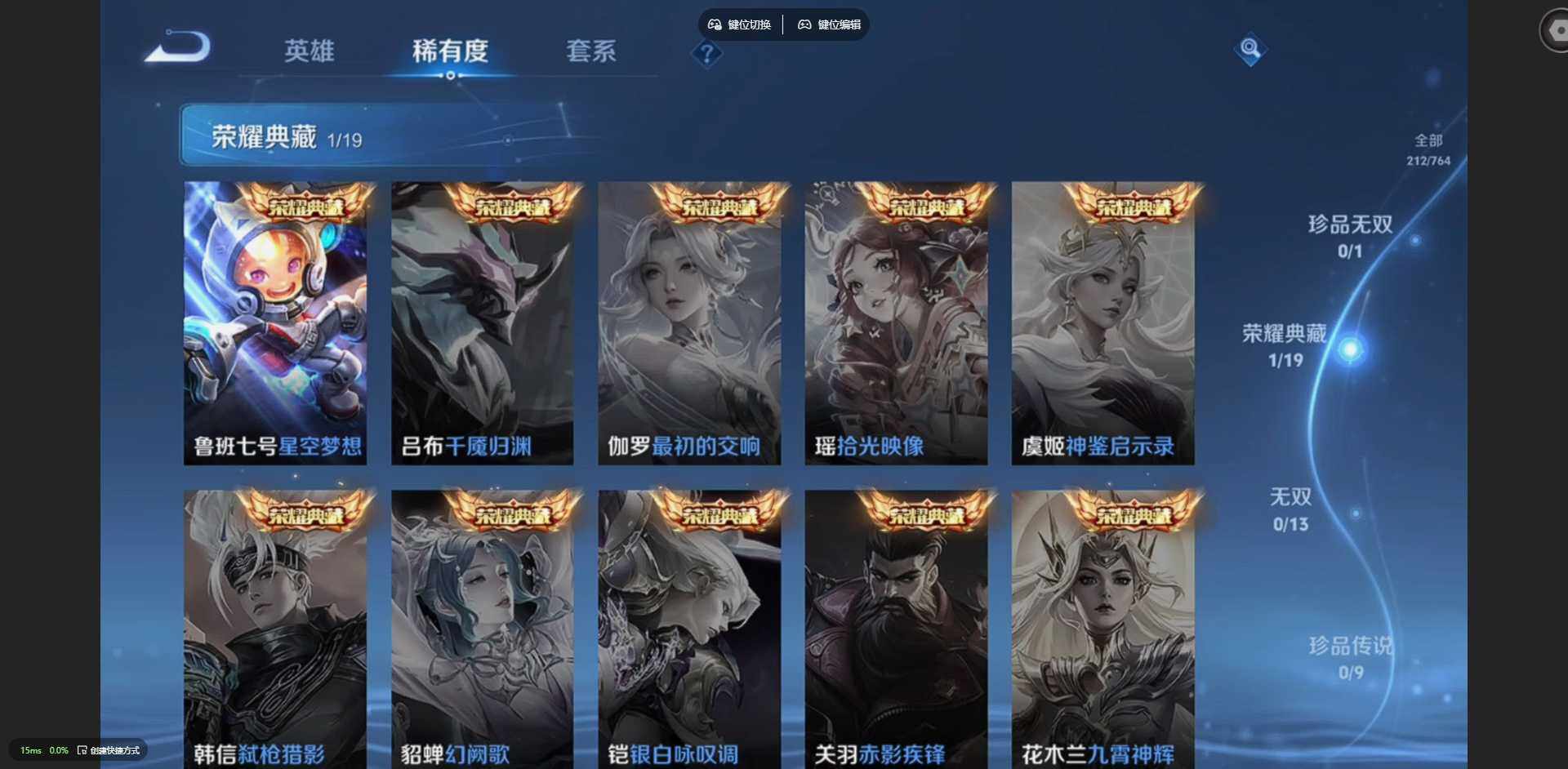 125英雄-212皮肤-【金标裴擒虎 金标花木兰 金标鲁班七号 金标吕布】贵族等级: v8 英雄数: 125 皮肤数: 212 荣耀水晶: 星空梦想 传说皮: 冠军飞将久胜战神炽阳神光云霓雀翎地狱火仲夏夜之梦地狱之眼胖达荣荣超时空战士-狄仁杰祥瑞亨通 限定皮: 冰锋战神遇见飞天李小龙青春决赛季逐梦