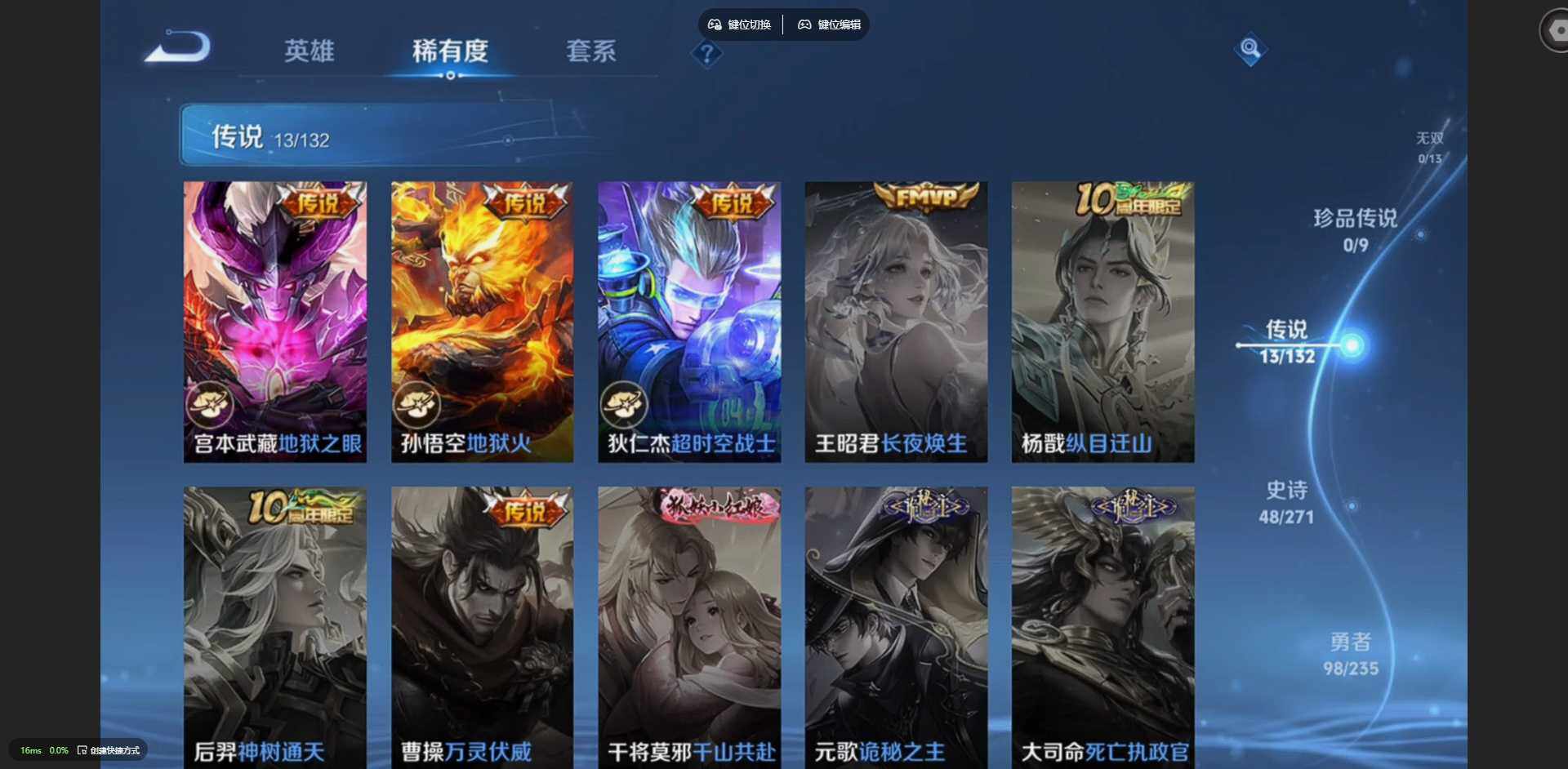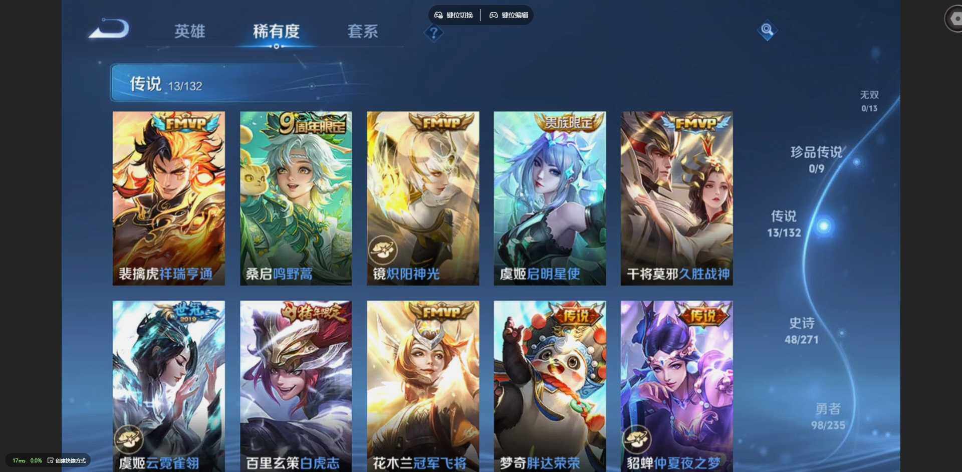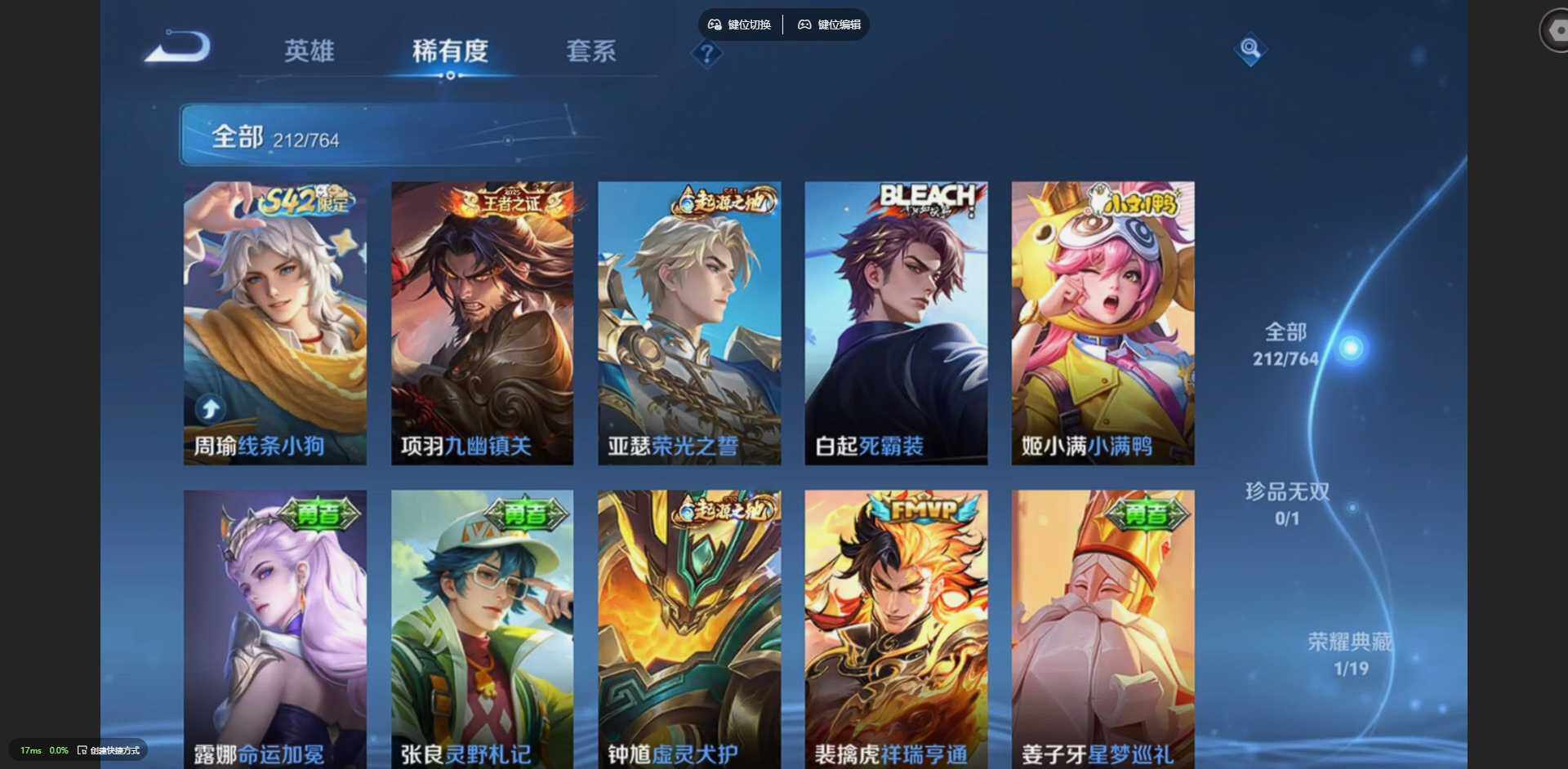 125英雄-212皮肤-【金标裴擒虎 金标花木兰 金标鲁班七号 金标吕布】贵族等级: v8 英雄数: 125 皮肤数: 212 荣耀水晶: 星空梦想 传说皮: 冠军飞将久胜战神炽阳神光云霓雀翎地狱火仲夏夜之梦地狱之眼胖达荣荣超时空战士-狄仁杰祥瑞亨通 限定皮: 冰锋战神遇见飞天李小龙青春决赛季逐梦