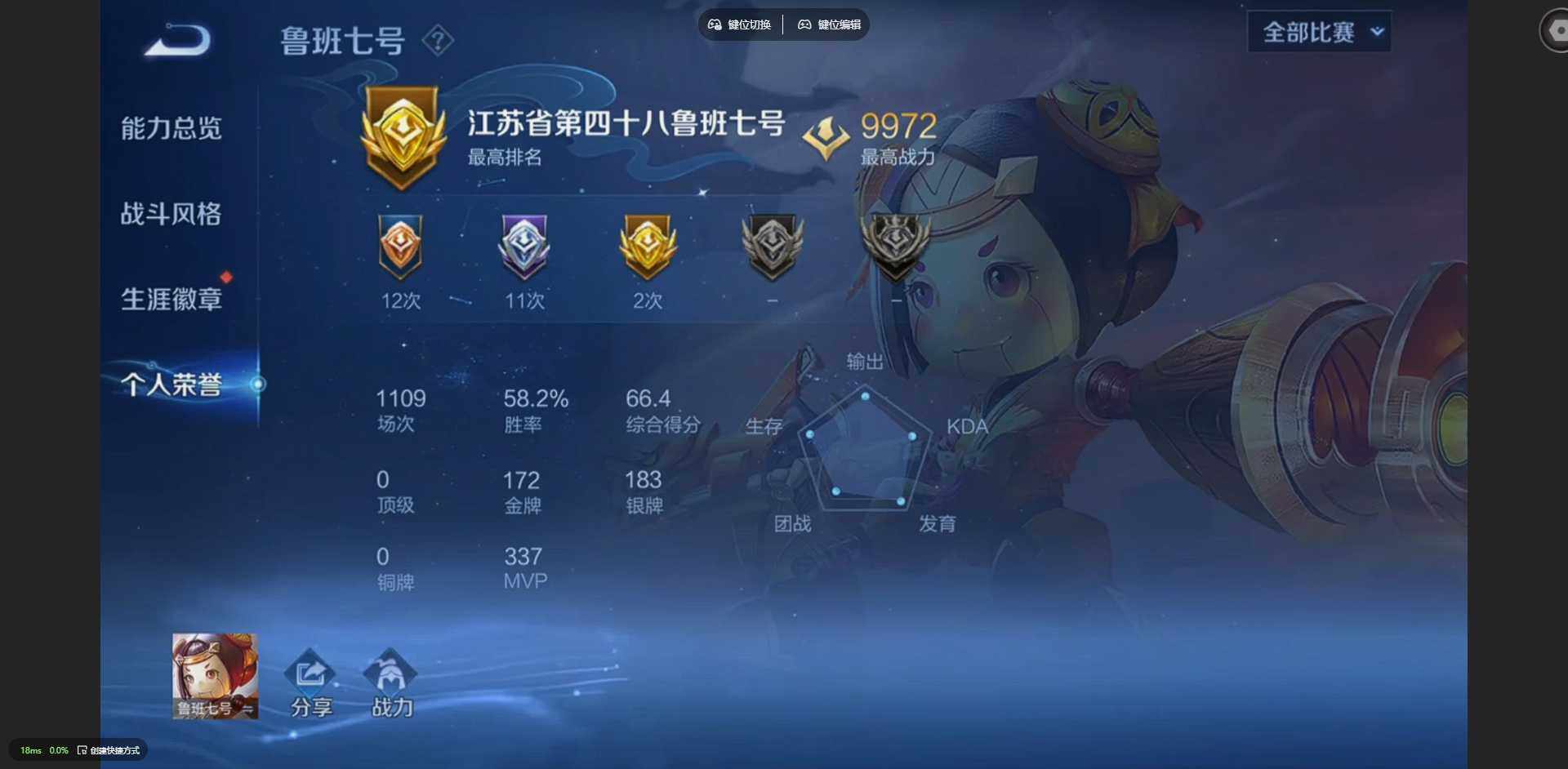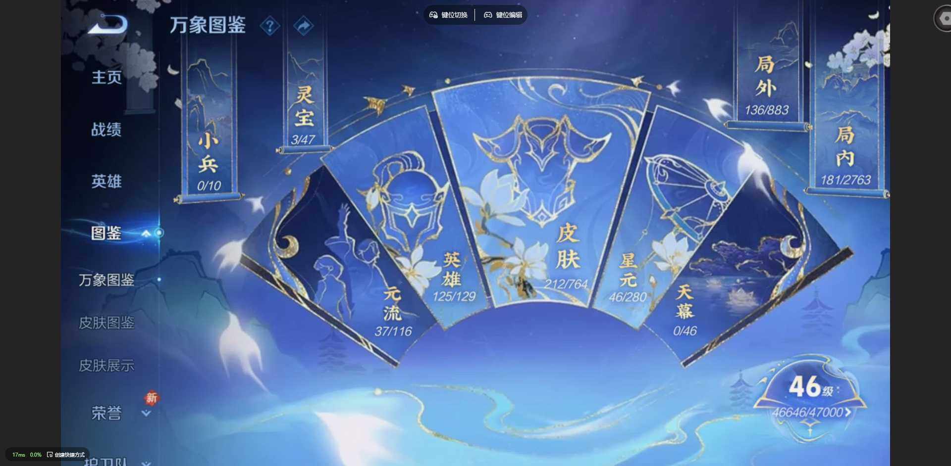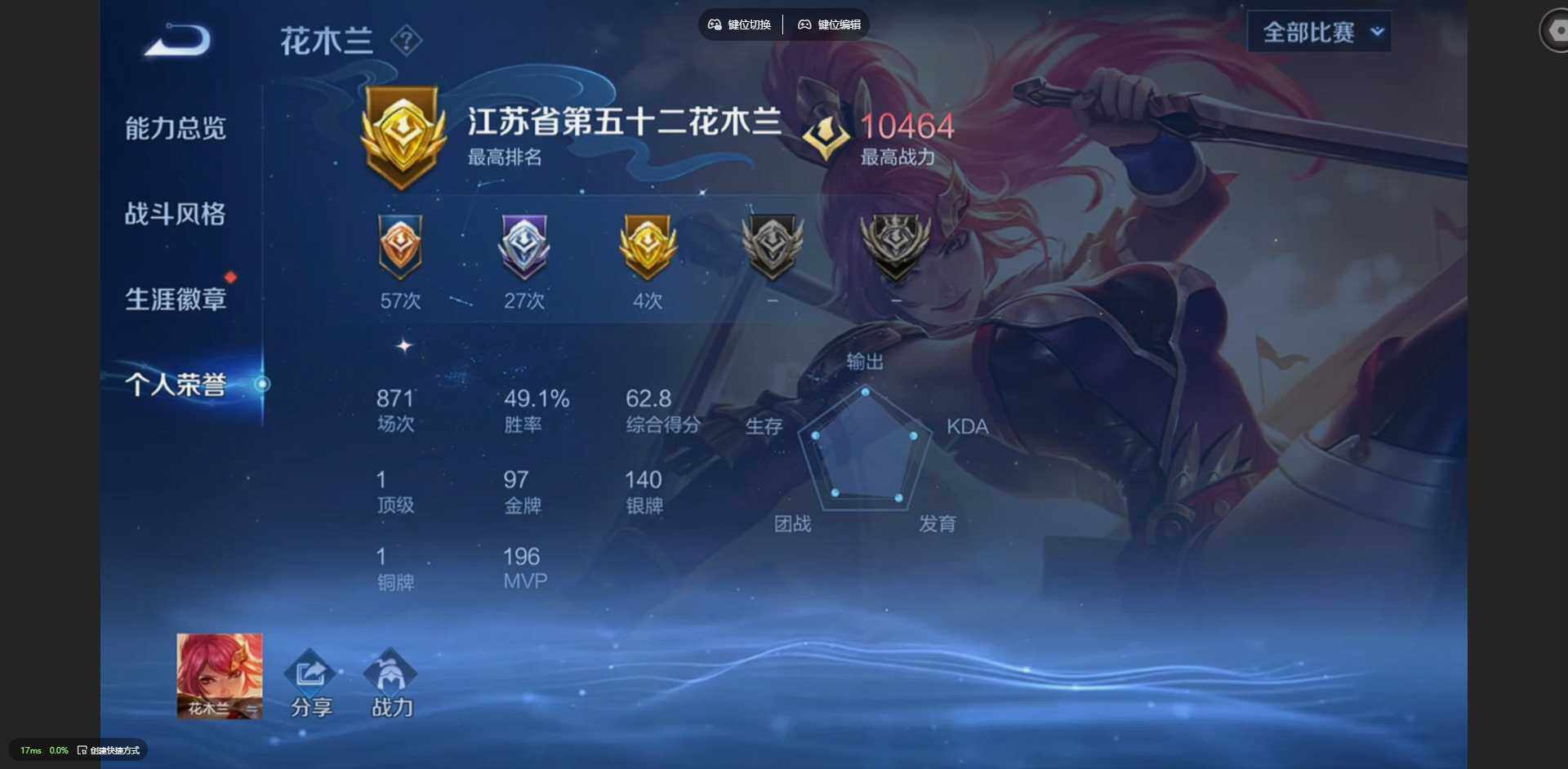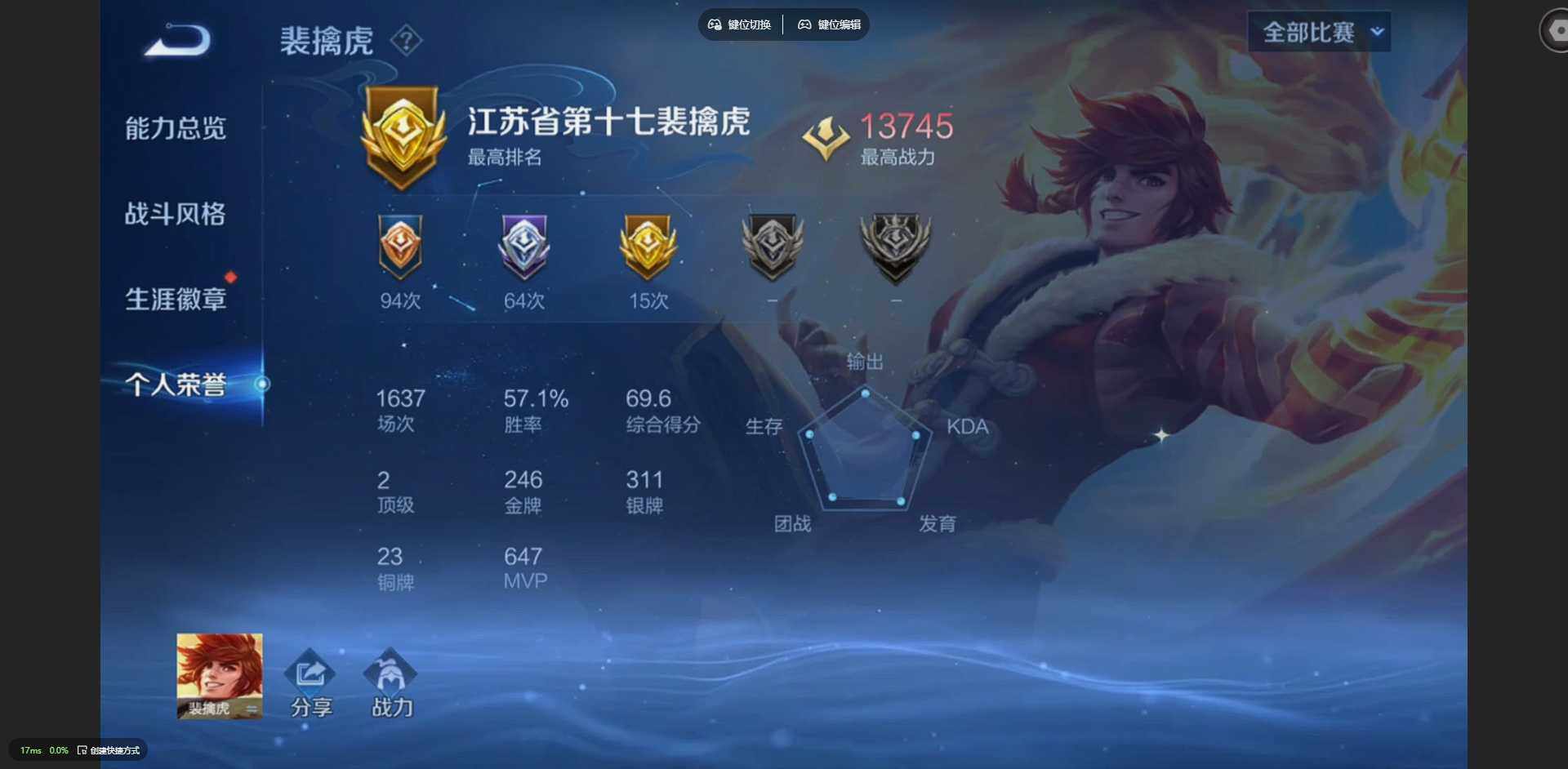 125英雄-212皮肤-【金标裴擒虎 金标花木兰 金标鲁班七号 金标吕布】贵族等级: v8 英雄数: 125 皮肤数: 212 荣耀水晶: 星空梦想 传说皮: 冠军飞将久胜战神炽阳神光云霓雀翎地狱火仲夏夜之梦地狱之眼胖达荣荣超时空战士-狄仁杰祥瑞亨通 限定皮: 冰锋战神遇见飞天李小龙青春决赛季逐梦