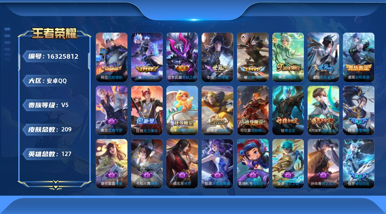 [16325812]【特价出售/店主推荐】安卓q-v5-尊贵铂金i段位-127英雄-209皮肤-1典藏皮肤-8传说-72史诗 【荣耀典藏】:韩信弑呛猎影 【传说皮肤】:后羿神树通天,桑启鸣野蒿,澜逐花归海,虞姬启明星使,曜云鹰飞将,李信一念神魔,虞姬云霓雀翎,宫本武藏地狱之眼 【限定皮肤】:姜子牙天穹之誓,狄仁杰阴阳师,赵云皇家上将,嬴政优雅恋人,高渐离玩趣恶龙,阿轲迷踪丽影,钟无艳超时空战士,扁鹊奇幻香踪,甄姬落雪兰心,马可波罗山海玄木吟,狄仁杰魔术师,项羽海滩派对,韩信傲雪梅呛,孙悟空孙行者,李元芳云中旅人,虞姬启明星使,鬼谷子五谷丰年,铠青龙志,沈梦溪大漠名商,裴擒虎擒涛扼浪,云中君纤云弄巧,上官婉儿梁祝,嫦娥暖冬兔眠,鲁班大师探海日志,桑启海盐诗旅,暃星界游侠,艾琳流音漫舞,司空震地狱燃心,阿古朵江河有灵,张良古海寻踪,蒙犽百解令,鬼谷子天穹祈灯,伽罗琥珀纪元,沈梦溪龙舞盛年,刘邦剑破天穹,上官婉儿群星魔术团,程咬金群星魔术团,镜青焰无极,项羽苍威无极,芈月浮光幕影,周瑜熔金海岸 【年限皮肤】:铠青龙志,马可波罗山海玄木吟 【赛季限定】:张良古海寻踪,李元芳云中旅人,沈梦溪大漠名商,裴擒虎擒涛扼浪,鲁班大师探海日志,桑启海盐诗旅,鬼谷子天穹祈灯,刘邦剑破天穹,姜子牙天穹之誓 【战令限定】:阿轲迷踪丽影,钟无艳超时空战士,扁鹊奇幻香踪,甄姬落雪兰心,艾琳流音漫舞,嫦娥暖冬兔眠,司空震地狱燃心,暃星界游侠,镜青焰无极,项羽苍威无极 【史诗皮肤】:鲁班七号电玩小子,阿轲暗夜猫娘,赵云皇家上将,赵云未来纪元,貂蝉圣诞恋歌,甄姬冰雪圆舞曲,狄仁杰魔术师,廉颇地狱岩魂,宫本武藏鬼剑武藏,孙尚香水果甜心,嬴政优雅恋人,嬴政暗夜贵公子,嬴政摇滚巨星,妲己魅力维加斯,妲己女仆咖啡,墨子金属风暴,吕布圣诞狂欢,刘禅绅士熊喵,李白千年之狐,吕布末日机甲,张飞乱世虎臣,刘邦德古拉伯爵,夏侯惇乘风破浪,小乔缤纷独角兽,诸葛亮黄金分割率,亚瑟心灵战警,雅典娜冰冠公主,安琪拉心灵骇客,百里守约特工魅影,铠曙光守护者,蔡文姬舞动绿茵,刘禅天才门将,李元芳逐浪之夏,程咬金功夫厨神,白起星夜王子,阿轲节奏热浪,孙策猫狗日记,铠青龙志,伽罗箭羽风息,狄仁杰鹰眼统帅,公孙离无限星赏官,上官婉儿梁祝,娜可露露晚萤,大乔白蛇,小乔青蛇,不知火舞魅语,阿轲迷踪丽影,橘右京修罗,孙尚香时之恋人,云中君纤云弄巧,杨戬天秀启明