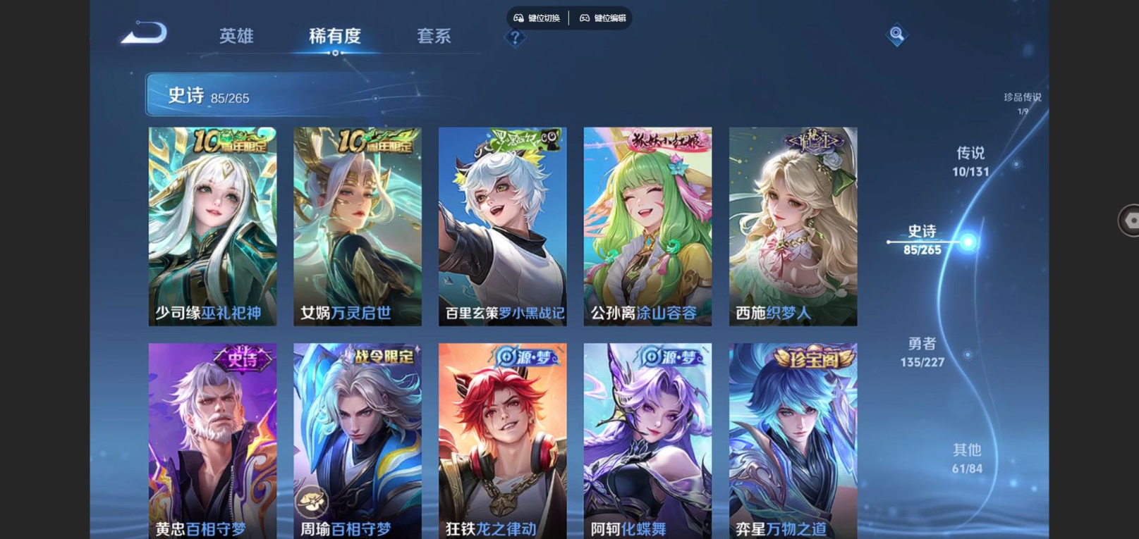 126英雄-293皮肤-v8-1典藏1珍品传说10传说 打野34段 2星传说幽冥之眼 金色仲夏夜 【全皮英雄】 鬼谷子全皮 戈娅全皮 【典藏】 弑呛猎影 【珍品传说】 酷洛米之心 【传说】 祥瑞亨通 鸣野蒿 启明星使 齐天大圣 无双飞将 诗剑行 炽阳神光 一念神魔 黄金狮子座 地狱之眼 【热门】万灵