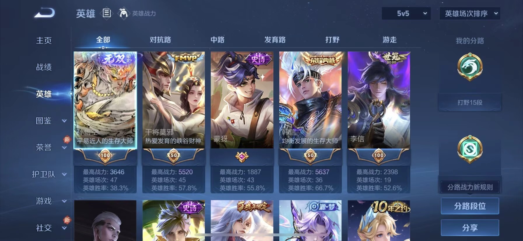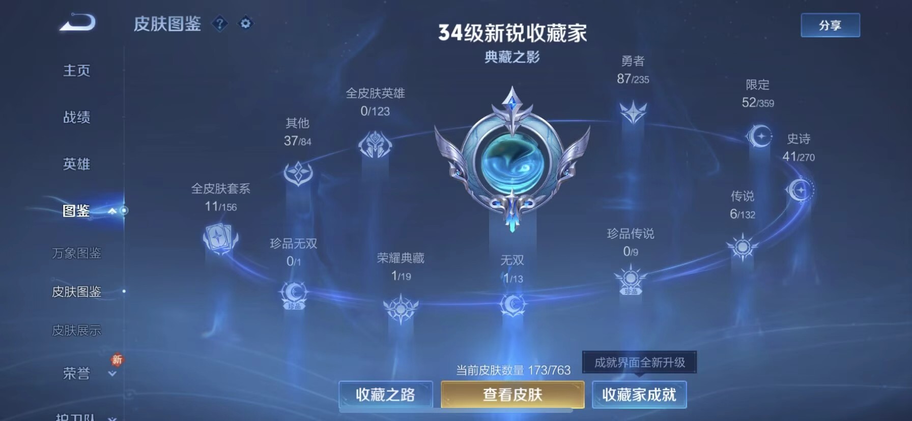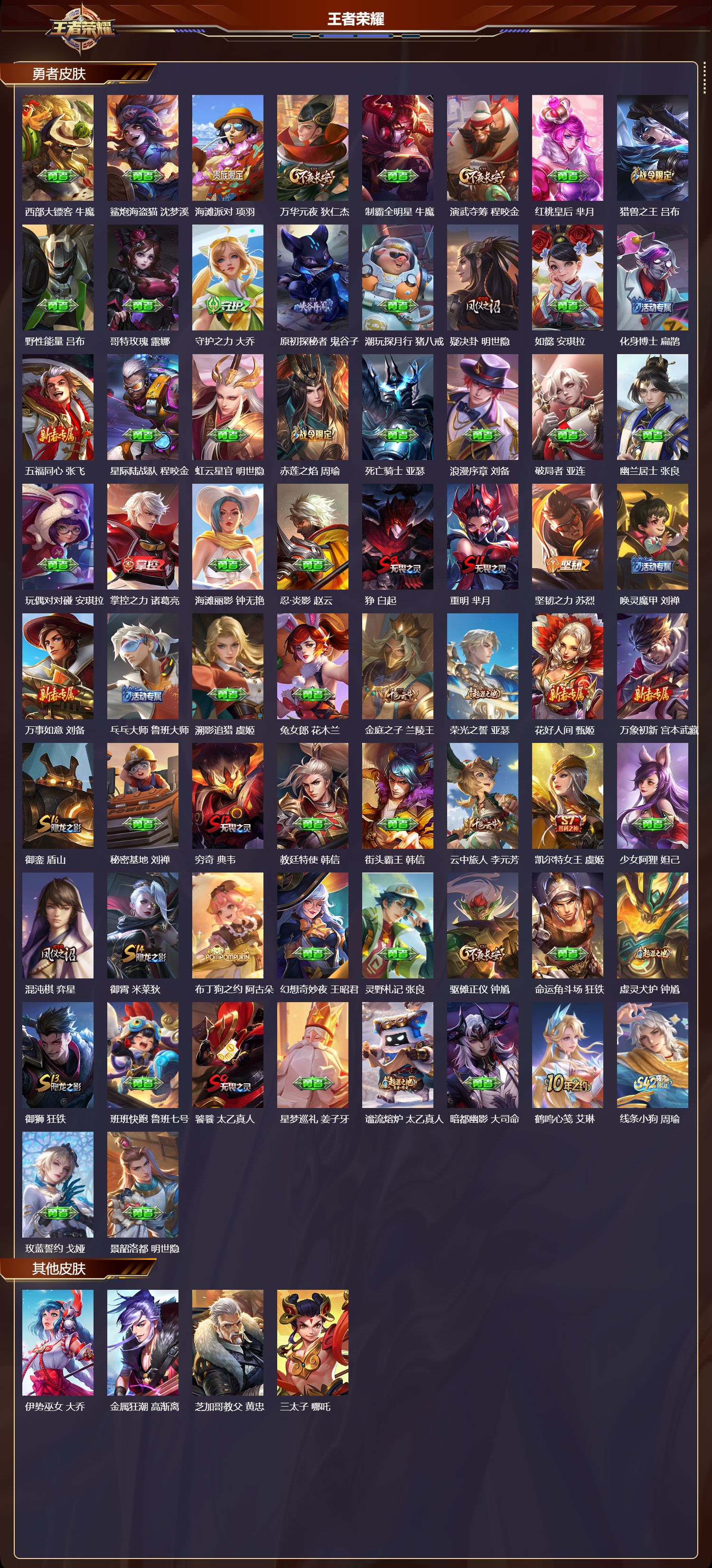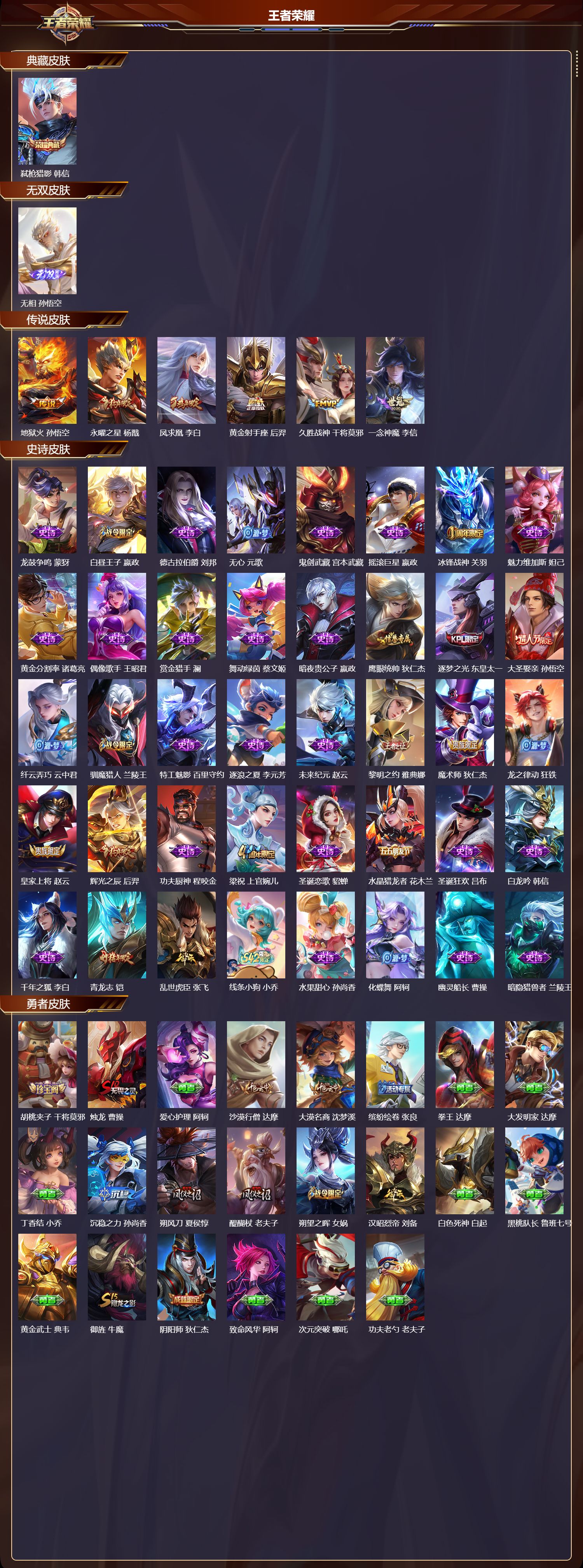 苹果qq/最强王者/173皮肤/127英雄/1典藏/0珍品无双/1无双/0珍品传说/6传说/40史诗/8稀有英雄【1 典藏皮肤】弑呛猎影 韩信【1 无双皮肤】无相 孙悟空【6 传说皮肤】地狱火 孙悟空永曜之星 杨戬凤求凰 李白黄金射手座 后羿久胜战神 干将莫邪一念神魔 李信【40 史诗皮肤】龙鼓争鸣 蒙犽白昼王子 嬴政德古拉伯爵 刘邦无心 元歌鬼剑武藏 宫本武藏摇滚巨星