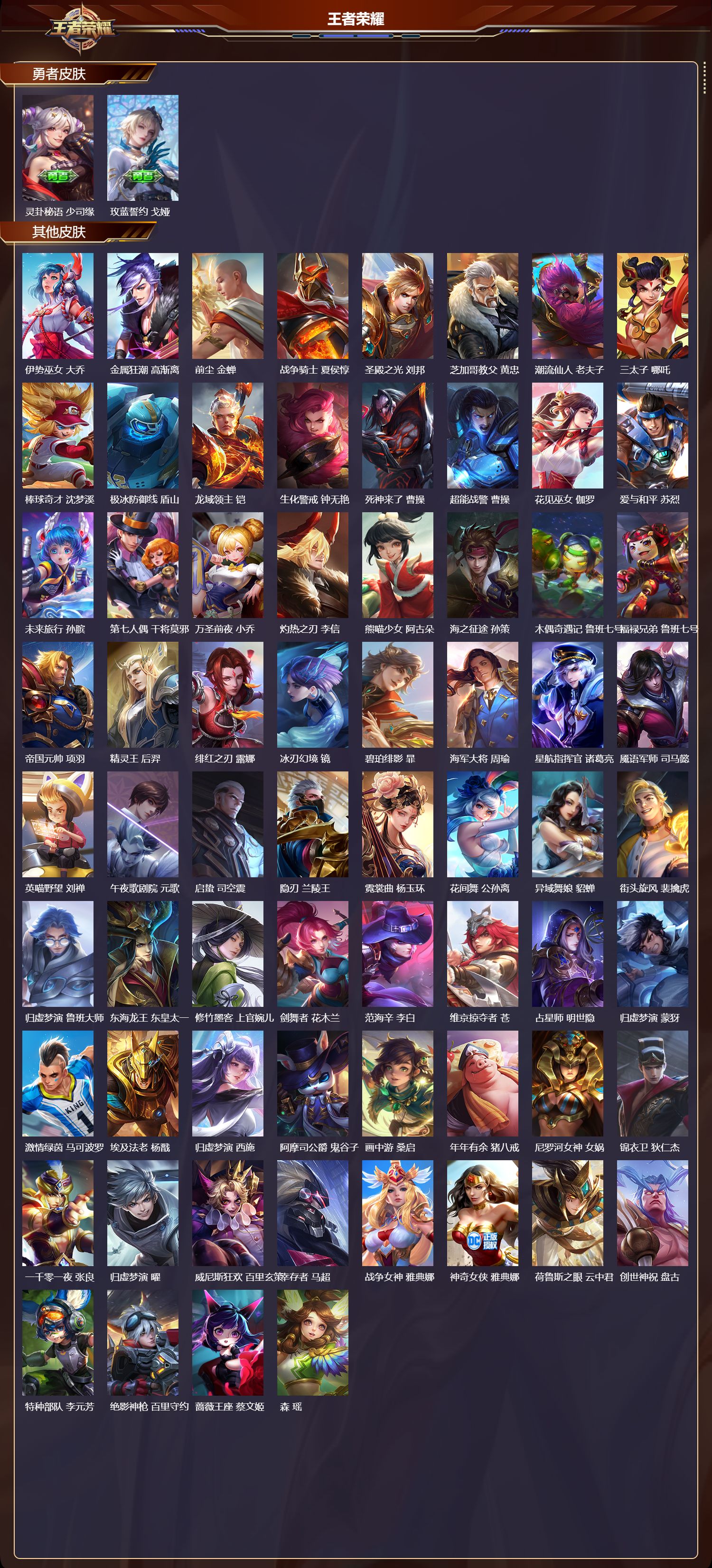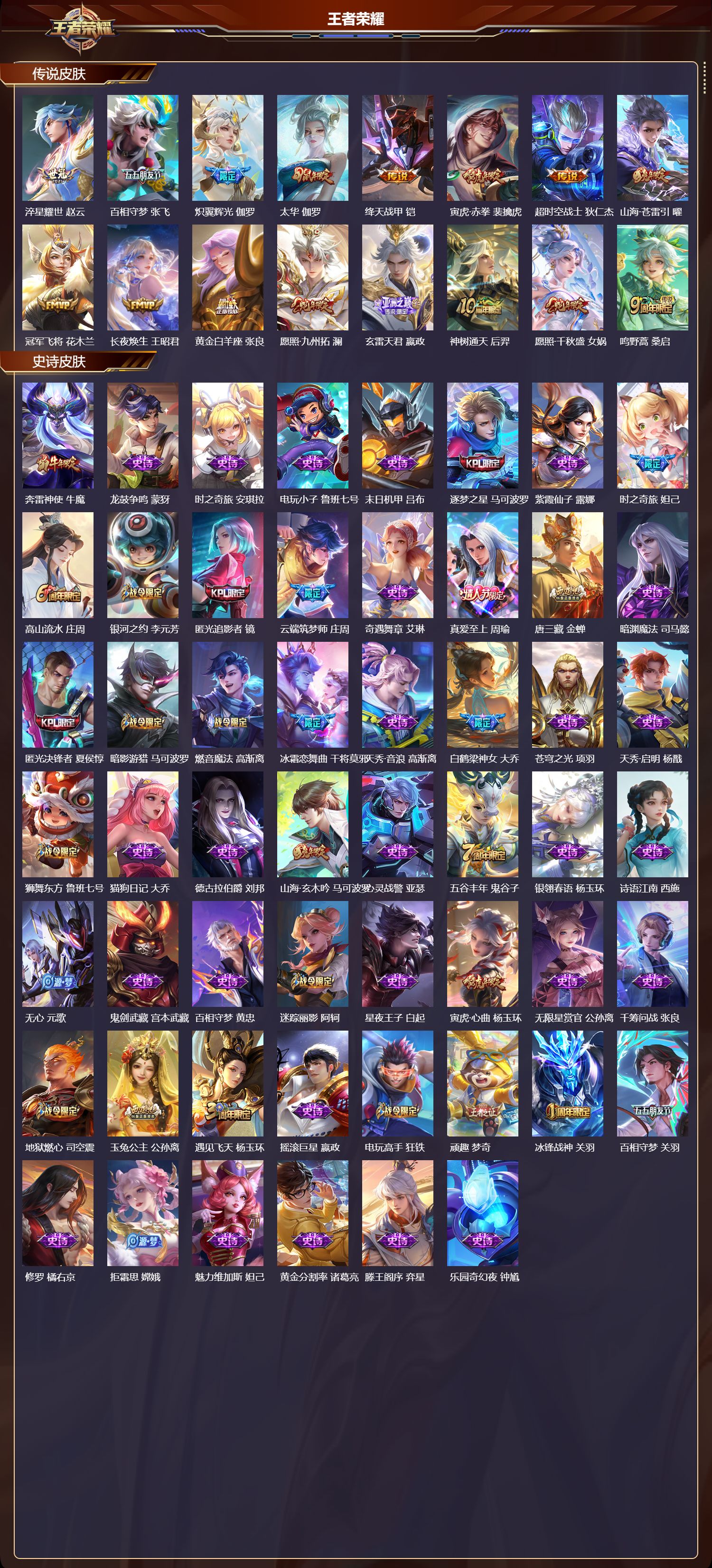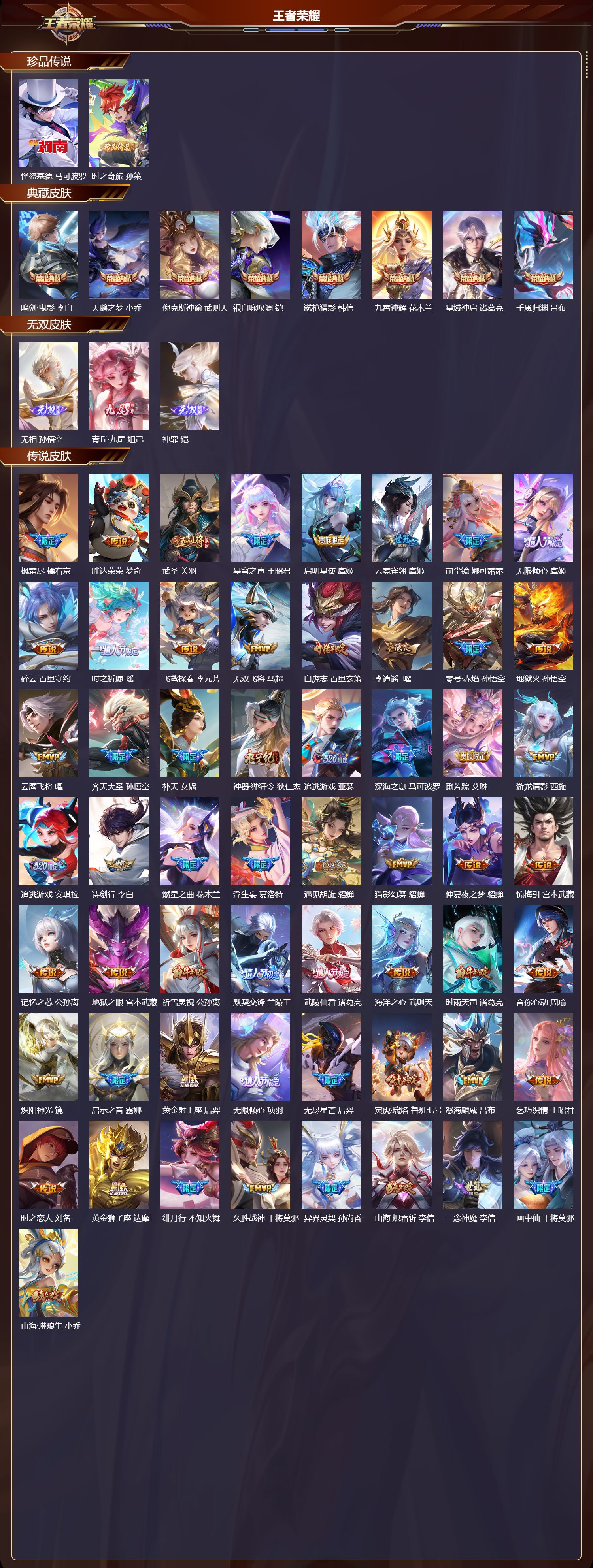 127英雄-503皮肤-安卓qq/至尊星耀/503皮肤/127英雄/8典藏/0珍品无双/3无双/2珍品传说/73传说/174史诗/10稀有英雄【2 珍品传说】怪盗基德 马可波罗时之奇旅 孙策【8 典藏皮肤】鸣剑·曳影 李白天鹅之梦 小乔倪克斯神谕 武则天银白咏叹调 铠弑呛猎影 韩信九霄神辉 花木兰星域神启 诸葛亮千魇归渊 吕布【3 无双皮肤】无相 孙悟空青丘·九尾 妲己神罪 铠【73 传说皮肤】