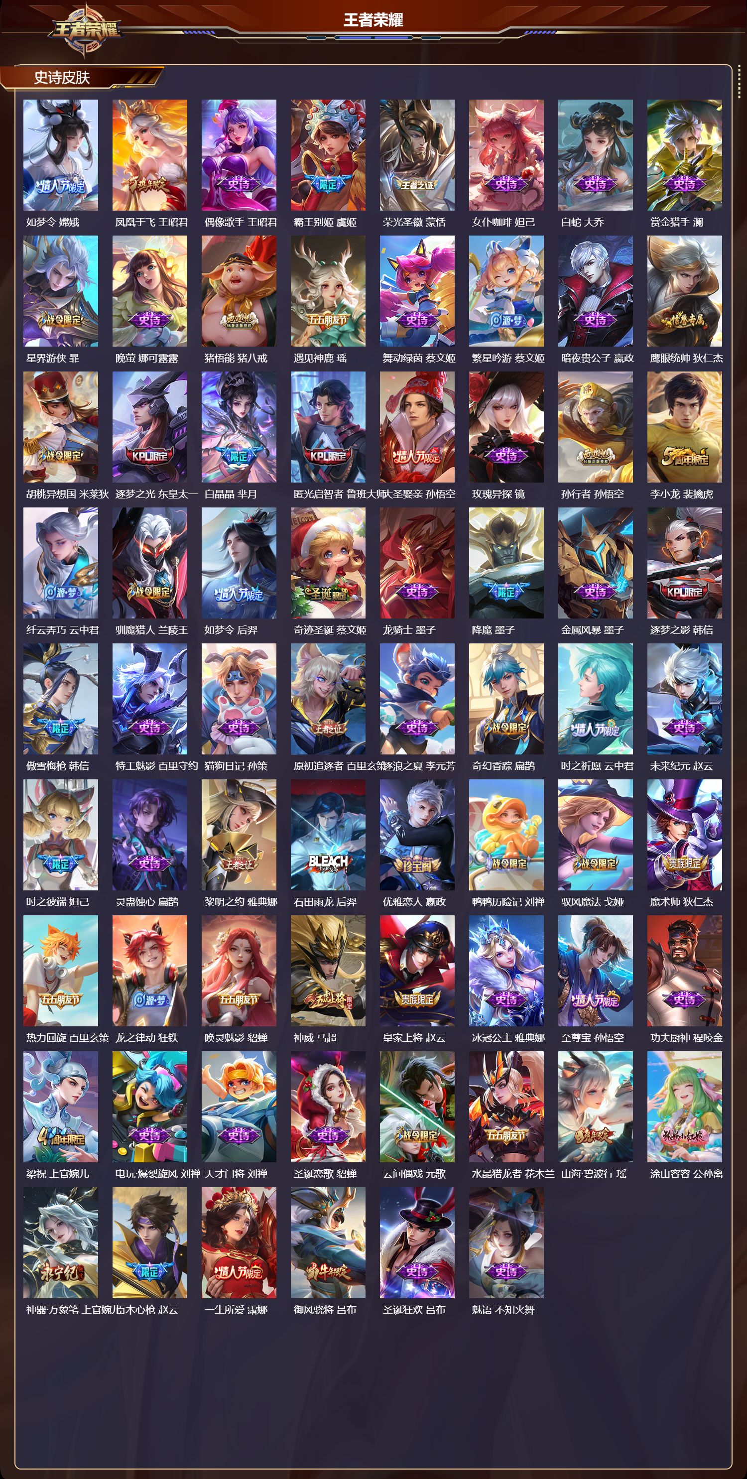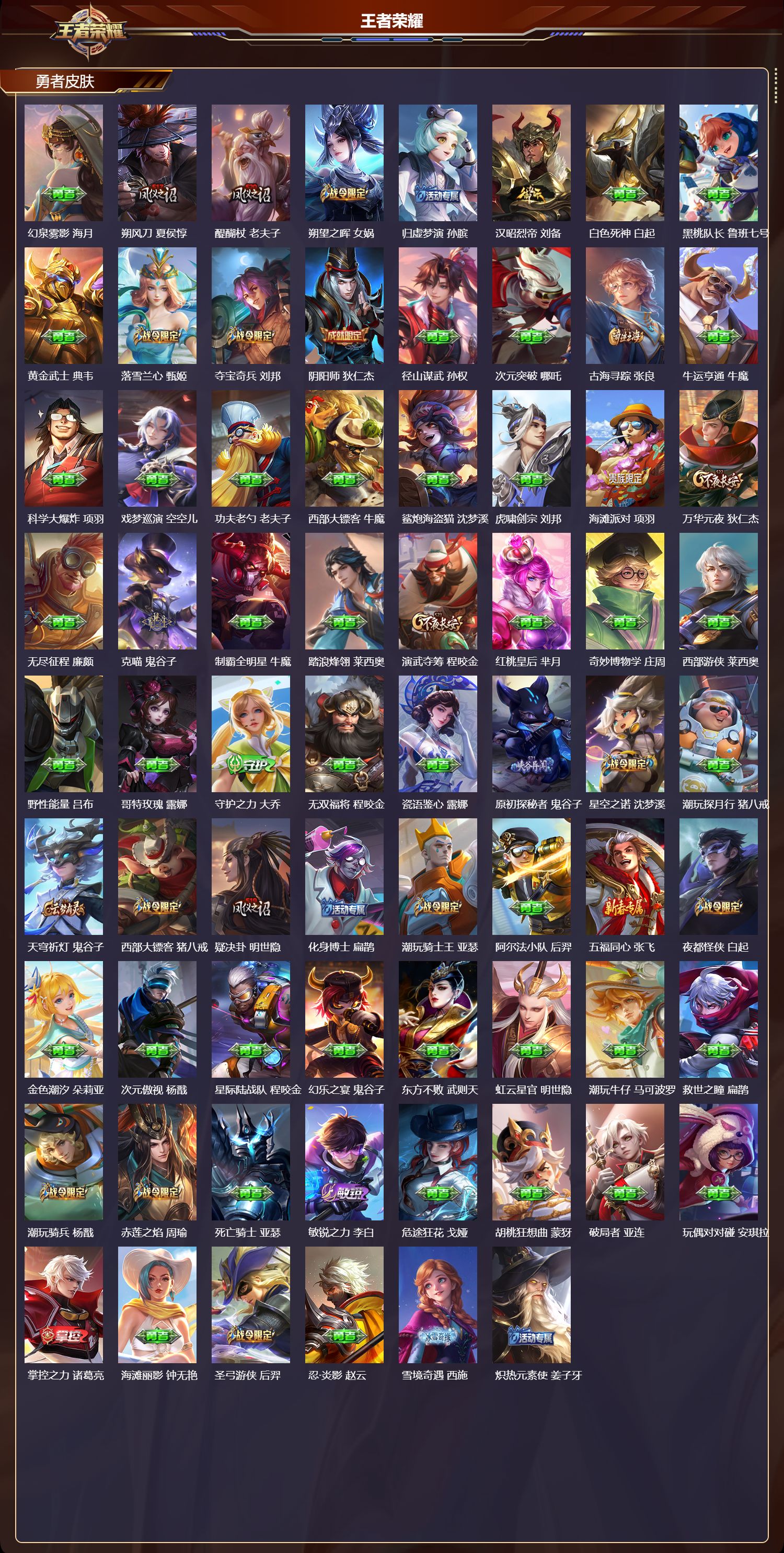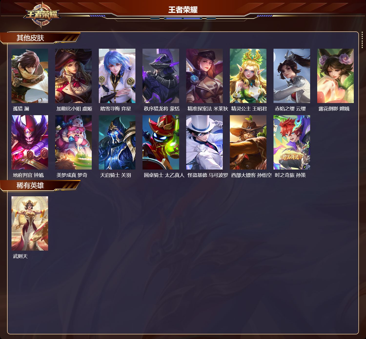 127英雄-503皮肤-安卓qq/至尊星耀/503皮肤/127英雄/8典藏/0珍品无双/3无双/2珍品传说/73传说/174史诗/10稀有英雄【2 珍品传说】怪盗基德 马可波罗时之奇旅 孙策【8 典藏皮肤】鸣剑·曳影 李白天鹅之梦 小乔倪克斯神谕 武则天银白咏叹调 铠弑呛猎影 韩信九霄神辉 花木兰星域神启 诸葛亮千魇归渊 吕布【3 无双皮肤】无相 孙悟空青丘·九尾 妲己神罪 铠【73 传说皮肤】