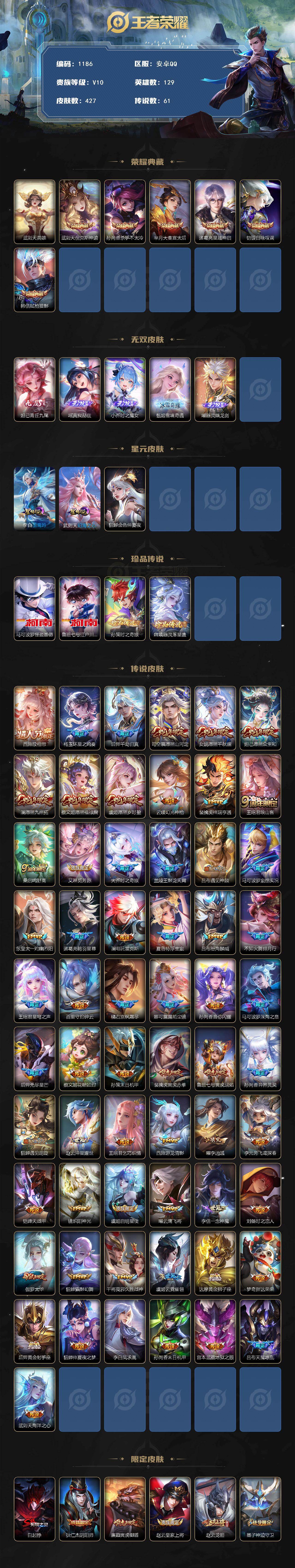 129英雄-427皮肤-安卓q-v10-永恒钻石ii段位-129英雄-427皮肤-6典藏皮肤-1典藏英雄-5无双-4珍品传说-61传说-135史诗 【英雄全皮】:达摩全皮,孙权全皮,娜可露露全皮,橘右京全皮,杨玉环全皮,苍全皮,夏洛特全皮,司空震全皮,金蝉全皮,空空儿全皮,影全皮 【荣耀典藏】:武则天英雄,武则天倪克斯神谕,孙尚香杀手不太冷,芈月大秦宣太后,诸葛亮星域神启,铠银白咏叹调,韩信弑呛猎影 【无双皮肤】:妲
