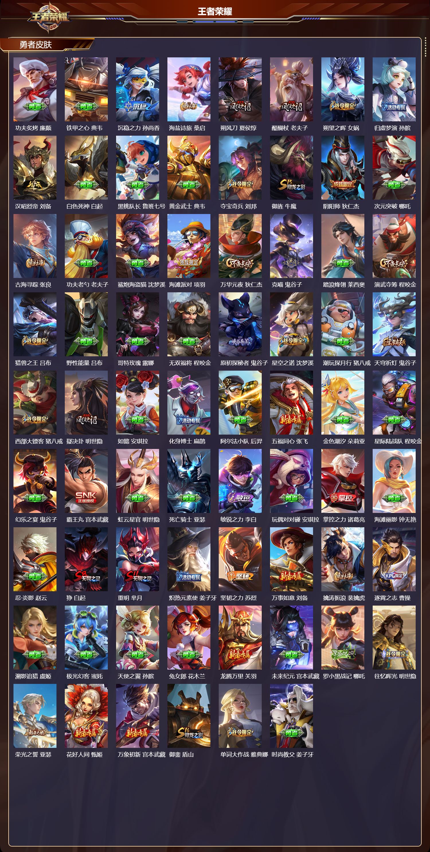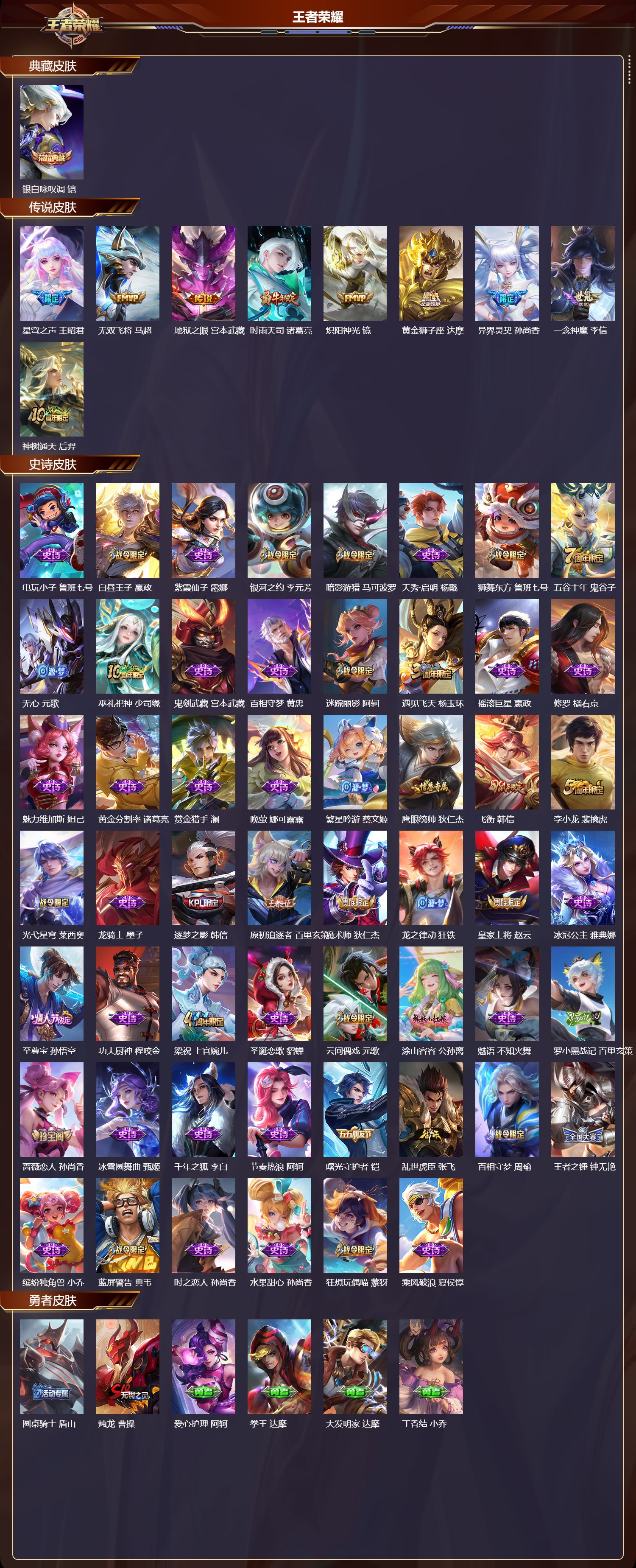 苹果qq/至尊星耀/217皮肤/124英雄/1典藏/0珍品无双/0无双/0珍品传说/9传说/54史诗/7稀有英雄【1 典藏皮肤】银白咏叹调 铠【9 传说皮肤】星穹之声 王昭君无双飞将 马超地狱之眼 宫本武藏时雨天司 诸葛亮炽阳神光 镜黄金狮子座 达摩异界灵契 孙尚香一念神魔 李信神树通天 后羿【54 史诗皮肤】电玩小子 鲁班七号白昼王子 嬴政紫霞仙子 露娜银河之约 李元芳