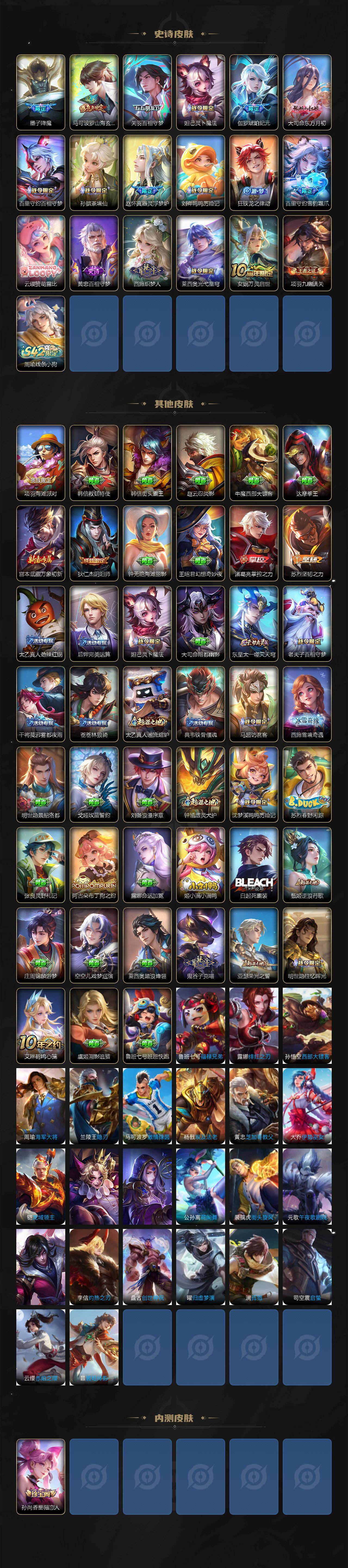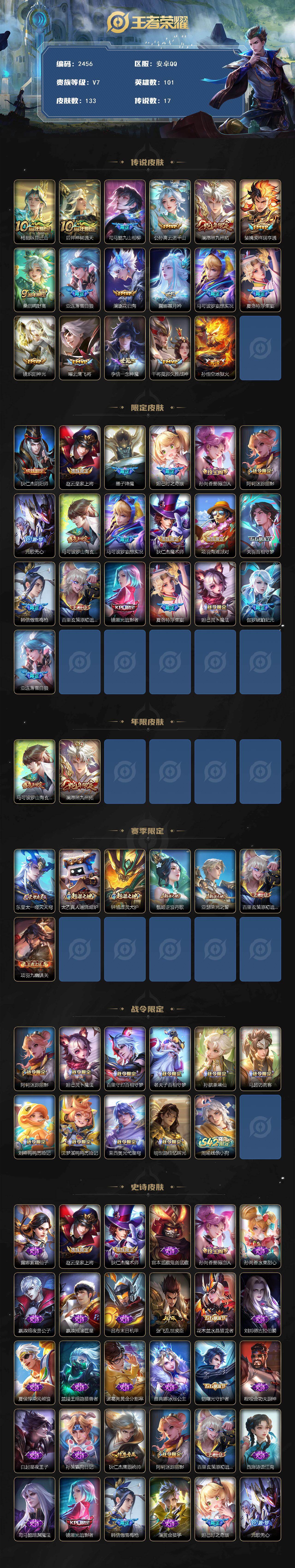 101英雄-133皮肤-【2456】安卓q-v7-至尊星耀v段位-101英雄-133皮肤-17传说-47史诗 【英雄全皮】:司马懿全皮,空空儿全皮 【传说皮肤】:杨戬纵目迁山,后羿神树通天,司马懿九山相柳,公孙离云诺千山,澜愿照九州拓,裴擒虎祥瑞亨通,桑启鸣野蒿,亚连落雪白狼,澜逐花归海,露娜霜月吟,马可波罗妄想实况,夏洛特浮生妄,镜炽阳神光,曜云鹰飞将,李信一念神魔,干将莫邪久胜战神,孙悟空地狱火 【限定皮肤】:狄