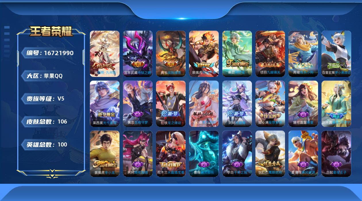[16721990]v5 5传说 100英雄 106皮肤 可修改实名 男号 【英雄全皮】大禹全皮 【稀有英雄】大司命嬴政始皇帝韩信韩跳跳夏洛特夏师傅艾琳橘右京橘子娜可露露鸟人不知火舞戈娅 【传说皮】典韦战鼓燎原祥瑞亨通地狱之眼 【珍宝阁皮】妄想食味 【赛季/战令皮】噬灭天穹s37古海寻踪s33探海日志s32流音漫舞剑破天穹s35天穹祈灯s34天穹之誓s36虞姬夏日便利店 【史诗皮】东方月初器灵·浮梦炉星界战将蒙犽顽岩魄百相守梦-黄忠线条小狗-周瑜九幽镇关罗小黑战记-百里玄策化蝶舞光弋星穹龙之律动特工魅影千年之狐暗夜猫娘晚萤偶像歌手猫狗日记-孙策节奏热浪水果甜心星夜王子德古拉伯爵幽灵船长鬼剑武藏天秀·启明乘风破浪逐浪之夏水晶猎龙者金属风暴原初追逐者圣诞狂欢鹰眼统帅魅力维加斯黎明之约 【限定皮】愿照·九州拓澜年限鸣野蒿李小龙 【普通皮】谧流熔炉雪境奇遇-西施街头霸王熔金海岸暗都幽影铁骨偃魂玫蓝誓约浪漫序章罗小黑战记-哪吒荣光之誓往忆晖光鹤鸣心笺克喵虚灵犬护春野闲踪布丁狗之约灵野札记逆浪荇歌踏浪烽翎鬼谷子天穹祈灯s34威尼斯狂欢蔚蓝守将归虚梦演-曜海滩派对皇家上将掌控之力纽约教父特工战影乓乓大师黄金武士次元突破功夫老勺鲨炮海盗猫星际陆战队(程咬金)阴阳师汉昭烈帝死亡骑士白执事爱心护理铁甲之心未来纪元-宫本武藏拳王幸存者荷鲁斯之眼龙域领主埃及法老维京掠夺者激情绿茵赤焰之缨启蛰秩序猎龙将创世神祝街头旋风范海辛隐刃绯红之刃西部大镖客-孙悟空帝国元帅碧珀绯影