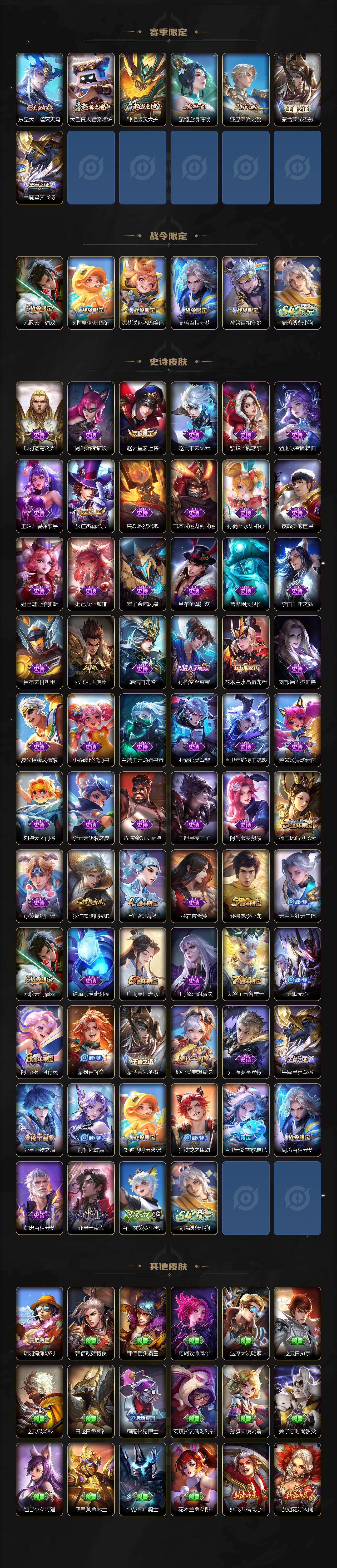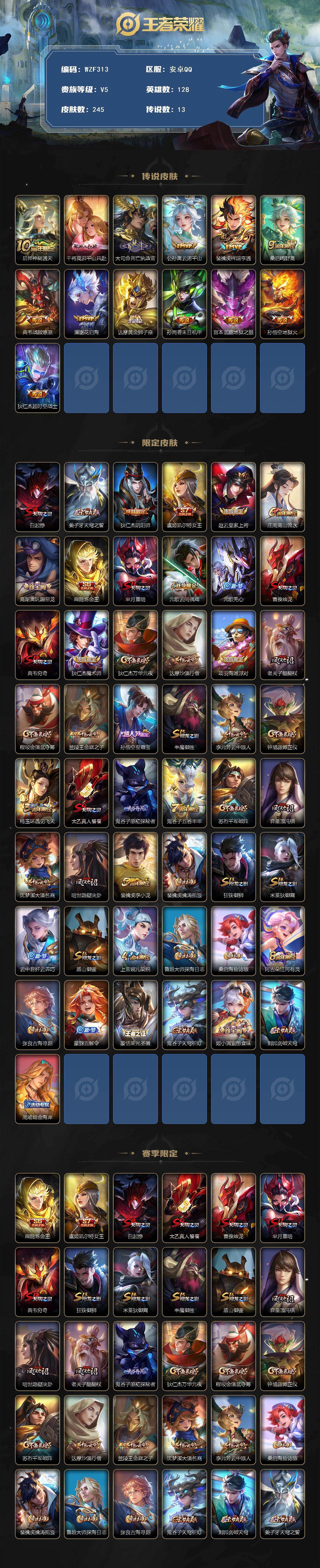 【wzf313】贵族5/皮肤245/传说13/史诗63/英雄128/孙权全皮/影全皮/后羿神树通天/干将莫邪千山共赴/大司命死亡执政官/公孙离云诺千山/裴擒虎祥瑞亨通/桑启鸣野蒿/典韦战鼓燎原/澜逐花归海/达摩黄金狮子座/孙尚香末日机甲/宫本武藏地狱之眼/孙悟空地狱火/狄仁杰超时空战士/白起狰/姜子牙天穹之誓/狄仁杰阴阳师/虞姬凯尔特女王/赵云皇家上将/庄周高山流水/高渐离玩趣恶龙/扁鹊炼金王/芈月重明/元歌云间偶戏/元歌无心/曹操烛龙/典韦穷奇/狄仁杰魔术师/狄仁杰万华元夜/达摩沙漠行僧/项羽海滩派对/老夫子醍醐杖/程咬金演武夺筹/兰陵王金庭之子/孙悟空至尊宝/牛魔御旌/李元芳云中旅人/钟馗驱傩正仪/杨玉环遇见飞天/太乙真人饕餮/鬼谷子原初探秘者/鬼谷子五谷丰年/苏烈千军破阵/弈星混沌棋/沈梦溪大漠名商/明世隐疑决卦/裴擒虎李小龙/裴擒虎擒涛扼浪/狂铁御狮/米莱狄御霄/云中君纤云弄巧/盾山御銮/上官婉儿梁祝/鲁班大师探海日志/桑启海盐诗旅/阿古朵江河有灵/张良古海寻踪/蒙犽百解令/蒙恬荣光圣徽/鬼谷子天穹祈灯/姬小满妄想食味/刘邦剑破天穹/周瑜熔金海岸/东皇太一噬灭天穹/太乙真人谧流熔炉/钟馗虚灵犬护/甄姬逆浪荇歌/亚瑟荣光之誓/牛魔星界战将/刘禅鸭鸭历险记/沈梦溪鸭鸭历险记/周瑜百相守梦/孙策百相守梦/周瑜线条小狗/项羽苍穹之光/阿轲暗夜猫娘/赵云未来纪元/貂蝉圣诞恋歌/甄姬冰雪圆舞曲/王昭君偶像歌手/廉颇地狱岩魂/宫本武藏鬼剑武藏/孙尚香水果甜心/嬴政摇滚巨星/妲己魅力维加斯/妲己女仆咖啡/墨子金属风暴/吕布圣诞狂欢/曹操幽灵船长/李白千年之狐/吕布末日机甲/张飞乱世虎臣/韩信白龙吟/花木兰水晶猎龙者/刘邦德古拉伯爵/夏侯惇乘风破浪/小乔缤纷独角兽/兰陵王暗隐猎兽者/亚瑟心灵战警/百里守约特工魅影/蔡文姬舞动绿茵/刘禅天才门将/李元芳逐浪之夏/程咬金功夫厨神/白起星夜王子/阿轲节奏热浪/孙策猫狗日记/狄仁杰鹰眼统帅/橘右京修罗/钟馗乐园奇幻夜/司马懿暗渊魔法/马可波罗星界特工/弈星万物之道/阿轲化蝶舞/狂铁龙之律动/百里守约雪豹霜爪/黄忠百相守梦/弈星守夜人/百里玄策罗小黑战记/韩信教廷特使/韩信街头霸王/阿轲致命风华/达摩大发明家/赵云白执事/赵云忍炎影/白起白色死神/扁鹊化身博士/安琪拉玩偶对对碰/孙膑天使之翼/姜子牙时尚教父/妲己少女阿狸/典韦黄金武士/亚瑟死亡骑士/花木兰兔女郎/张飞五福同心/甄姬花好人间/刘备万事如意/宫本武藏万象初新/刘备纽约教父/关羽龙腾万里/墨子进击墨子号/钟无艳海滩丽影/宫本武藏霸王丸/王昭君幻想奇妙夜/老夫子功夫老勺/诸葛亮掌控之力/鬼谷子幻乐之宴/苏烈坚韧之力/大乔守护之力/明世隐虹云星官/小乔丁香结/吕布野性能量/孙膑归虚梦演/沈梦溪鲨炮海盗猫/哪吒次元突破/狂铁特工战影/刘禅秘密基地/张良缤纷绘卷/程咬金无双福将/蒙恬蔚蓝守将/海月幻泉雾影/猪八戒潮玩探月行/赵怀真太极少年/太乙真人劲辣红锅/莱西奥西部游侠/姬小满零食大作战/李元芳妄想特派/钟无艳聚星闪耀/亚连破局者/曹操决胜大满贯/后羿完美运算/海诺时空谍影/嫦娥漠中幻影/廉颇功夫炙烤/大司命暗都幽影/干将莫邪雾都夜雨/苍苍林狼骑/影魅影绮裳/西施雪境奇遇/姜子牙星梦巡礼/明世隐景韶洛都/戈娅玫蓝誓约/刘备浪漫序章/苏烈春野闲踪/小乔秘证寻踪/张良灵野札记/阿古朵布丁狗之约/露娜命运加冕/姬小满小满鸭/莱西奥踏浪烽翎/鬼谷子克喵/哪吒罗小黑战记/孙权径山谋武/艾琳鹤鸣心笺/蚩奼极光幻客/虞姬溯影追猎/鲁班七号福禄兄弟/鲁班七号木偶奇遇记/露娜绯红之刃/花木兰剑舞者/老夫子潮流仙人/王昭君精灵公主/孙膑未来旅行/孙悟空西部大镖客/周瑜海军大将/兰陵王隐刃/李白范海辛/钟馗地府判官/李元芳特种部队/刘邦圣殿之光/虞姬加勒比小姐/蔡文姬蔷薇王座/雅典娜战争女神/马可波罗激情绿茵/苍维京掠夺者/杨戬埃及法老/哪吒三太子/诸葛亮星航指挥官/黄忠芝加哥教父/大乔伊势巫女/东皇太一东海龙王/干将莫邪第七人偶/鬼谷子阿摩司公爵/铠龙域领主/百里守约绝影神呛/梦奇美梦成真/公孙离花间舞/裴擒虎街头旋风/司马懿魇语军师/盾山极冰防御线/伽罗花见巫女/沈梦溪棒球奇才/李信灼热之刃/猪八戒年年有余/盘古创世神祝/瑶森/曜归虚梦演/马超幸存者/西施归虚梦演/鲁班大师归虚梦演/镜冰刃幻境/蒙恬秩序猎龙将/阿古朵熊喵少女/澜孤猎/司空震启蛰/云缨赤焰之缨