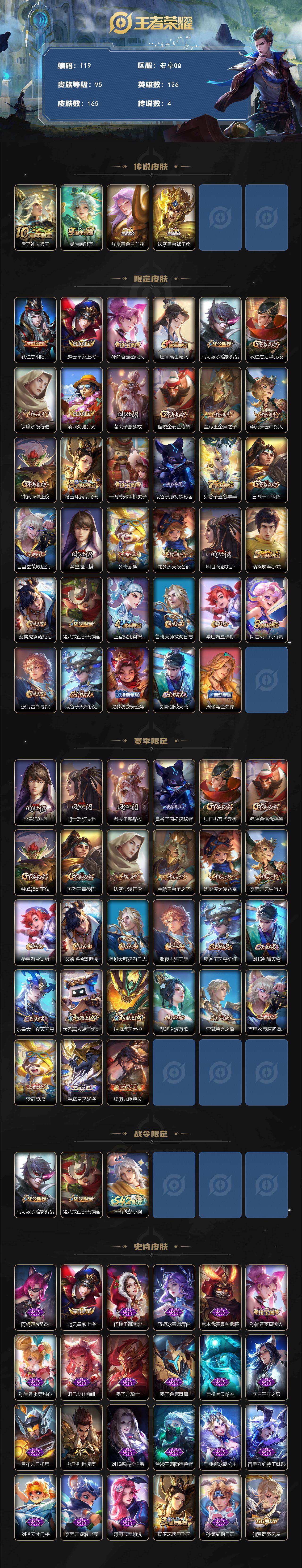 126英雄-165皮肤-【v5 4传说 2星传说未来机甲 幽冥之眼打野20段】安卓q-165皮肤-126英雄 【传说皮肤】 神树通天 鸣野蒿 黄金狮子座 黄金白羊座 【星传说】未来机甲 幽冥之眼【史诗皮肤】 星界战将 聚星闪耀 江河有灵 龙之律动 化蝶舞 顽趣 魅语 幽灵船长 女仆咖啡 鹰眼统帅 圣诞恋歌 箭羽风息 鬼剑武藏 修罗 暗隐猎兽者 千年之狐 逐浪之夏 德古拉伯爵 天才门将 末日机甲 暗影游
