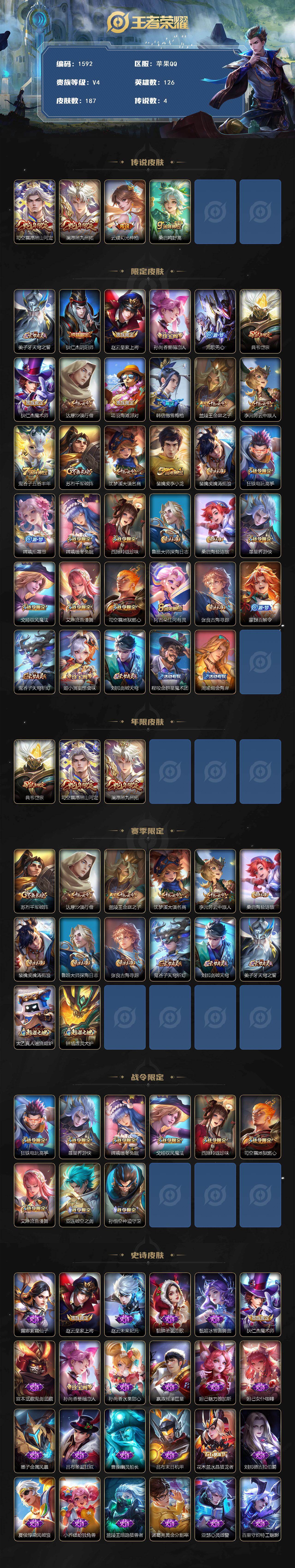 【司空震愿照山河定 澜愿照九州拓 马超神威 韩信傲雪梅呛】苹果q-v4-尊贵铂金iii段位-126英雄-187皮肤-4传说-55史诗 【英雄全皮】:司空震全皮,戈娅全皮,影全皮 【传说皮肤】:司空震愿照山河定,澜愿照九州拓,云缨幻光神呛,桑启鸣野蒿 【限定皮肤】:姜子牙天穹之誓,狄仁杰阴阳师,赵云皇家上将,孙尚香蔷薇恋人,元歌无心,典韦岱宗,狄仁杰魔术师,达摩沙漠行僧,项羽海滩派对,韩信傲雪梅呛,兰陵王金庭之子,李元芳云中旅人,鬼谷子五谷丰年,苏烈千军破阵,沈梦溪大漠名商,裴擒虎李小龙,裴擒虎擒涛扼浪,狂铁电玩高手,嫦娥拒霜思,嫦娥暖冬兔眠,西施玲珑珍味,鲁班大师探海日志,桑启海盐诗旅,暃星界游侠,戈娅驭风魔法,艾琳流音漫舞,司空震地狱燃心,阿古朵江河有灵,张良古海寻踪,蒙犽百解令,鬼谷子天穹祈灯,姬小满妄想食味,刘邦剑破天穹,程咬金群星魔术团,周瑜熔金海岸 【年限皮肤】:典韦岱宗,司空震愿照山河定,澜愿照九州拓 【赛季限定】:苏烈千军破阵,达摩沙漠行僧,兰陵王金庭之子,沈梦溪大漠名商,李元芳云中旅人,桑启海盐诗旅,裴擒虎擒涛扼浪,鲁班大师探海日志,张良古海寻踪,鬼谷子天穹祈灯,刘邦剑破天穹,姜子牙天穹之誓,太乙真人谧流熔炉,钟馗虚灵犬护 【战令限定】:狂铁电玩高手,暃星界游侠,嫦娥暖冬兔眠,戈娅驭风魔法,西施玲珑珍味,司空震地狱燃心,艾琳流音漫舞,亚连破空之剑,孙悟空神迹守卫 【史诗皮肤】:露娜紫霞仙子,赵云皇家上将,赵云未来纪元,貂蝉圣诞恋歌,甄姬冰雪圆舞曲,狄仁杰魔术师,宫本武藏鬼剑武藏,孙尚香蔷薇恋人,孙尚香水果甜心,嬴政摇滚巨星,妲己魅力维加斯,妲己女仆咖啡,墨子金属风暴,吕布圣诞狂欢,曹操幽灵船长,吕布末日机甲,花木兰水晶猎龙者,刘邦德古拉伯爵,夏侯惇乘风破浪,小乔缤纷独角兽,兰陵王暗隐猎兽者,诸葛亮黄金分割率,亚瑟心灵战警,百里守约特工魅影,铠曙光守护者,刘禅天才门将,李元芳逐浪之夏,程咬金功夫厨神,阿轲节奏热浪,伽罗箭羽风息,狄仁杰鹰眼统帅,典韦岱宗,大乔白蛇,马超神威,裴擒虎李小龙,嫦娥拒霜思,韩信傲雪梅呛,夏洛特永昼,澜赏金猎手,狂铁电玩高手,鬼谷子五谷丰年,元歌无心,暃星界游侠,刘禅电玩爆裂旋风,戈娅驭风魔法,司空震地狱燃心,阿古朵江河有灵,蒙犽百解令,姬小满妄想食味,亚连破空之剑,阿轲化蝶舞,狂铁龙之律动,扁鹊灵蛊蚀心,后羿石田雨龙,黄忠百相守梦 【其他皮肤】:项羽海滩派对,韩信教廷特使,韩信街头霸王,露娜哥特玫瑰,达摩大发明家,赵云忍炎影,程咬金星际陆战队,白起白色死神,牛魔西部大镖客,扁鹊化身博士,扁鹊救世之瞳,宫本武藏未来纪元,安琪拉玩偶对对碰,孙膑天使之翼,妲己少女阿狸,典韦黄金武士,亚瑟死亡骑士,达摩拳王,花木兰兔女郎,刘备万事如意,宫本武藏万象初新,后羿阿尔法小队,狄仁杰阴阳师,关羽龙腾万里,墨子进击墨子号,钟无艳海滩丽影,狂铁命运角斗场,老夫子功夫老勺,孙尚香沉稳之力,诸葛亮掌控之力,李白敏锐之力,鬼谷子幻乐之宴,明世隐虹云星官,小乔丁香结,吕布野性能量,沈梦溪鲨炮海盗猫,哪吒次元突破,狂铁特工战影,张良缤纷绘卷,鲁班大师乓乓大师,苏烈千军破阵,达摩沙漠行僧,刘邦虎啸剑宗,兰陵王金庭之子,沈梦溪大漠名商,蒙恬蔚蓝守将,李元芳云中旅人,戈娅危途狂花,刘备潮玩造梦师,桑启海盐诗旅,嫦娥暖冬兔眠,海月幻泉雾影,猪八戒潮玩探月行,牛魔牛运亨通,赵怀真太极少年,裴擒虎擒涛扼浪,太乙真人劲辣红锅,莱西奥西部游侠,鲁班大师探海日志,西施玲珑珍味,李元芳妄想特派,艾琳流音漫舞,张良古海寻踪,亚连破局者,鬼谷子天穹祈灯,嫦娥漠中幻影,廉颇功夫炙烤,刘邦剑破天穹,程咬金群星魔术团,姜子牙天穹之誓,周瑜熔金海岸,孙悟空神迹守卫,盘古敬我三分,干将莫邪雾都夜雨,苍苍林狼骑,太乙真人谧流熔炉,典韦铁骨偃魂,影魅影绮裳,西施雪境奇遇,姜子牙星梦巡礼,明世隐景韶洛都,戈娅玫蓝誓约,刘备浪漫序章,钟馗虚灵犬护,苏烈春野闲踪,张良灵野札记,阿古朵布丁狗之约,露娜命运加冕,姬小满小满鸭,白起死霸装,莱西奥踏浪烽翎,哪吒罗小黑战记,鲁班七号福禄兄弟,鲁班七号木偶奇遇记,露娜绯红之刃,貂蝉异域舞娘,老夫子潮流仙人,曹操超能战警,小乔万圣前夜,孙悟空西部大镖客,李白范海辛,钟馗地府判官,蔡文姬蔷薇王座,雅典娜战争女神,马可波罗激情绿茵,杨戬埃及法老,哪吒三太子,铠龙域领主,百里守约绝影神呛,梦奇美梦成真,公孙离花间舞,裴擒虎街头旋风,弈星踏雪寻梅,元歌午夜歌剧院,孙策海之征途,司马懿魇语军师,伽罗花见巫女,李信灼热之刃,上官婉儿修竹墨客,猪八戒年年有余,云中君荷鲁斯之眼,曜归虚梦演,马超幸存者,西施归虚梦演,镜冰刃幻境,澜孤猎,司空震启蛰,暃碧珀绯影 【内测皮肤】:孙尚香蔷薇恋人,狂铁特工战影 【营地id】:1807189635