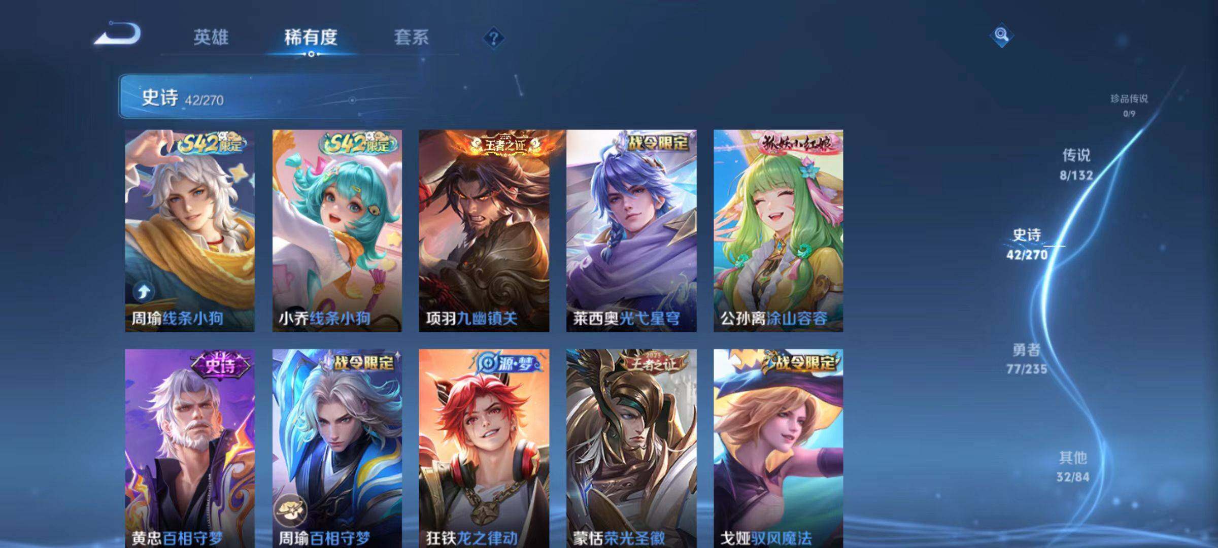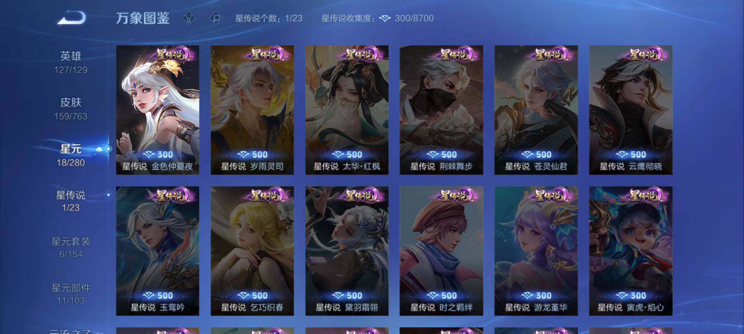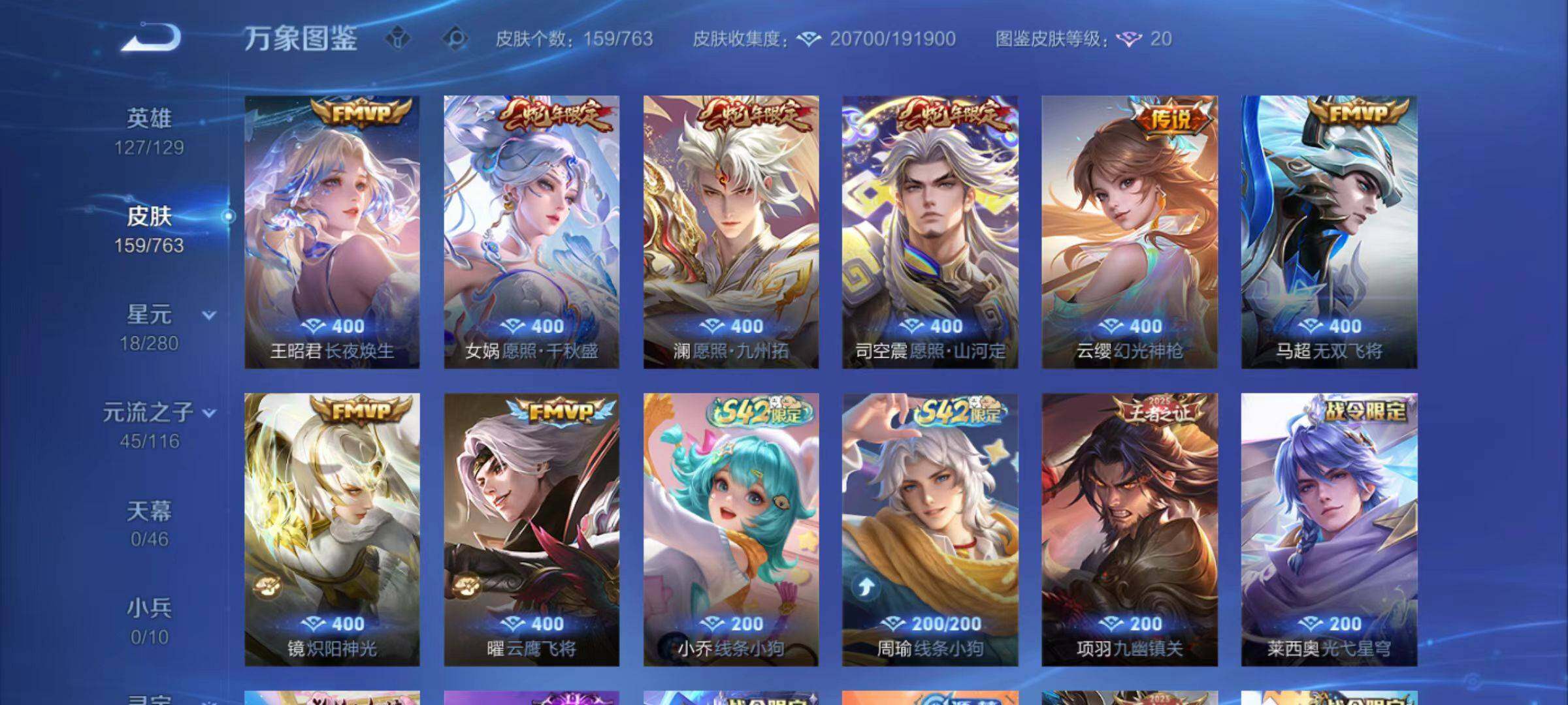 127英雄-159皮肤-安卓q-159皮肤-8传说-41史诗 【英雄全皮】:空空儿全皮 【传说皮肤】:王昭君长夜焕生,司空震愿照山河定,女娲愿照千秋盛,澜愿照九州拓,云缨幻光神呛,马超无双飞将,镜炽阳神光,曜云鹰飞将 【限定皮肤】:姜子牙天穹之誓,狄仁杰阴阳师,赵云皇家上将,高渐离玩趣恶龙,元歌云间偶戏,马可波罗山海玄木吟