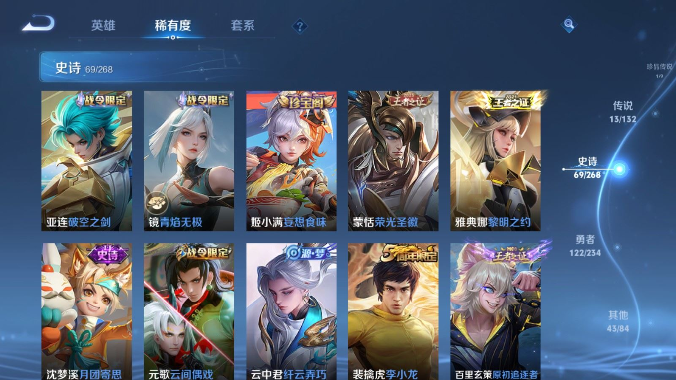 127英雄-249皮肤-127英雄-249皮肤v7-1典藏1珍品传说13传说 2星传说 幽冥之眼 金色仲夏夜【典藏】 杀手不太冷 【珍品传说】 怪盗基德 【传说】 愿照山河定 鸣野蒿 白虎志 武圣 永曜之星 炽阳神光 云鹰飞将 猫影幻舞 久胜战神 黄金狮子座 黄金射手座 仲夏夜之梦 地狱之眼 【热门】万灵启世 涂山容容