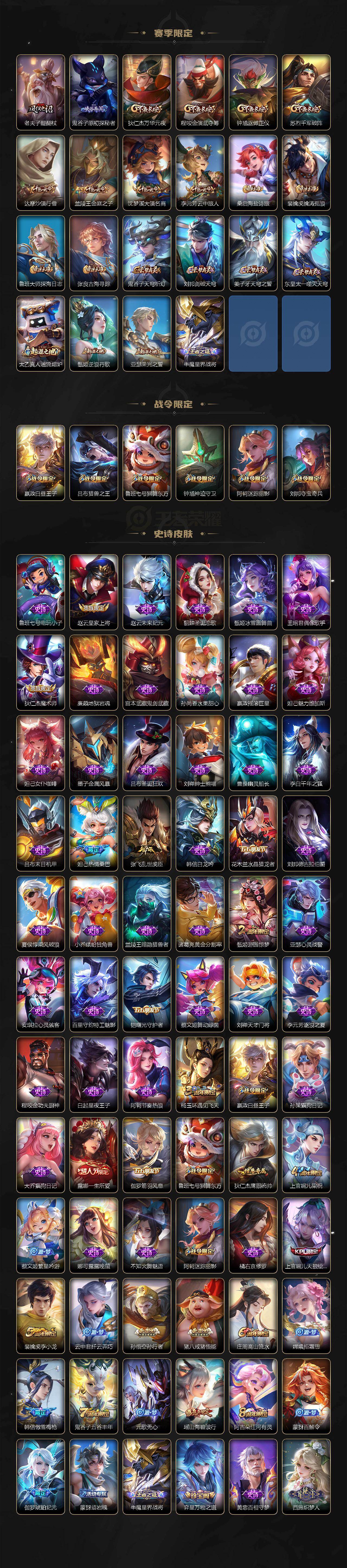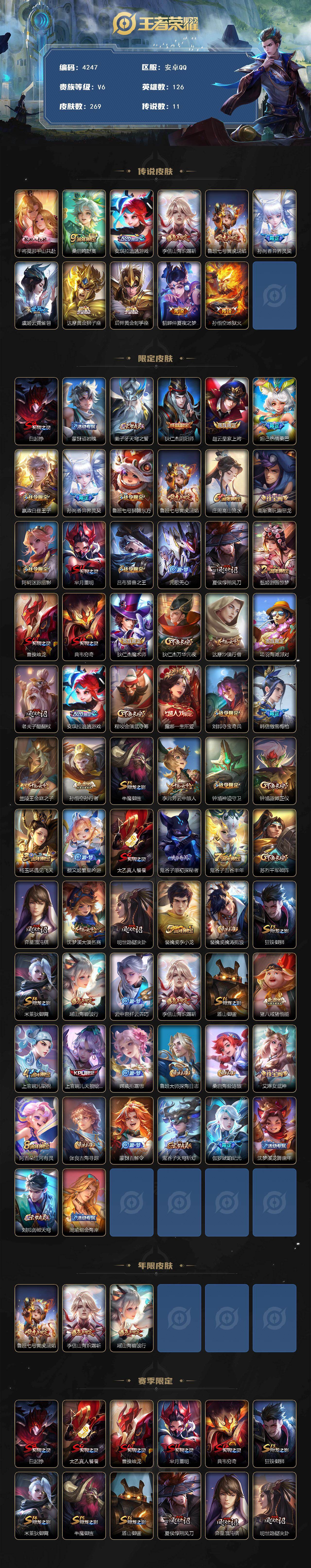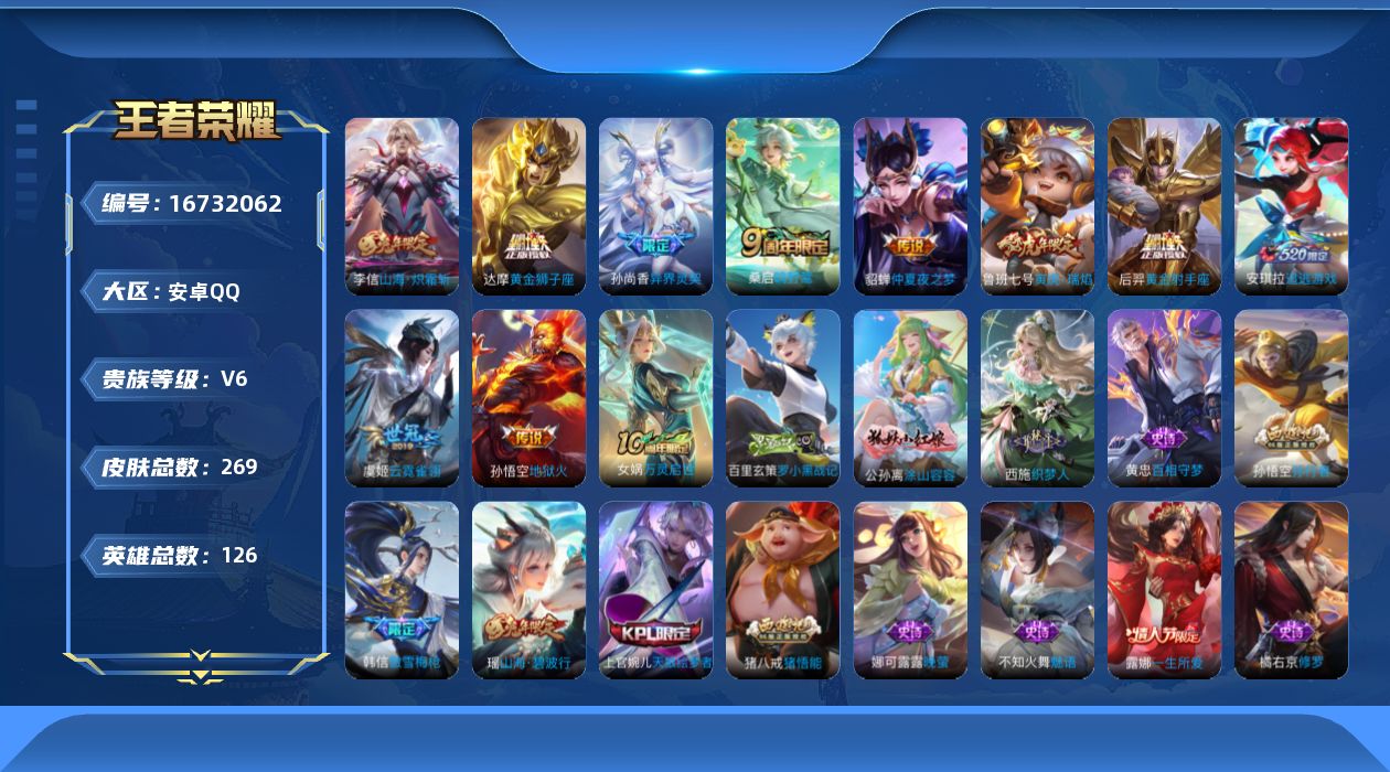 [16732062]安卓q-v6-最强王者段位-126英雄-269皮肤-11传说-75史诗 【传说皮肤】:干将莫邪千山共赴,桑启鸣野蒿,安琪拉追逃游戏,李信山海炽霜斩,鲁班七号寅虎瑞焰,孙尚香异界灵契,虞姬云霓雀翎,达摩黄金狮子座,后羿黄金射手座,貂蝉仲夏夜之梦,孙悟空地狱火 【限定皮肤】:白起狰,蒙犽顽岩魄,姜子牙天穹之誓,狄仁杰阴阳师,赵云皇家上将,妲己热情桑巴,嬴政白昼王子,孙尚香异界灵契,鲁班七号狮舞东方,鲁班七号寅虎瑞焰,庄周高山流水,高渐离玩趣恶龙,阿轲迷踪丽影,芈月重明,吕布猎兽之王,元歌无心,夏侯惇朔风刀,甄姬游园惊梦,曹操烛龙,典韦穷奇,狄仁杰魔术师,狄仁杰万华元夜,达摩沙漠行僧,项羽海滩派对,老夫子醍醐杖,安琪拉追逃游戏,程咬金演武夺筹,露娜一生所爱,刘邦夺宝奇兵,韩信傲雪梅呛,兰陵王金庭之子,孙悟空孙行者,牛魔御旌,李元芳云中旅人,钟馗神迹守卫,钟馗驱傩正仪,杨玉环遇见飞天,蔡文姬繁星吟游,太乙真人饕餮,鬼谷子原初探秘者,鬼谷子五谷丰年,苏烈千军破阵,弈星混沌棋,沈梦溪大漠名商,明世隐疑决卦,裴擒虎李小龙,裴擒虎擒涛扼浪,狂铁御狮,米莱狄御霄,瑶山海碧波行,云中君纤云弄巧,李信山海炽霜斩,盾山御銮,猪八戒猪悟能,上官婉儿梁祝,上官婉儿天狼绘梦者,嫦娥拒霜思,鲁班大师探海日志,桑启海盐诗旅,艾琳女武神,阿古朵江河有灵,张良古海寻踪,蒙犽百解令,鬼谷子天穹祈灯,伽罗琥珀纪元,沈梦溪龙舞盛年,刘邦剑破天穹,周瑜熔金海岸 【年限皮肤】:鲁班七号寅虎瑞焰,李信山海炽霜斩,瑶山海碧波行 【赛季限定】:白起狰,太乙真人饕餮,曹操烛龙,芈月重明,典韦穷奇,狂铁御狮,米莱狄御霄,牛魔御旌,盾山御銮,夏侯惇朔风刀,弈星混沌棋,明世隐疑决卦,老夫子醍醐杖,鬼谷子原初探秘者,狄仁杰万华元夜,程咬金演武夺筹,钟馗驱傩正仪,苏烈千军破阵,达摩沙漠行僧,兰陵王金庭之子,沈梦溪大漠名商,李元芳云中旅人,桑启海盐诗旅,裴擒虎擒涛扼浪,鲁班大师探海日志,张良古海寻踪,鬼谷子天穹祈灯,刘邦剑破天穹,姜子牙天穹之誓,东皇太一噬灭天穹,太乙真人谧流熔炉,甄姬逆浪荇歌,亚瑟荣光之誓,牛魔星界战将 【战令限定】:嬴政白昼王子,吕布猎兽之王,鲁班七号狮舞东方,钟馗神迹守卫,阿轲迷踪丽影,刘邦夺宝奇兵 【史诗皮肤】:鲁班七号电玩小子,赵云皇家上将,赵云未来纪元,貂蝉圣诞恋歌,甄姬冰雪圆舞曲,王昭君偶像歌手,狄仁