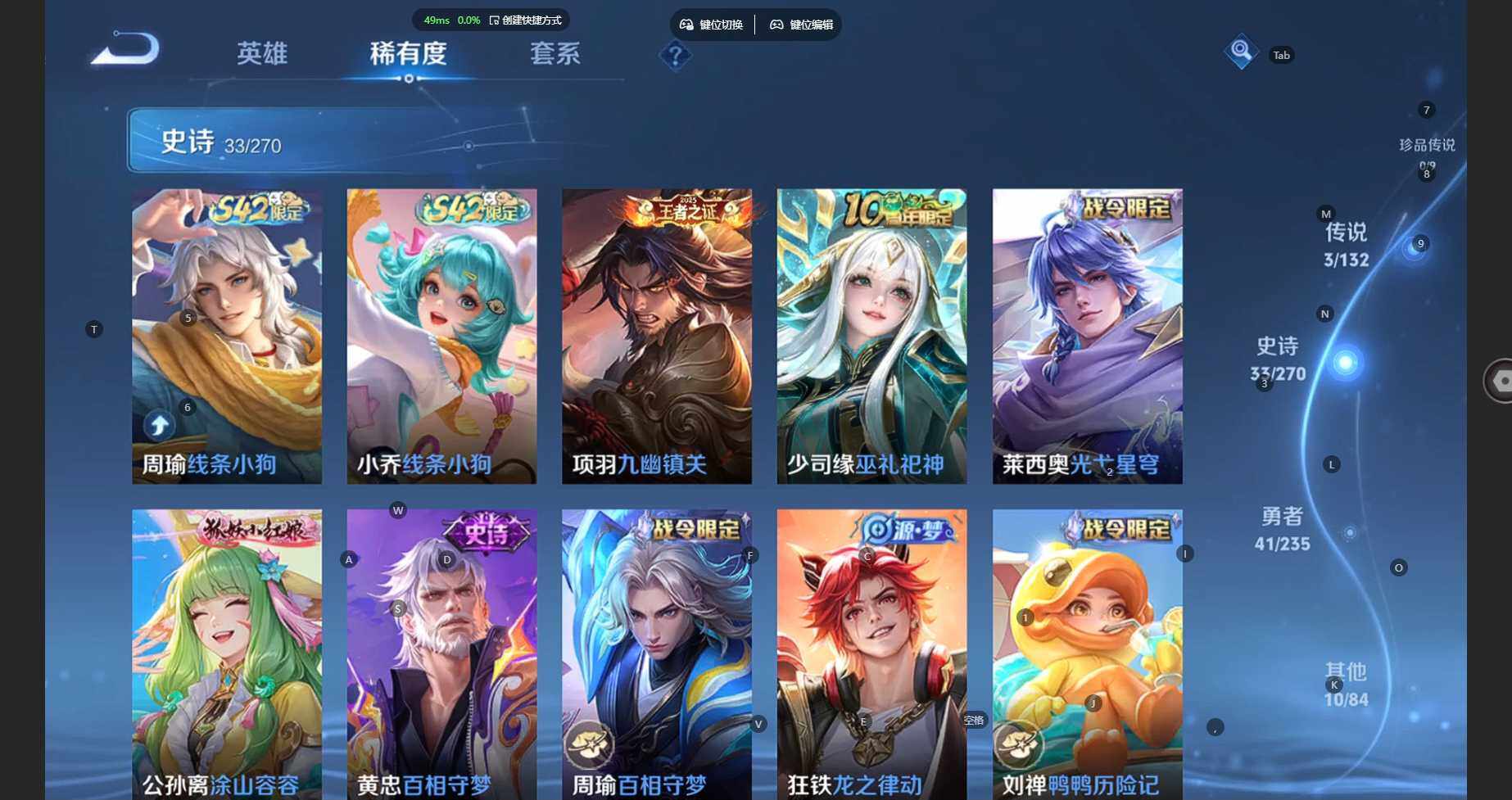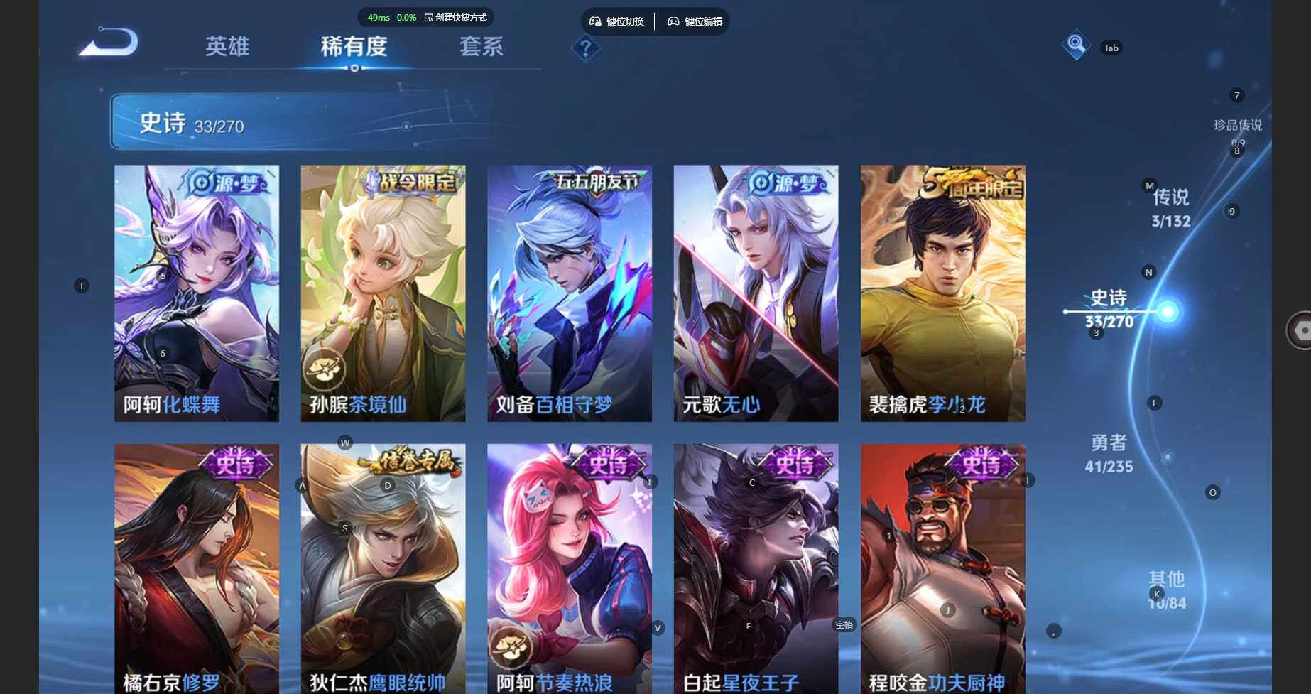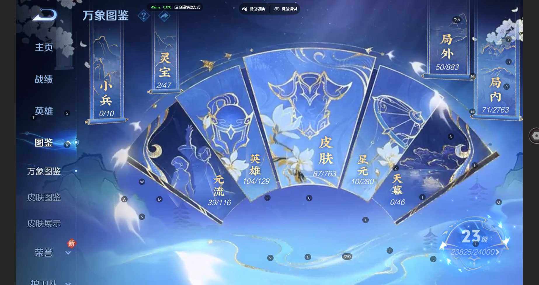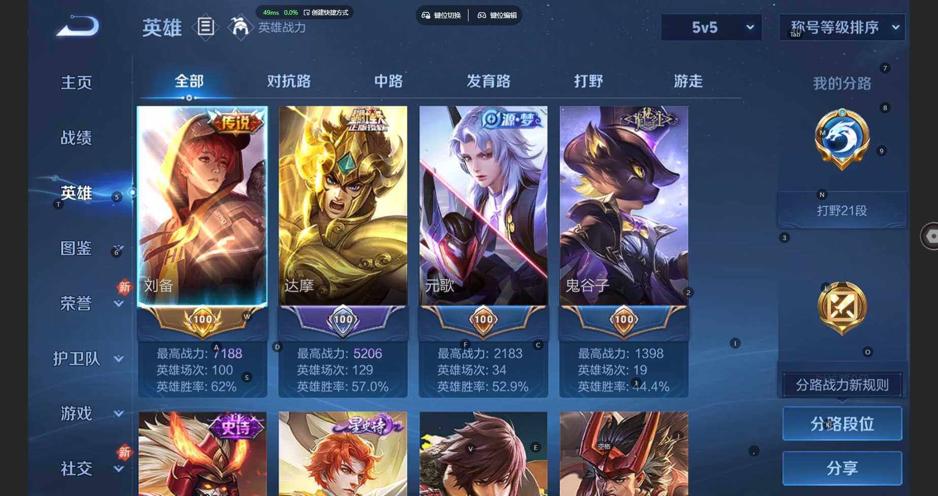 104英雄-87皮肤-安卓wx-v6-至尊星耀iv段位-104英雄-87皮肤-3传说-32史诗 【传说皮肤】:云缨幻光神呛,刘备时之恋人,达摩黄金狮子座 【限定皮肤】:狄仁杰阴阳师,赵云皇家上将,元歌无心,狄仁杰魔术师,项羽海滩派对,刘备百相守梦,裴擒虎李小龙,李元芳蔬乡物语 【赛季限定】:太乙真人谧流熔炉,钟馗虚灵犬护,甄姬逆浪荇歌,亚瑟荣光之誓,项羽九幽镇关 【战令限定】:李元芳蔬乡物语,孙膑茶境仙,马超访茗客