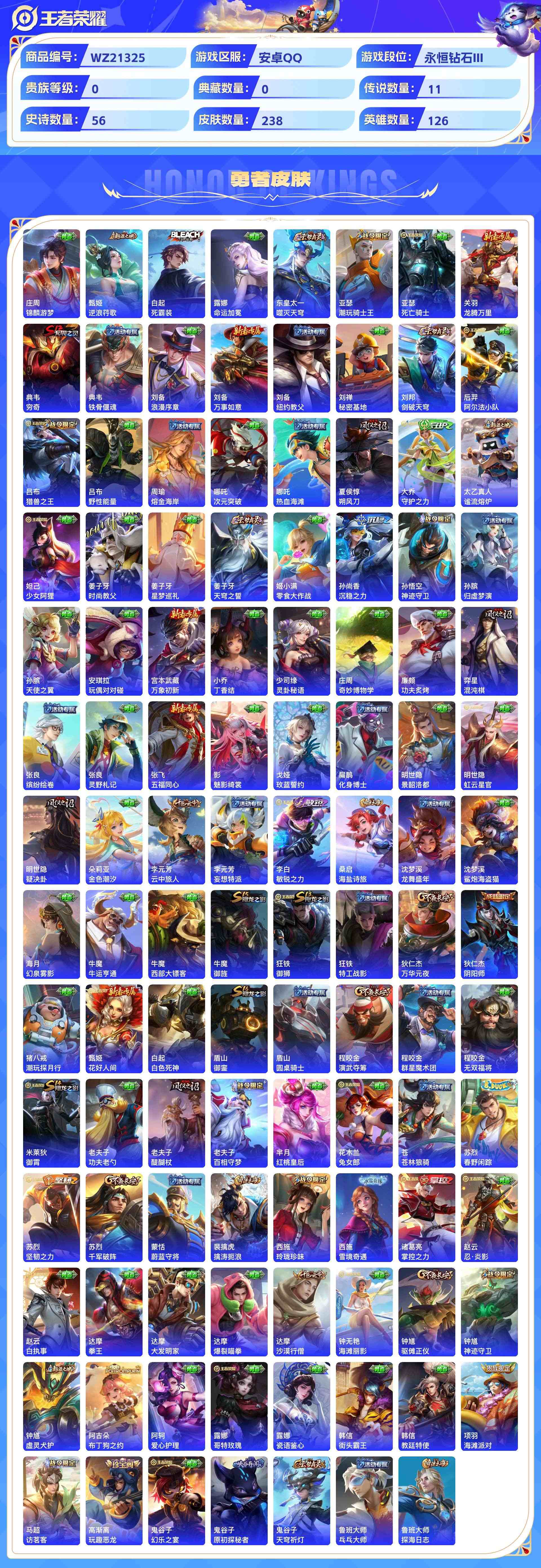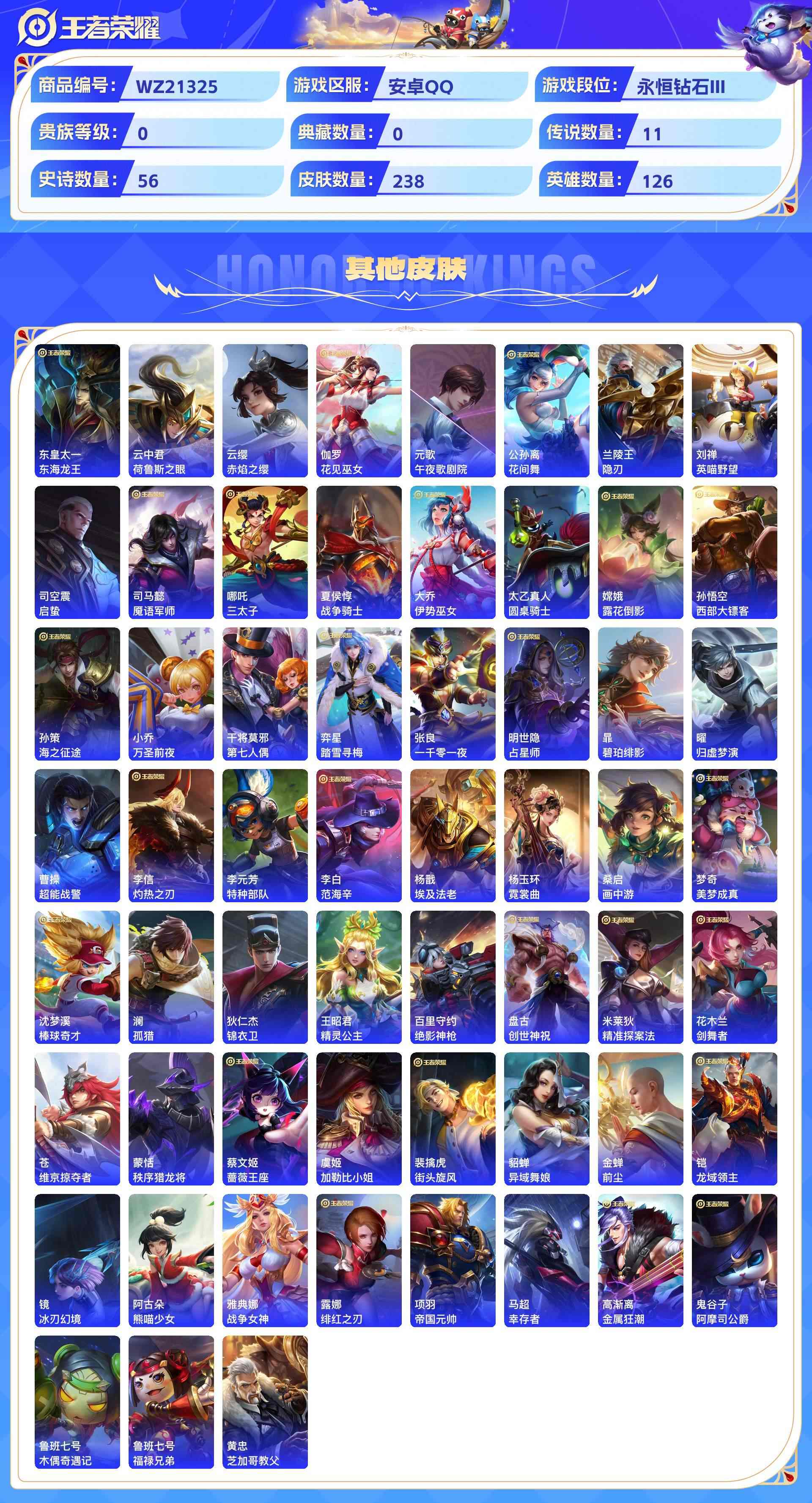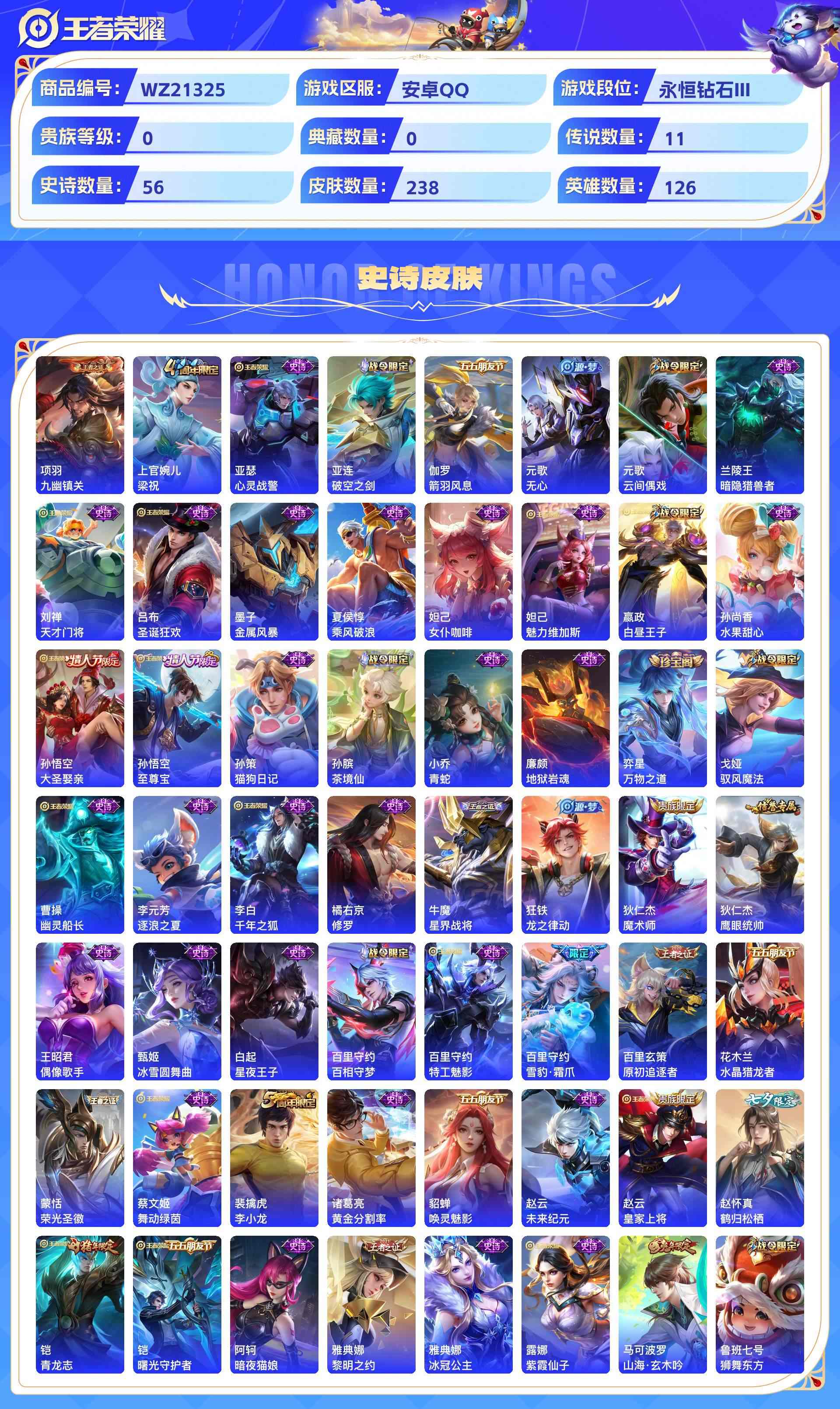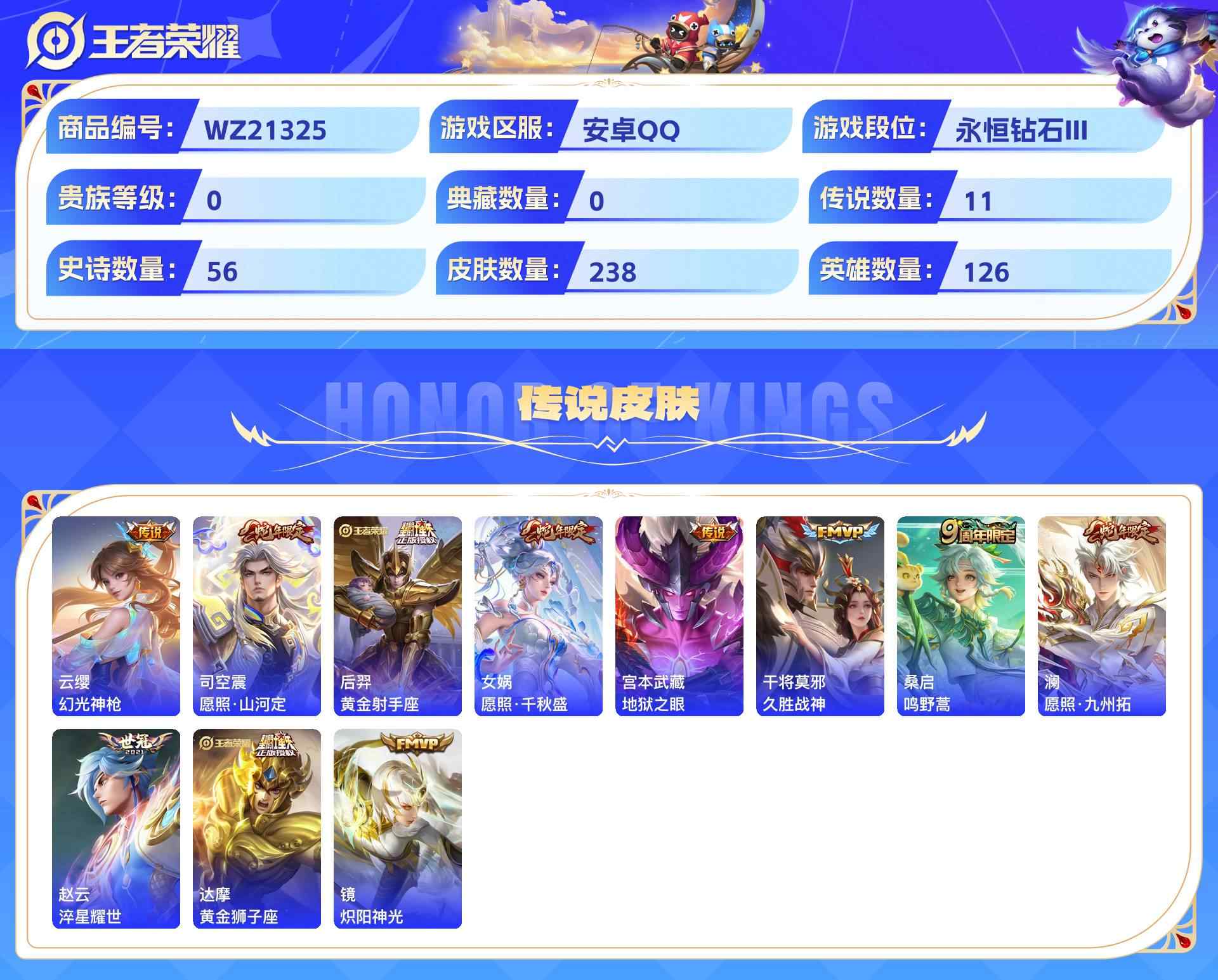 wz21325|小帅珍品多传说入坑小号安卓qq 238皮 1珍品传说 11传说 56史诗【珍品传说】器灵·落星盏【传说皮肤】幻光神呛愿照·山河定黄金射手座愿照·千秋盛地狱之眼久胜战神鸣野蒿愿照·九州拓淬星耀世黄金狮子座