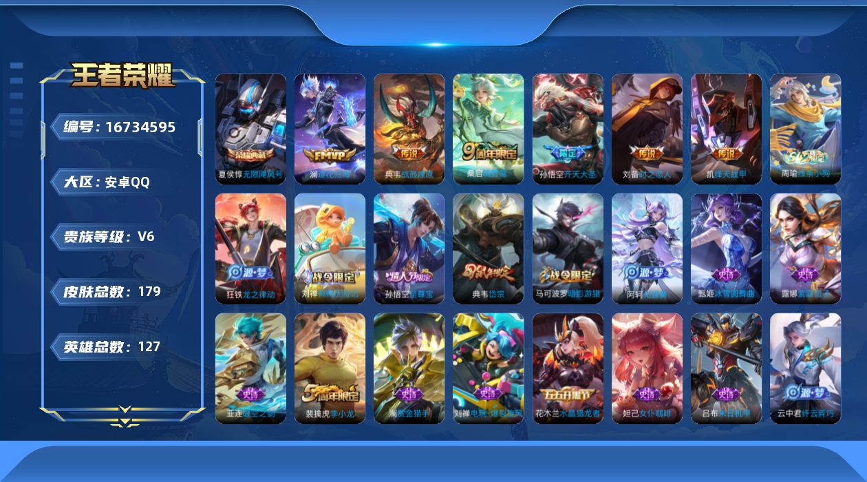 [16734595]v6 1典藏 6传说 127英雄 179皮肤 可修改实名 男号 【英雄全皮】敖隐全皮影全皮大禹全皮 【稀有英雄】敖隐小龙人大司命韩信韩跳跳夏洛特夏师傅艾琳橘右京橘子娜可露露鸟人不知火舞赵云金蝉唐僧戈娅 【荣耀水晶】无限飓风号高达 【传说皮】典韦战鼓燎原时之恋人-刘备电焊工绛天战甲鸡嘴战神澜逐花归海 【珍宝阁皮】蔷薇恋人 【赛季/战令皮】噬灭天穹s37古海寻踪s33海盐诗旅s30擒涛扼浪s31探海日志s32剑破天穹s35天穹祈灯s34青焰无极苍威无极天穹之誓s36驱傩正仪s24千军破阵s25暗影游猎游乐娃子沙漠行僧s26金庭之子s27 【史诗皮】星界战将星界特工破空之剑蔬乡物语鲁班七号茶境仙线条小狗-周瑜化蝶舞龙之律动鸭鸭历险记-刘禅紫霞仙子特工魅影电玩·爆裂旋风偶像歌手末日机甲-吕布猫狗日记-孙策节奏热浪女仆咖啡摇滚巨星水果甜心天才门将星夜王子功夫厨神德古拉伯爵暗隐猎兽者鬼剑武藏心灵战警纤云弄巧乘风破浪逐浪之夏水晶猎龙者圣诞狂欢鹰眼统帅魅力维加斯赏金猎手未来纪元-赵云 【限定皮】逐霄战戟鸣野蒿至尊宝齐天大圣岱宗典韦年限李小龙 【普通皮】谧流熔炉敬我三分怪诞之夜雾都夜雨魅影绮裳访茗客苍林狼骑雪境奇遇-西施金福满堂星梦巡礼劲辣红锅大乔绒语心约景韶洛都漠中幻影街头霸王功夫炙烤蔬乡物语李元芳熔金海岸经纬探寻者程咬金群星魔术团暗都幽影刘备异域游侠铁骨偃魂玫蓝誓约浪漫序章鹤鸣心笺潮玩士官长虚灵犬护鸭鸭历险记-沈梦溪春野闲踪秘证寻踪布丁狗之约命运加冕灵野札记小满鸭死霸装潮玩造梦师太极少年西部游侠妄想特派鬼谷子天穹祈灯s34威尼斯狂欢完美运算暖冬絮语程咬金时空谍影蔚蓝守将龙腾万里归虚梦演-曜海滩丽影海滩派对皇家上将魔术师沉稳之力敏锐之力炽热元素使乓乓大师黄金武士天使之翼功夫老勺哥特玫瑰鲨炮海盗猫教廷特使阴阳师汉昭烈帝死亡骑士少女阿狸忍·炎影秘密基地爱心护理野性能量冰雪圆舞曲铁甲之心未来纪元-宫本武藏