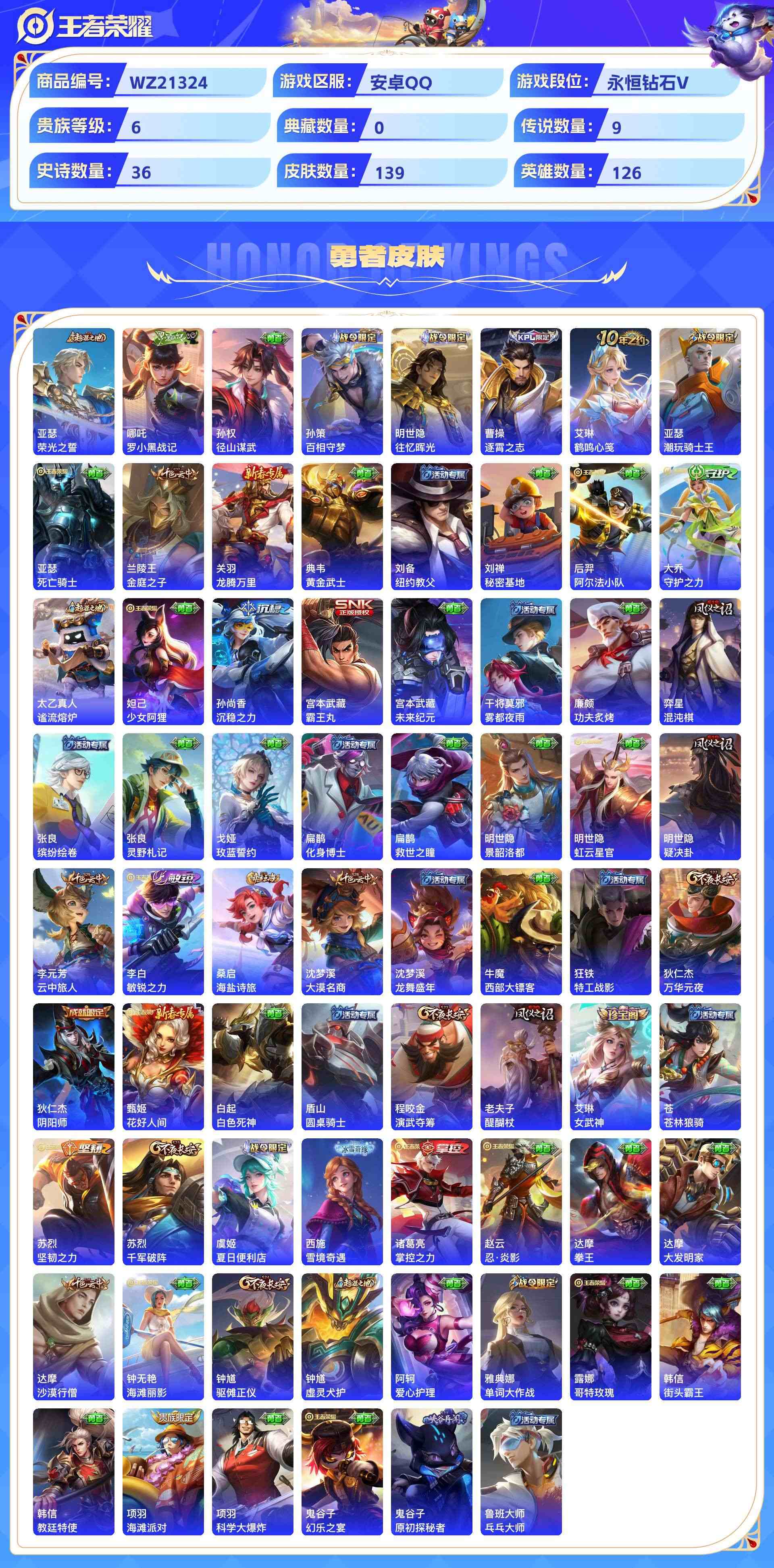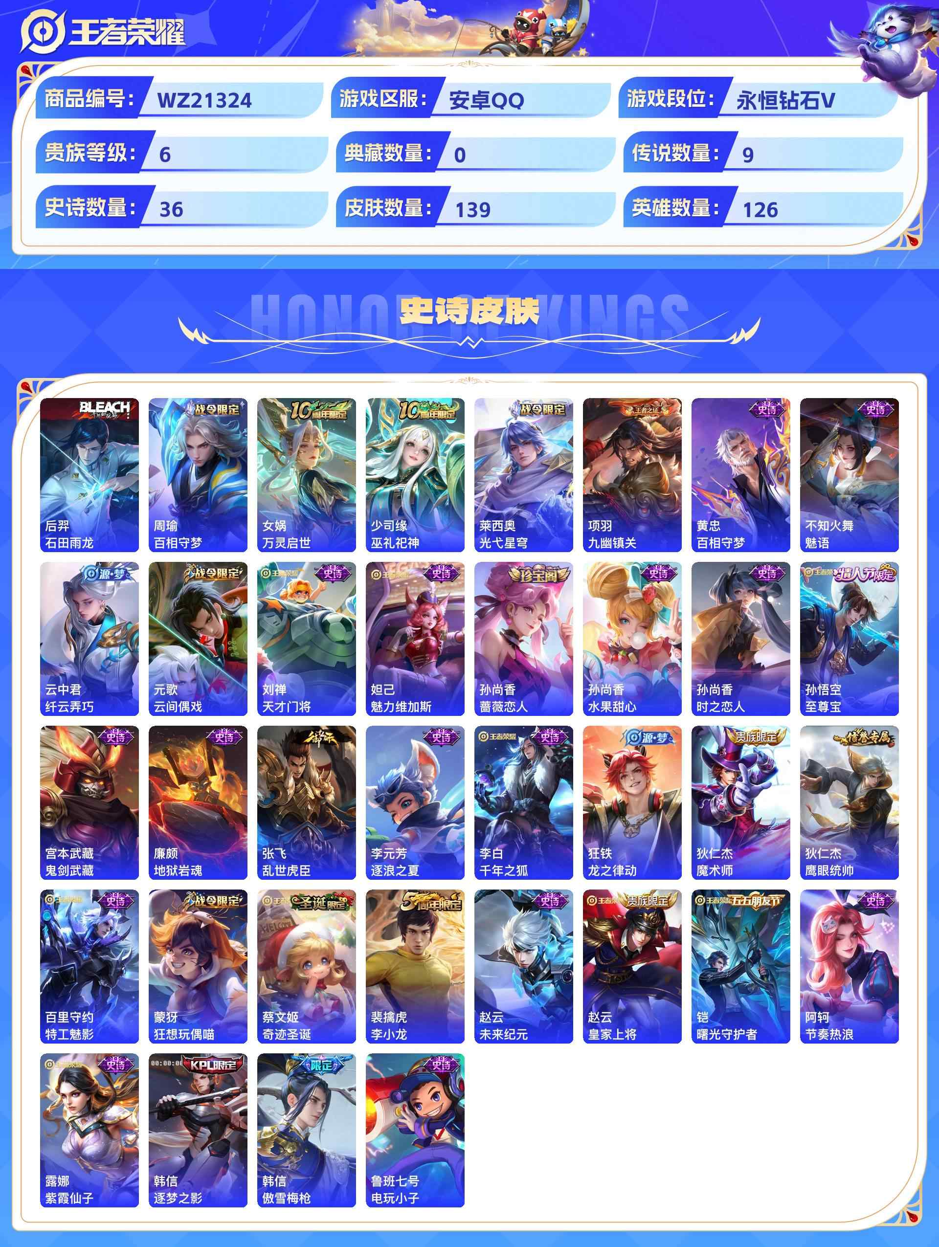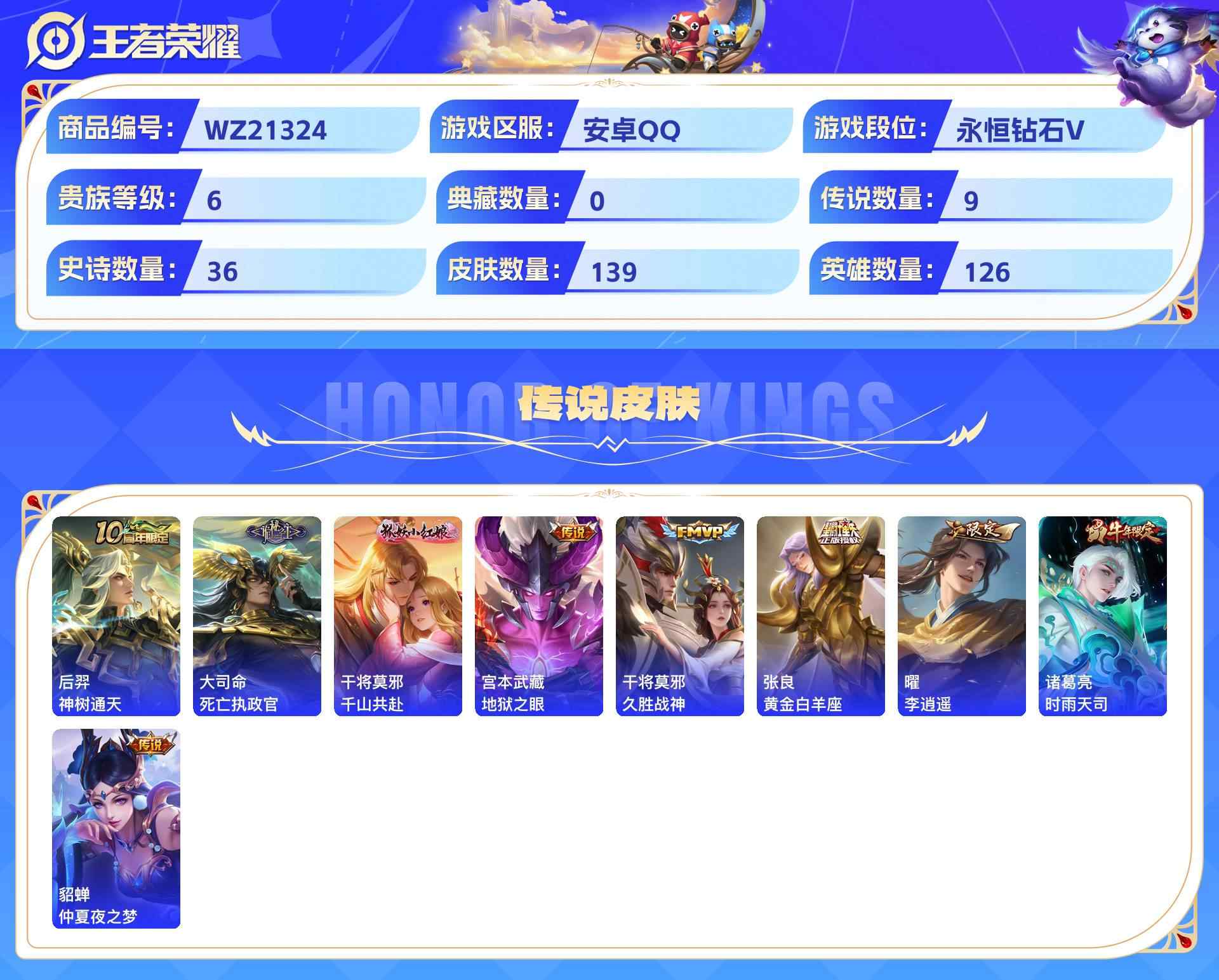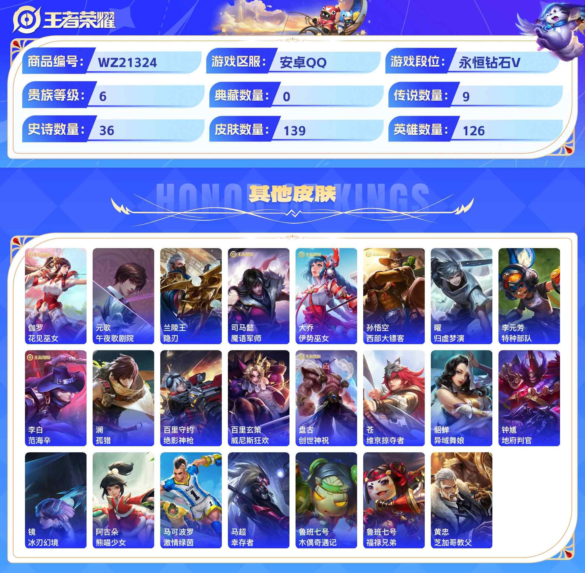 wz21324|可二次精品无双多传说小号(神罪)安卓qq 139皮 贵族6级 1无双 9传说 36史诗【无双限定】神罪【传说皮肤】神树通天死亡执政官千山共赴地狱之眼久胜战神黄金白羊座李 时雨天司仲夏夜之梦【史诗皮肤】石田雨龙百
