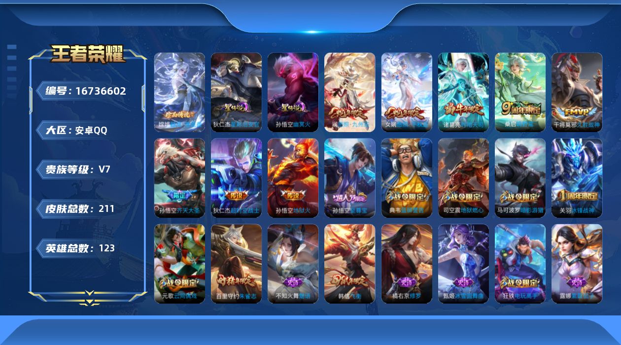 [16736602]v7-211皮肤-1珍品传说-8传说-62史诗,有1水晶 xl2034 【珍品传说】:嫦娥器灵落星盏 【内测皮肤】:嬴政优雅恋人,高渐离玩趣恶龙,狂铁特工战影 【传说皮肤】:狄仁杰超时空战士,孙悟空地狱火,干将莫邪久胜战神,诸葛亮时雨天司,孙悟空齐天大圣,桑启鸣野蒿,澜愿照九州拓,女娲愿照千秋盛 【限定皮肤】:姜子牙天穹之誓,狄仁杰阴阳师,赵云皇家上将,墨子神迹守卫,嬴政优雅恋人,鲁班七号狮舞东方,高渐离玩趣恶龙,阿轲迷踪丽影,芈月重明,芈月幻夜卜梦,周瑜赤莲之焰,元歌云间偶戏,夏侯惇朔风刀,曹操烛龙,典韦穷奇,典韦蓝屏警告,马可波罗暗影游猎,狄仁杰魔术师,狄仁杰万华元夜,达摩星际陆战队,达摩沙漠行僧,项羽海滩派对,老夫子醍醐杖,老夫子航海奇遇记,关羽冰锋战神,程咬金演武夺筹,刘邦夺宝奇兵,韩信飞衡,王昭君午后时光,兰陵王驯魔猎人,兰陵王金庭之子,亚瑟潮玩骑士王,孙悟空至尊宝,孙悟空齐天大圣,牛魔御旌,李元芳云中旅人,钟馗神迹守卫,钟馗驱傩正仪,女娲朔望之晖,雅典娜单词大作战,雅典娜黎明之约,蔡文姬繁星吟游,鬼谷子原初探秘者,鬼谷子五谷丰年,诸葛亮时雨天司,黄忠火炮绅士,苏烈千军破阵,百里玄策原初追逐者,百里守约朱雀志,弈星混沌棋,梦奇顽趣,沈梦溪大漠名商,明世隐疑决卦,裴擒虎李小龙,裴擒虎擒涛扼浪,狂铁御狮,狂铁电玩高手,米莱狄御霄,米莱狄胡桃异想国,云中君纤云弄巧,伽罗天狼溯光者,盾山御銮,猪八戒西部大镖客,上官婉儿梁祝,蒙犽狂想玩偶喵,鲁班大师探海日志,桑启海盐诗旅,艾琳流音漫舞,司空震地狱燃心,阿古朵江河有灵,张良古海寻踪,蒙恬荣光圣徽,鬼谷子天穹祈灯,刘邦剑破天穹 【年限皮肤】:百里守约朱雀志,诸葛亮时雨天司,韩信飞衡 【赛季限定】:芈月重明,夏侯惇朔风刀,曹操烛龙,典韦穷奇,狄仁杰万华元夜,达摩沙漠行僧,老夫子醍醐杖,程咬金演武夺筹,兰陵王金庭之子,张良古海寻踪,牛魔御旌,李元芳云中旅人,钟馗驱傩正仪,雅典娜黎明之约,鬼谷子原初探秘者,苏烈千军破阵,百里玄策原初追逐者,弈星混沌棋,梦奇顽趣,沈梦溪大漠名商,明世隐疑决卦,裴擒虎擒涛扼浪,狂铁御狮,米莱狄御霄,盾山御銮,鲁班大师探海日志,桑启海盐诗旅,鬼谷子天穹祈灯,蒙恬荣光圣徽,刘邦剑破天穹,姜子牙天穹之誓 【战令限定】:墨子神迹守卫,鲁班七号狮舞东方,阿轲迷踪丽影,芈月幻夜卜梦,周瑜赤莲之焰,元歌云间