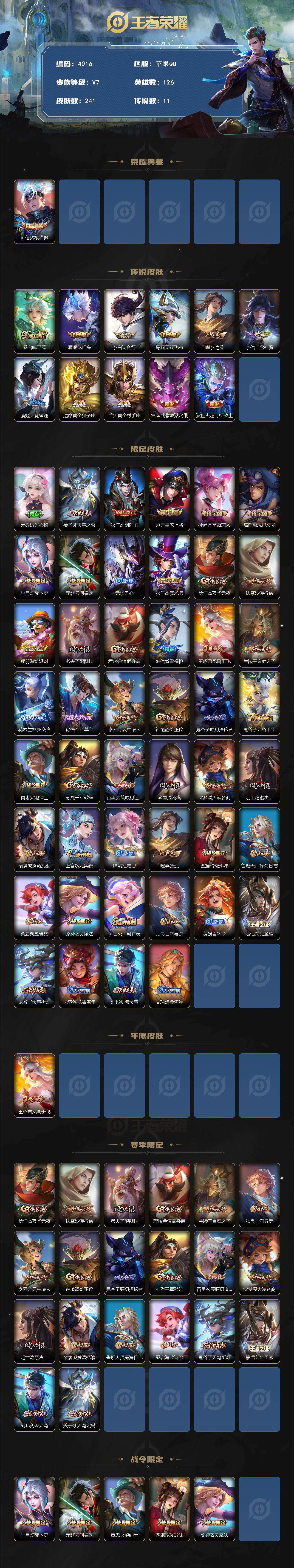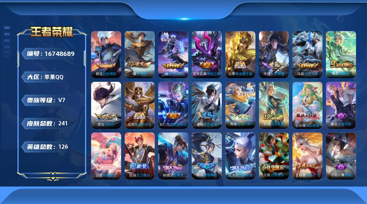[16748689]苹果q-v6-至尊星耀iii段位-126英雄-241皮肤-1典藏皮肤-11传说-65史诗 【英雄全皮】:孙权全皮,空空儿全皮,影全皮 【荣耀典藏】:韩信弑呛猎影 【传说皮肤】:桑启鸣野蒿,澜逐花归海,李白诗剑行,马超无双飞将,曜李 ,李信一念神魔,虞姬云霓雀翎,达摩黄金狮子座,后羿黄金射手座,宫本武藏地狱之眼,狄仁杰超时空战士 【限定皮肤】:大乔绒语心约,姜子牙天穹之誓,狄仁杰阴阳师,赵云皇家上将,孙尚香蔷薇恋人,高渐离玩趣恶龙,芈月幻夜卜梦,元歌云间偶戏,元歌无心,狄仁杰魔术师,狄仁杰万华元夜,达摩沙漠行僧,项羽海滩派对,老夫子醍醐杖,程咬金演武夺筹,韩信傲雪梅呛,王昭君凤凰于飞,兰陵王金庭之子,花木兰默契交锋,孙悟空至尊宝,李元芳云中旅人,钟馗驱傩正仪,鬼谷子原初探秘者,鬼谷子五谷丰年,黄忠火炮绅士,苏烈千军破阵,百里玄策原初追逐者,弈星混沌棋,沈梦溪大漠名商,明世隐疑决卦,裴擒虎擒涛扼浪,上官婉儿梁祝,嫦娥拒霜思,曜李 ,西施玲珑珍味,鲁班大师探海日志,桑启海盐诗旅,戈娅驭风魔法,阿古朵江河有灵,张良古海寻踪,蒙犽百解令,蒙恬荣光圣徽,鬼谷子天穹祈灯,沈梦溪龙舞盛年,刘邦剑破天穹,周瑜熔金海岸 【年限皮肤】:王昭君凤凰于飞 【赛季限定】:狄仁杰万华元夜,达摩沙漠行僧,老夫子醍醐杖,程咬金演武夺筹,兰陵王金庭之子,张良古海寻踪,李元芳云中旅人,钟馗驱傩正仪,鬼谷子原初探秘者,苏烈千军破阵,百里玄策原初追逐者,弈星混沌棋,沈梦溪大漠名商,明世隐疑决卦,裴擒虎擒涛扼浪,鲁班大师探海日志,桑启海盐诗旅,鬼谷子天穹祈灯,蒙恬荣光圣徽,刘邦剑破天穹,姜子牙天穹之誓 【战令限定】:芈月幻夜卜梦,元歌云间偶戏,黄忠火炮绅士,西施玲珑珍味,戈娅驭风魔法 【史诗皮肤】:露娜紫霞仙子,阿轲暗夜猫娘,赵云皇家上将,赵云未来纪元,貂蝉圣诞恋歌,甄姬冰雪圆舞曲,王昭君偶像歌手,狄仁杰魔术师,廉颇地狱岩魂,宫本武藏鬼剑武藏,孙尚香蔷薇恋人,孙尚香水果甜心,嬴政暗夜贵公子,嬴政摇滚巨星,妲己魅力维加斯,妲己女仆咖啡,墨子金属风暴,吕布圣诞狂欢,刘禅绅士熊喵,曹操幽灵船长,李白千年之狐,王昭君凤凰于飞,孙悟空至尊宝,花木兰水晶猎龙者,刘邦德古拉伯爵,夏侯惇乘风破浪,兰陵王暗隐猎兽者,诸葛亮黄金分割率,亚瑟心灵战警,百里守约特工魅影,刘禅天才门将,程咬金功夫厨神,白起星夜王子,阿轲节奏
